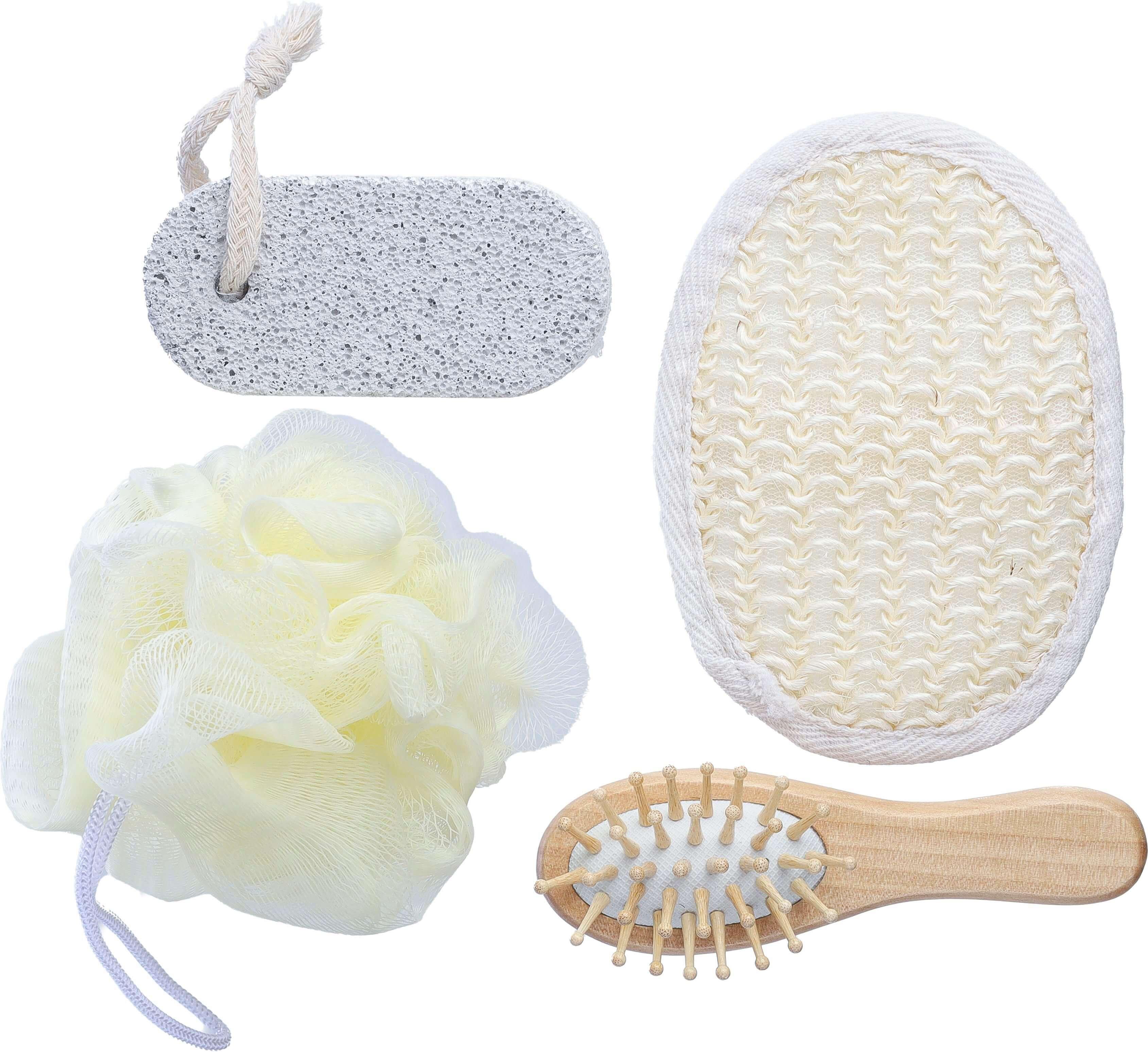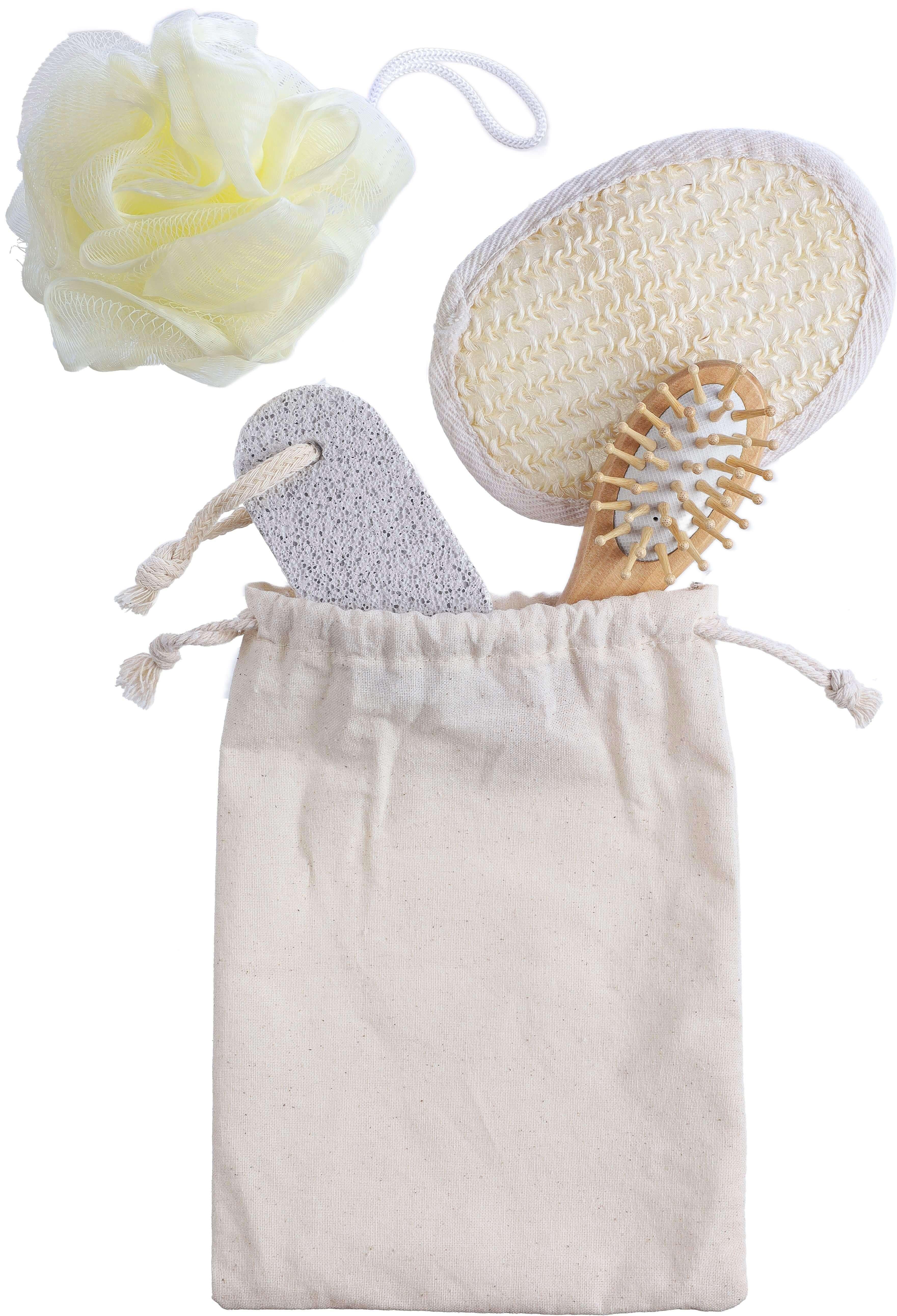 Conjunto de banho em algodão com 4 peças: escova de bambu, esponja macia, esponja esfoliante e pedra-pomes (no saco). Apresentado individualmente numa bolsa de algodão.