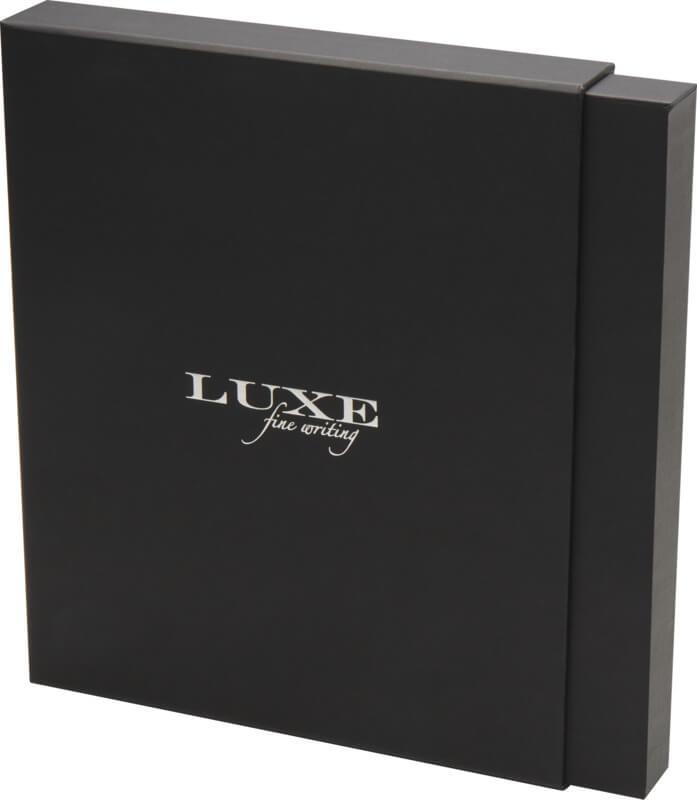 O conjunto “Legato” é uma combinação elegante de um caderno A5 e uma caneta rollerball. A caneta tem um corpo superior de latão reciclado com certificação RCS com acabamento cromado prateado, um corpo inferior com um acabamento colorido em spray, acessórios de metal cromado prateado e um logótipo “LUXE” no anel central. Cor da tinta: Azul. Comprimento de escrita: 400 metros. Tamanho do bico: 0,7 mm. Recarga extra em cor preta incluída. O caderno contém 80 folhas de papel pautado de cor creme de 80 g/m², uma capa de plástico reciclado com aparência de couro, um fecho elástico, um marcador de fita e um bolso estilo acordeão. Acessório de metal cromado prateado no fecho elástico. Entregue numa caixa de presente de cartão.