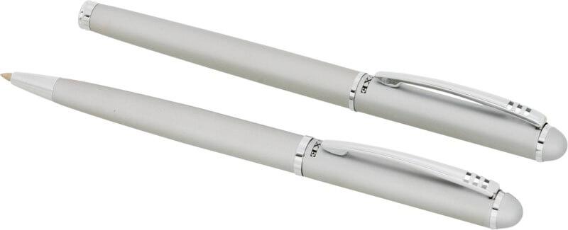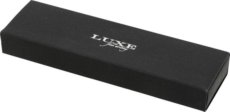 Conjunto com caneta esferográfica de torcer de design exclusivo e caneta rollerball com tampa. Disponível em Preto Brilhante, Prateado Fosco e Azul Fosco. Embalado numa embalagem de oferta “LUXE” (17 x 5,5 x 3 cm).