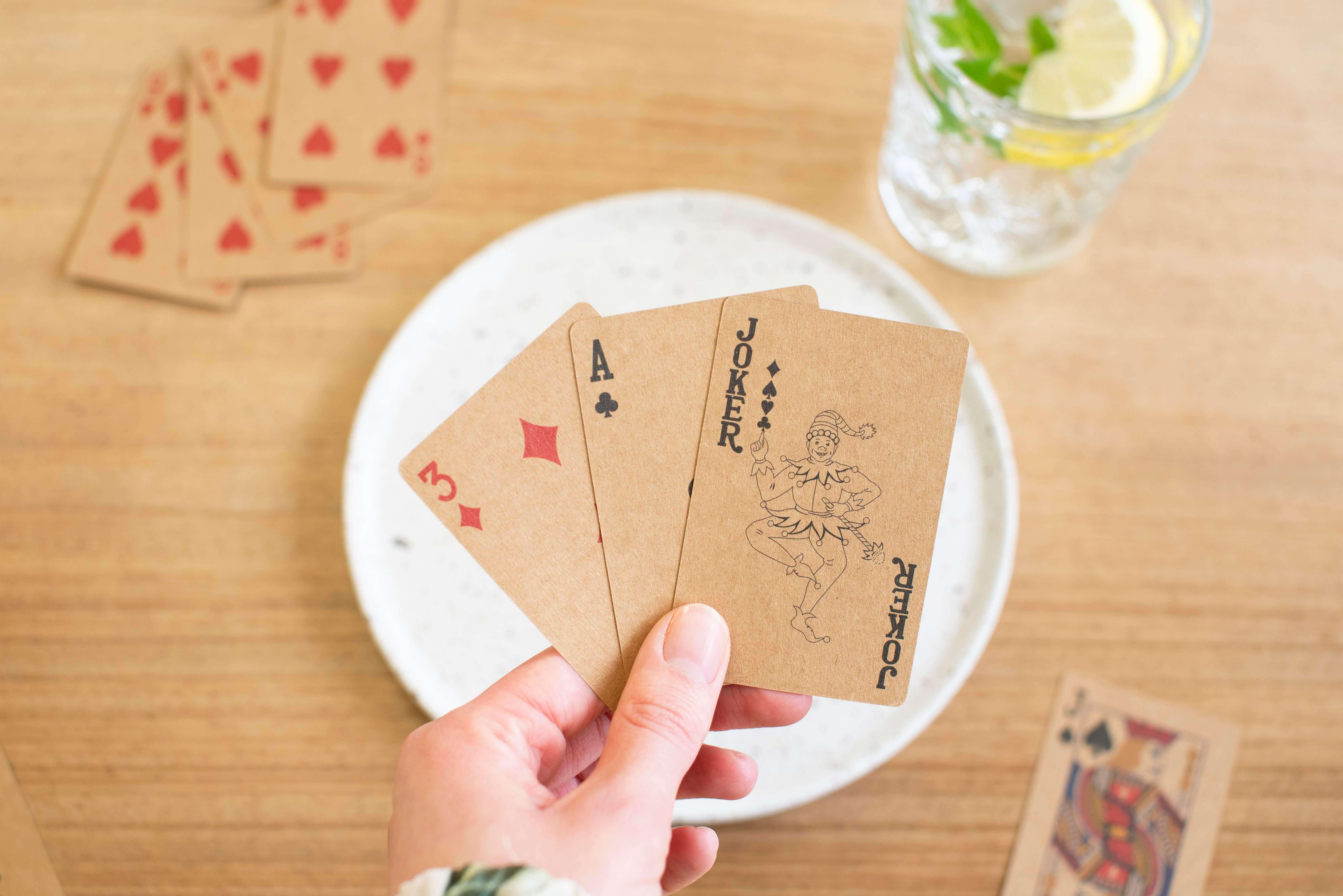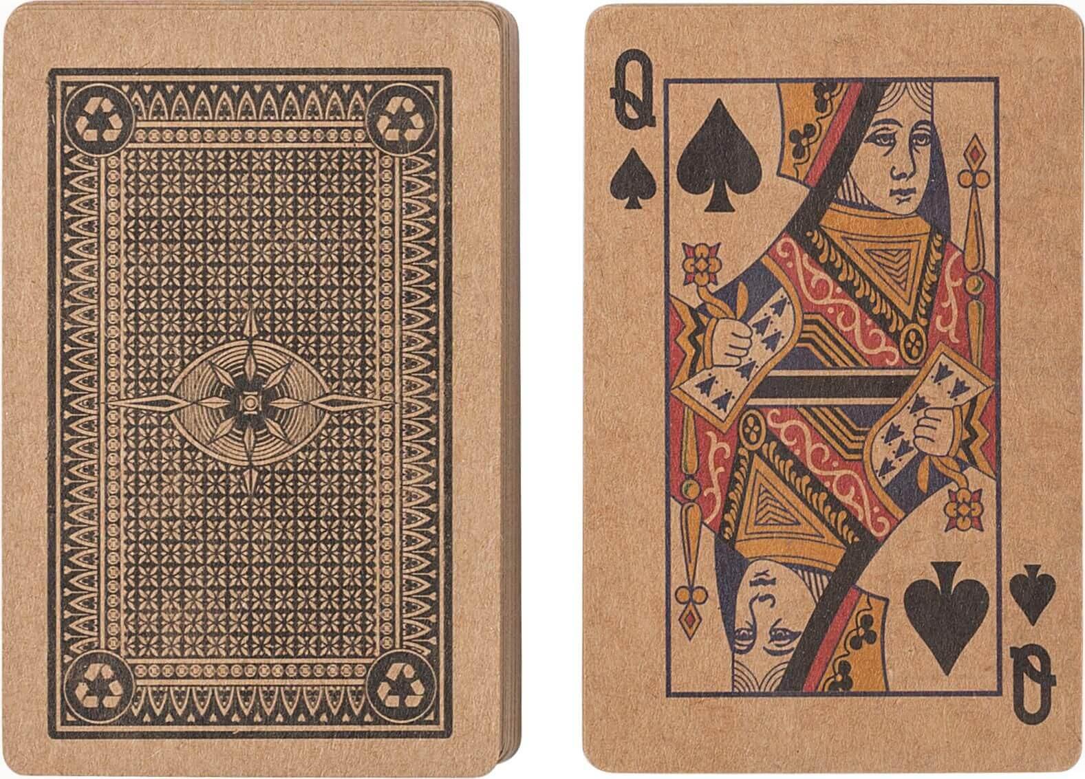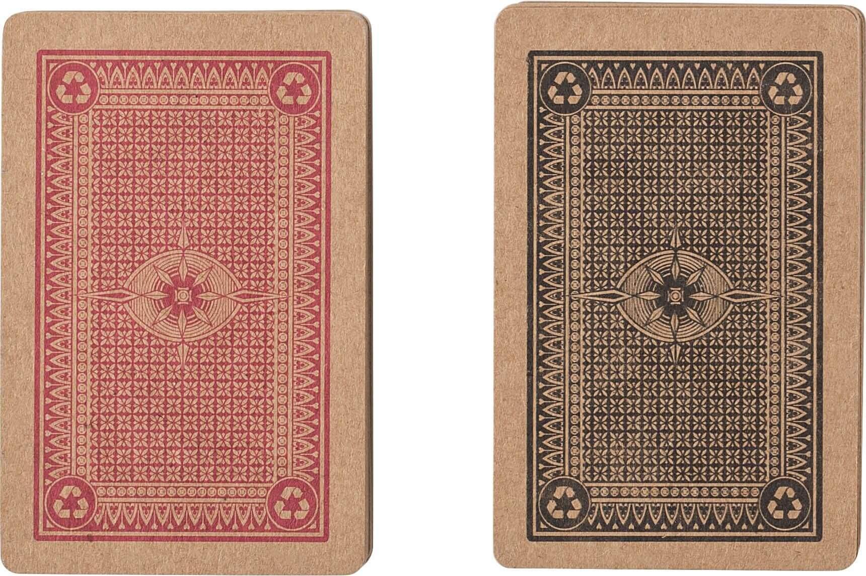 Baralhos de cartas em cartão reciclado, conjunto de dois. 54 cartas cada conjunto (52 cartas + 2 jóqueres). Apresentados por baralho numa caixa de papel kraft e totalmente numa caixa de papel kraft sólido.