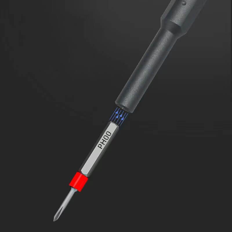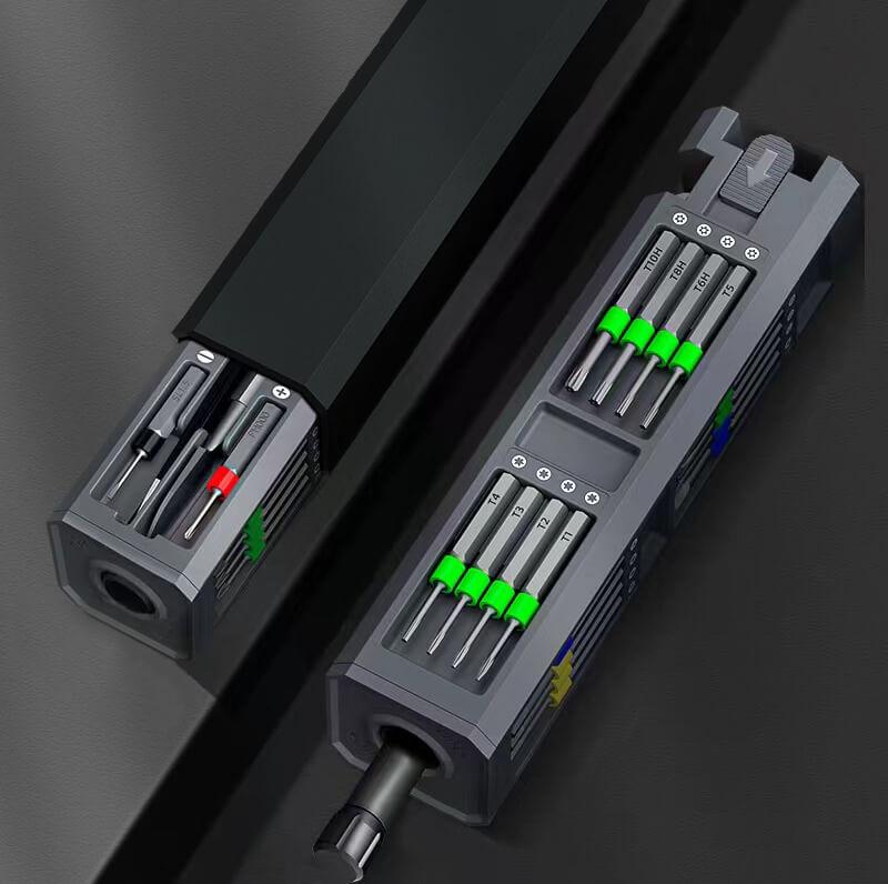 Kit de chave de parafusos de precisão de 30 peças com 28 pontas e dois acessórios. A caixa de alumínio oxidado (15 x 3,6 x 3,6 cm) pode ser personalizada com um logótipo gravado. A caixa compacta torna fácil manter tudo num só lugar. A chave de parafusos manual é perfeita para reparar qualquer dispositivo pequeno e, graças à sua forma, é fácil de usar e manusear. Possui uma grande variedade de pontas, tornando-a universal para muitos tipos de atividades de bricolage. Cada tipo de ponta é marcado com uma cor diferente para ser facilmente identificado. As pontas são atraídas magneticamente para a chave de parafusos. O kit também vem com um par de pinças para colher pequenos objetos e um pé de cabra para levantar e abrir caixas. Embalado numa caixa de presente (17 x 55 x 43,5 cm) com fecho magnético. Inclui 3 anos de garantia.