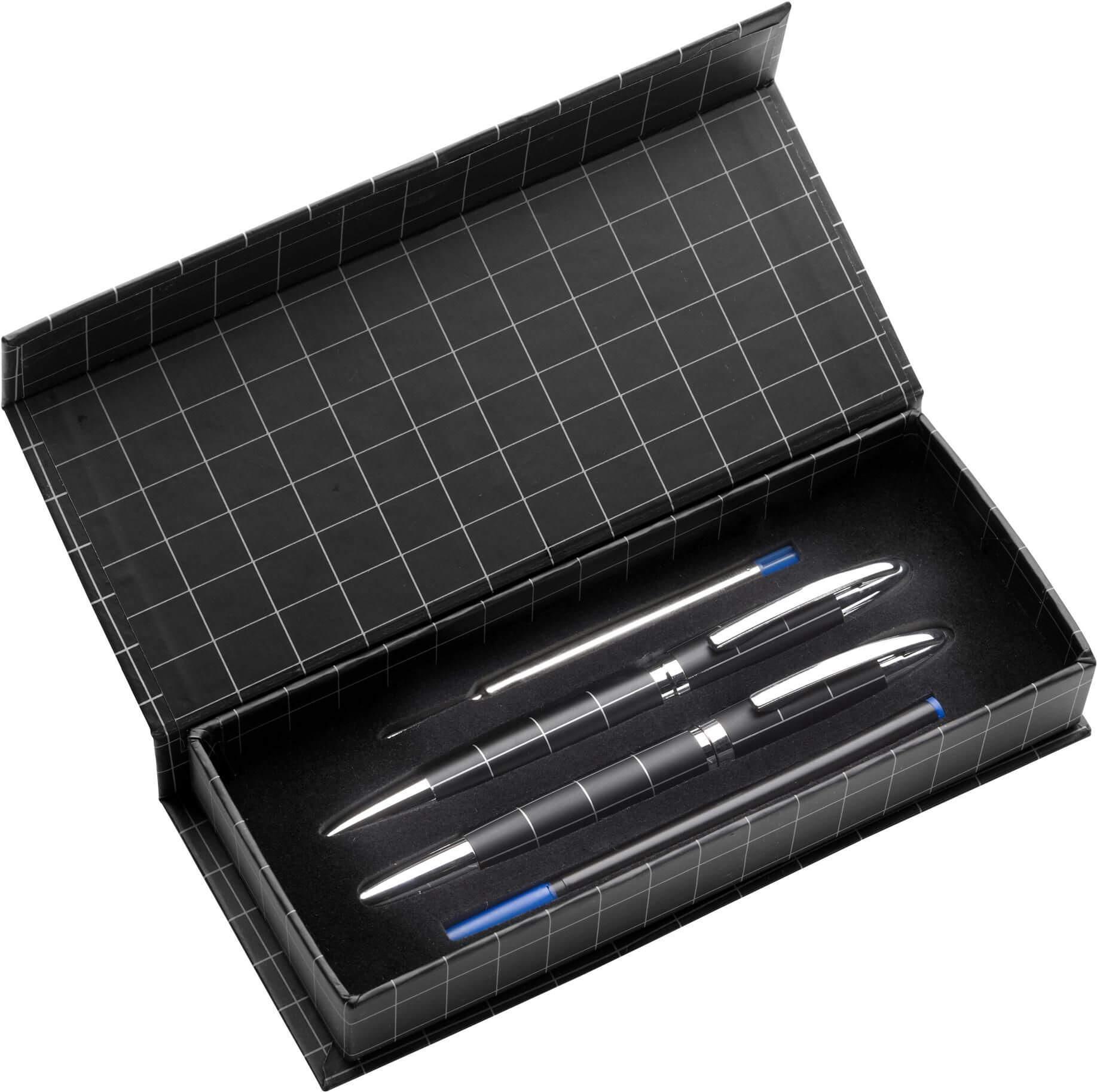 Conjunto de esferográfica com mecanismo giratório e roller de metal lacado, apresentado em estojo de oferta com fecho de íman. Escrita azul.