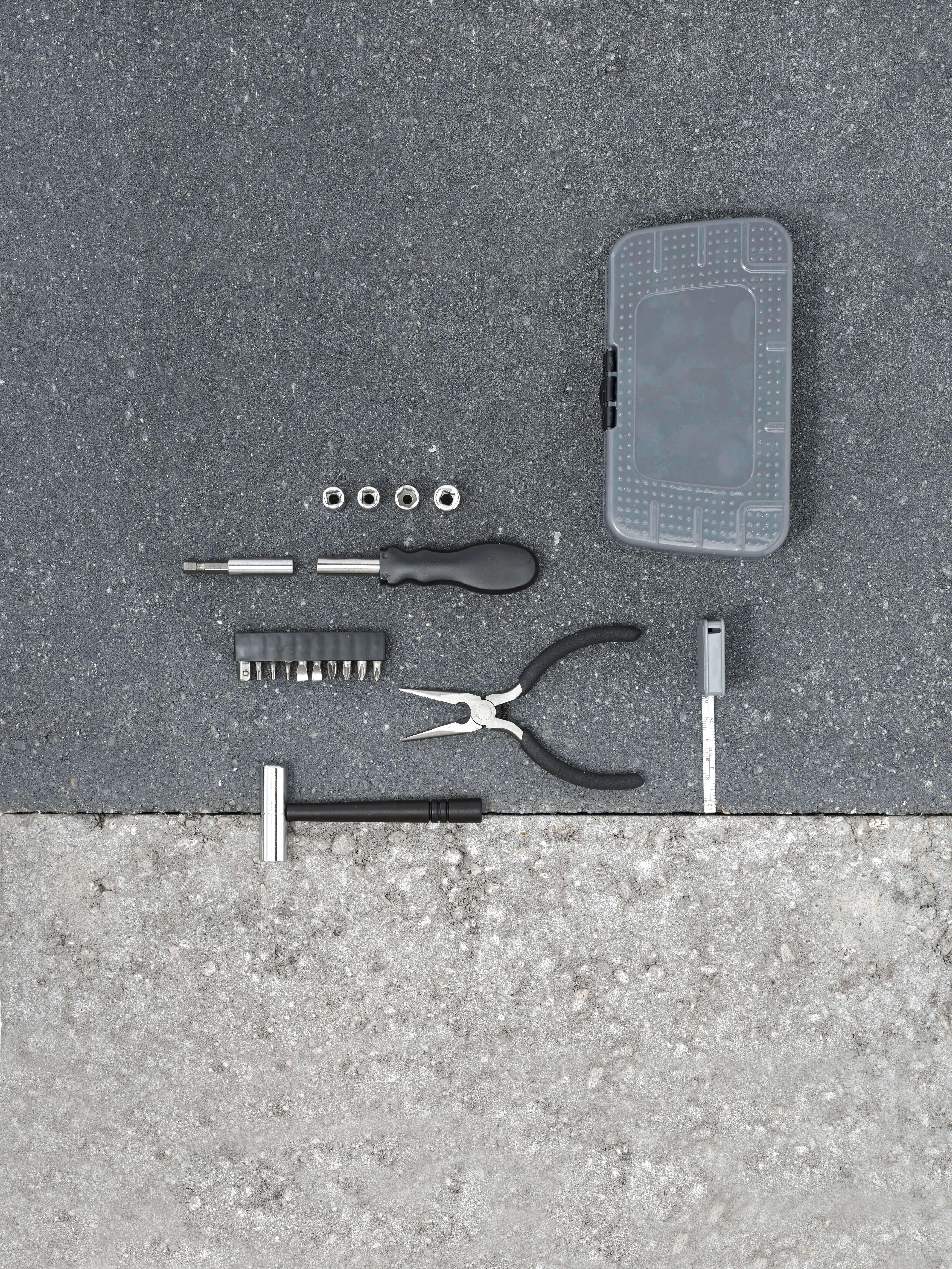 Conjunto de ferramentas de aluminio e metal, com 19 peças. Apresentado em caixa de plástico.
