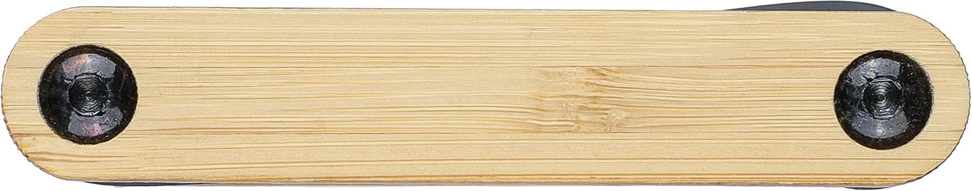 Conjunto de ferramentas em aço carbono com detalhes em bambu. Inclui 7 ferramentas: Chaves Allen, chave de fendas Phillips e chave de fendas de cabeça chata. Apresentado individualmente numa caixa de cartão castanha.