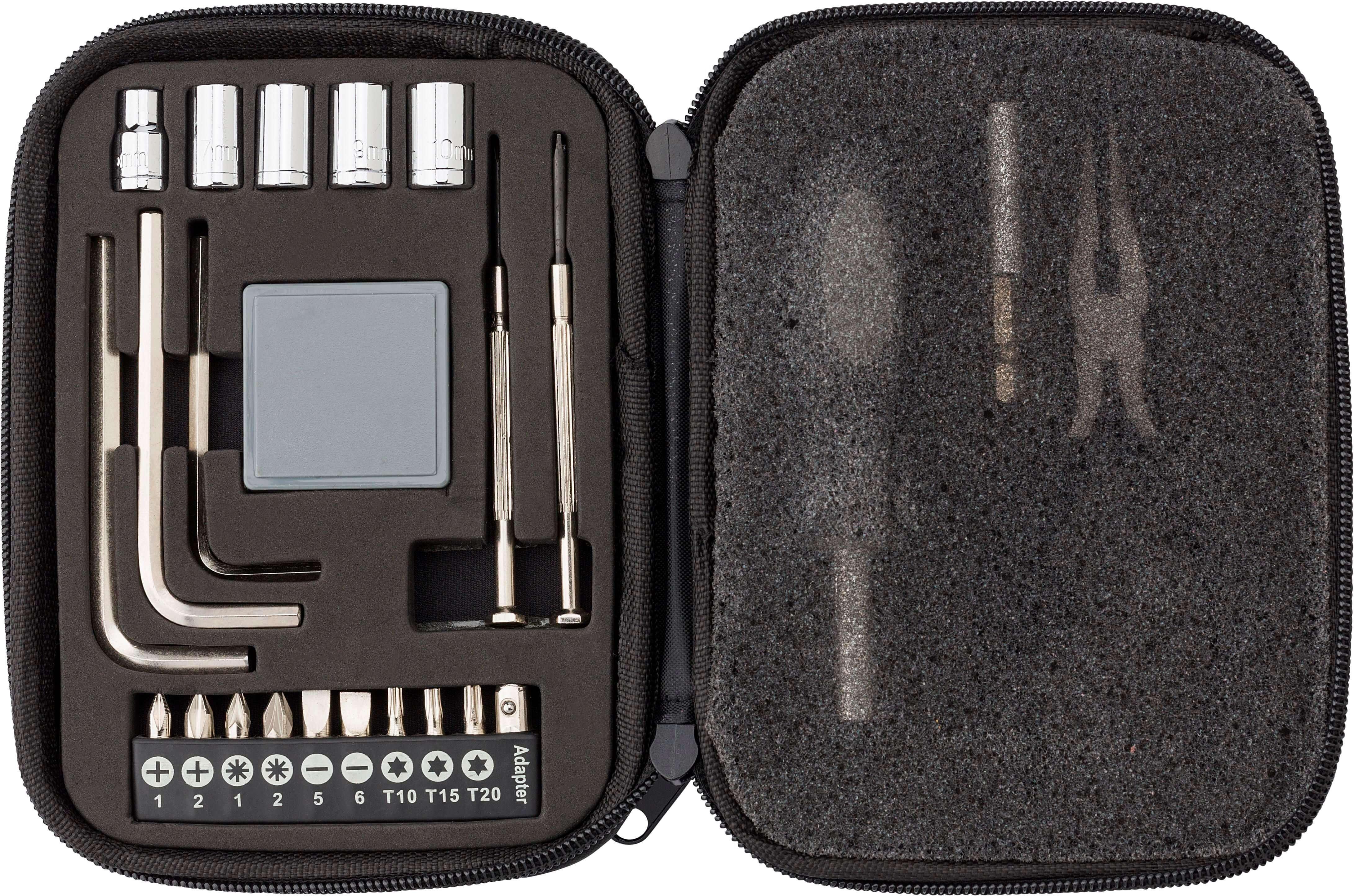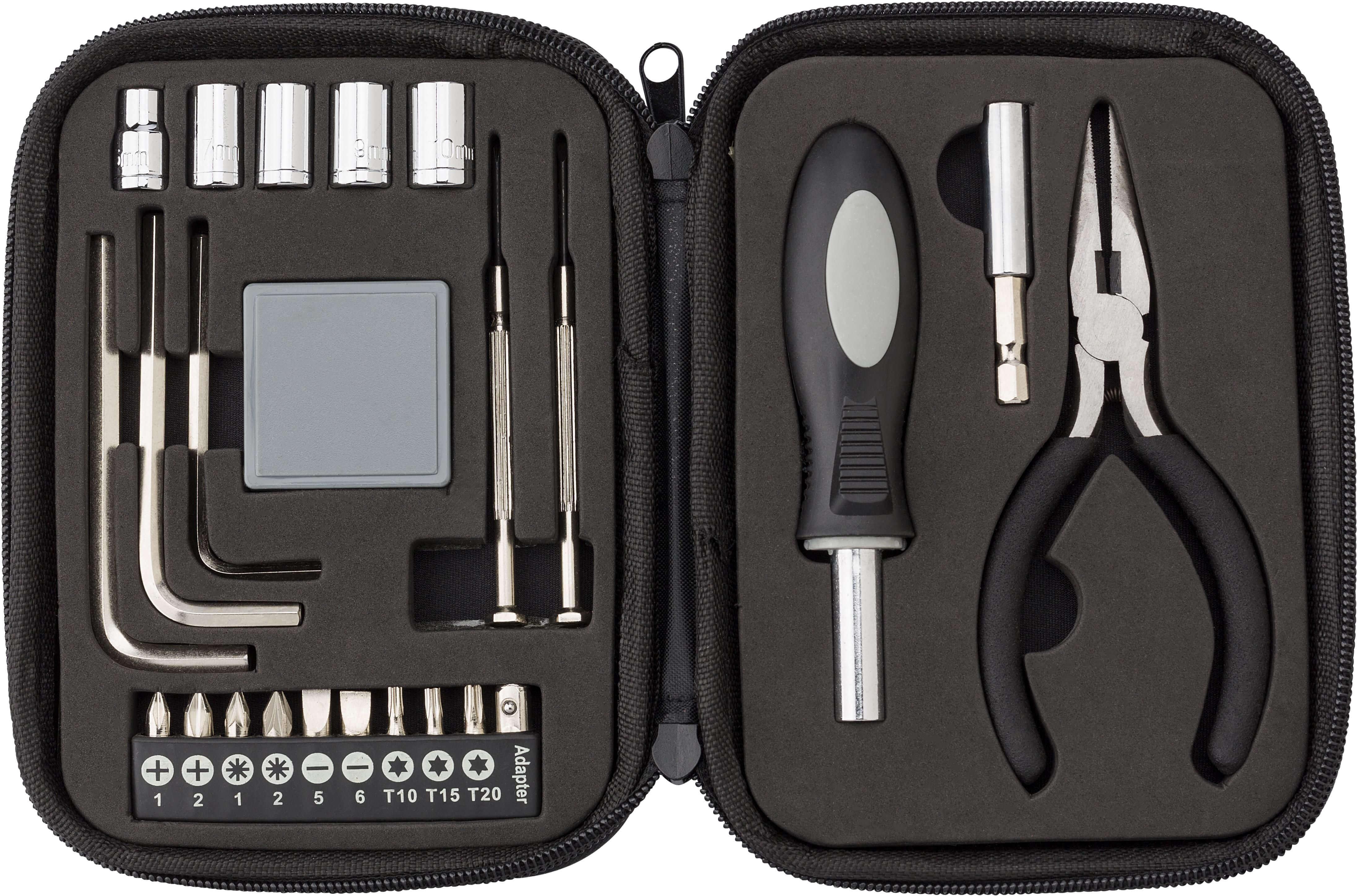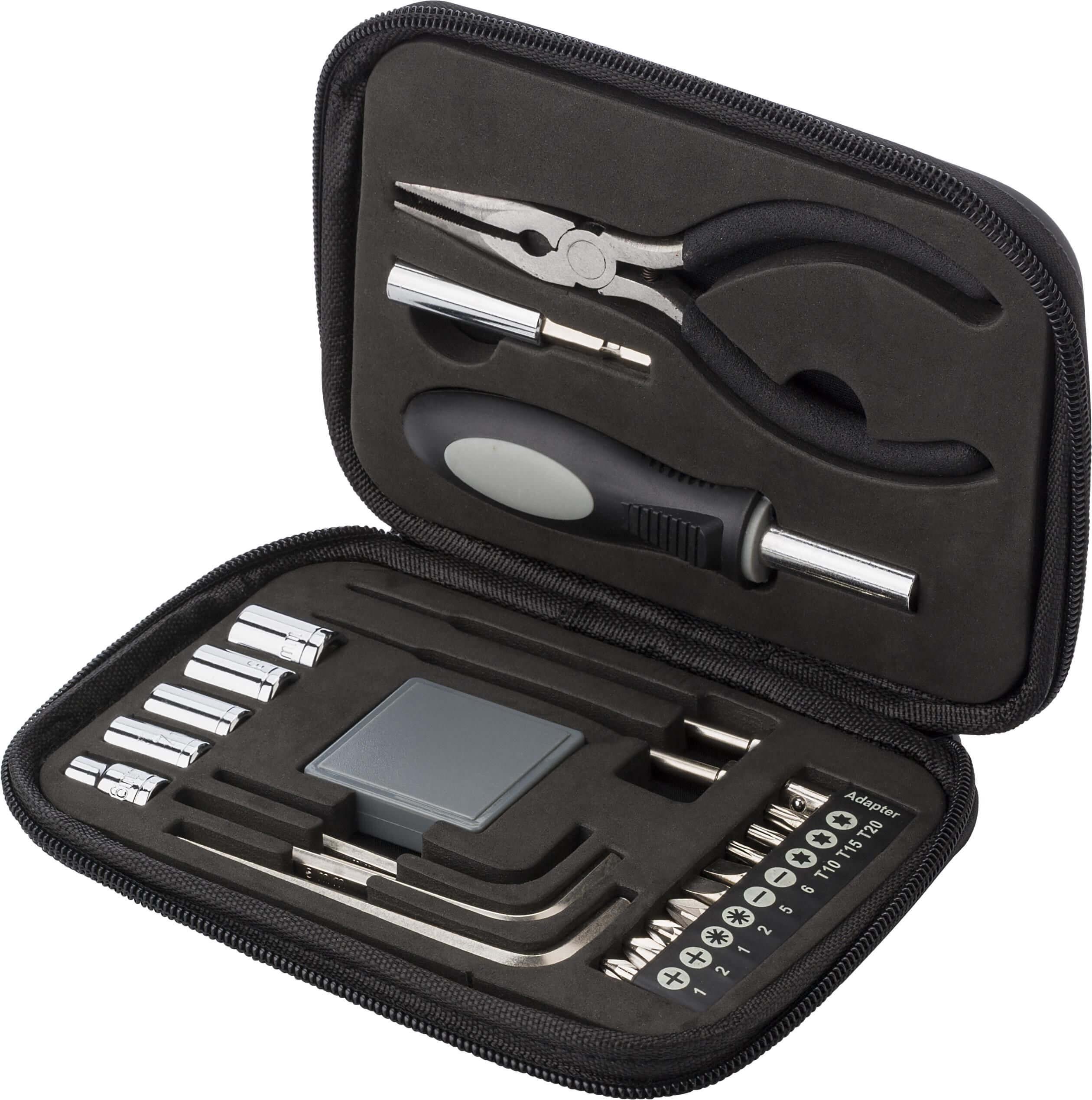 Conjunto de ferramentas em estojo de PU com fecho de correr, incluindo: chaves de fendas, pontas, fita métrica, cabo de chave de fendas, barra de extensão e alicate.