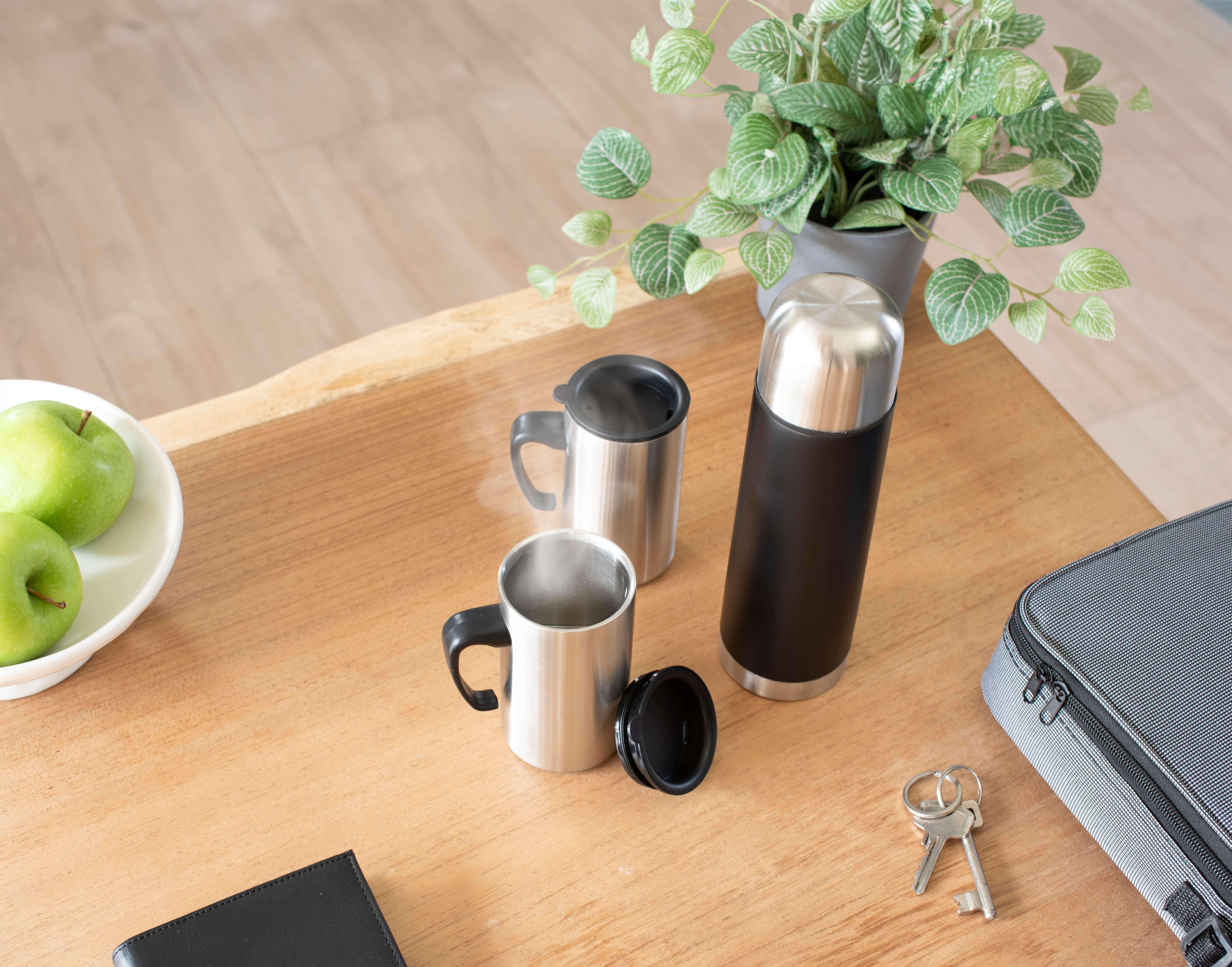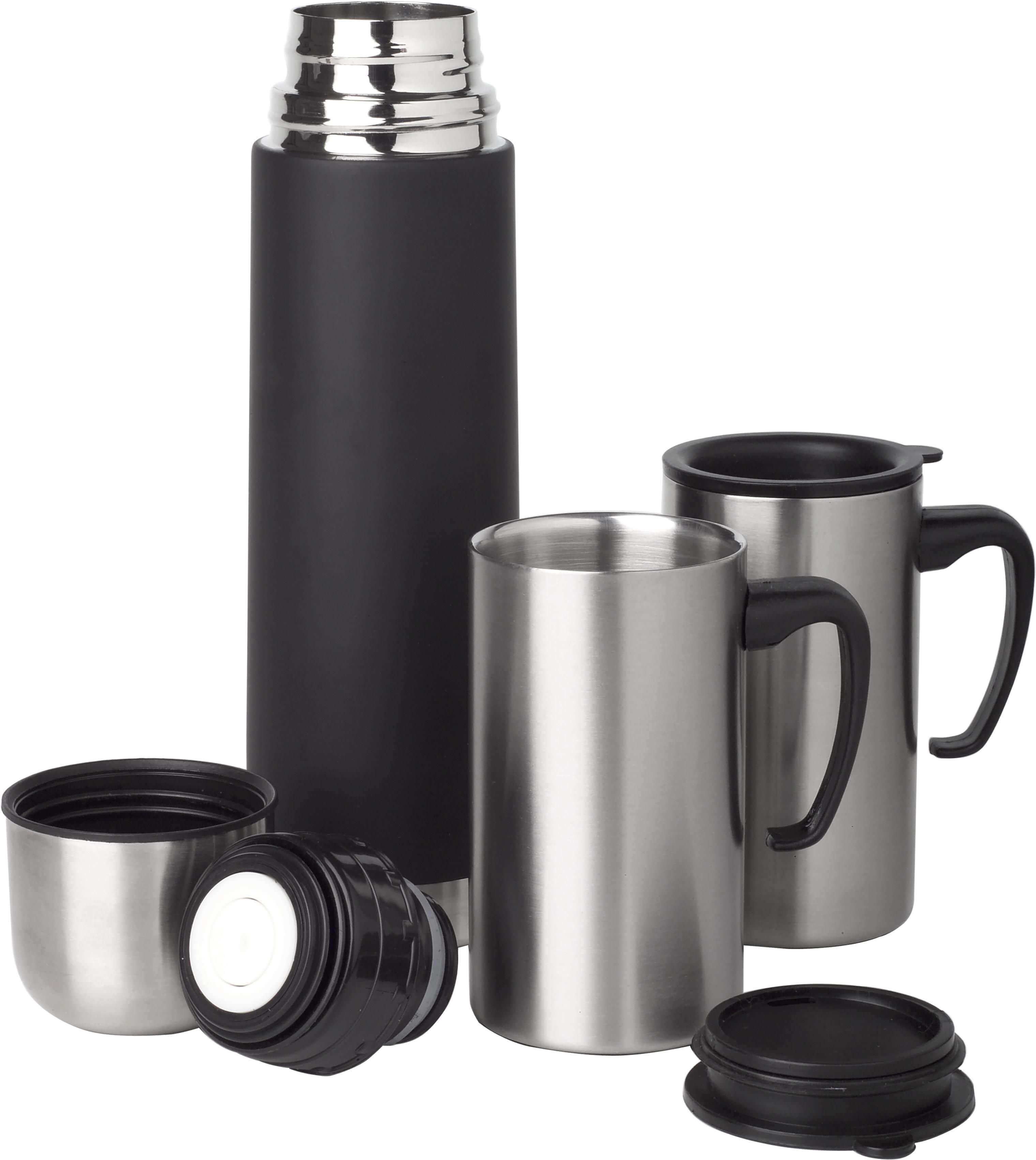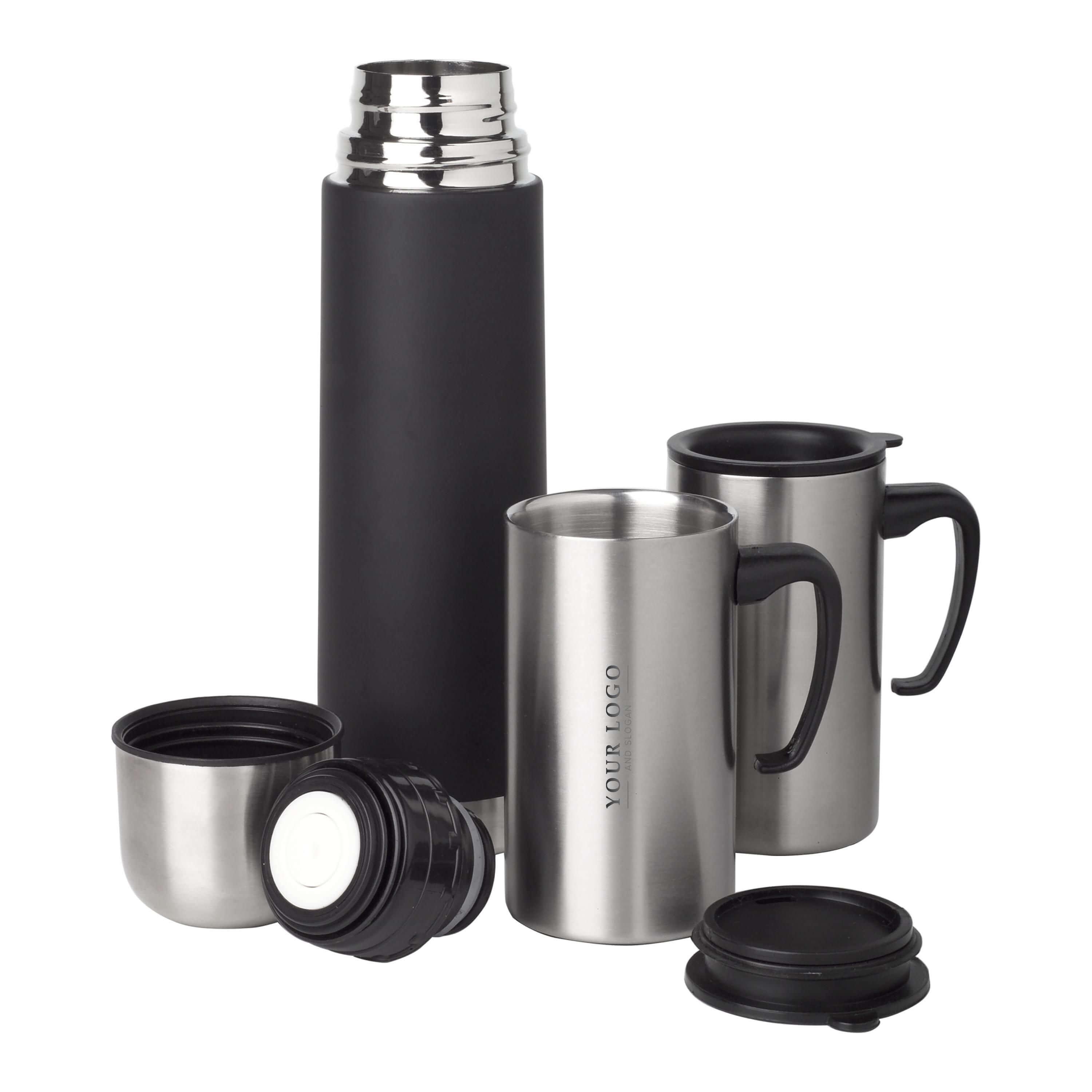Garrafa térmica com parede dupla, 500 ml e 2 canecas de 260 ml em aço inoxidável, com malha de nylon, fecho de correr e pega.