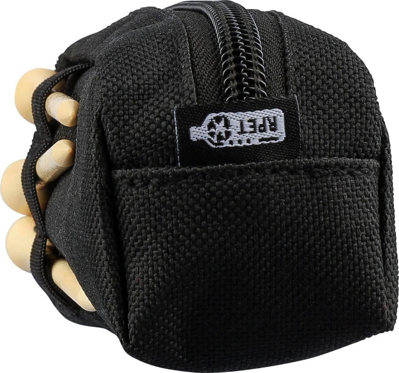 Conjunto de golfe rPET numa bolsa com fecho e mosquetão em PP, contendo 3 bolas de golfe de treino e 3 tees de golfe em madeira de faia. Ideal para uso promocional e treino de tacadas. Inclui etiqueta rPET.