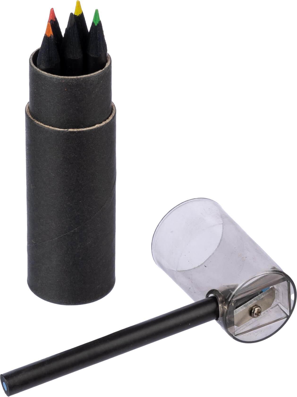 Caixa reciclada e tubo ABS com 7 lápis de cor e um apontador integrado à tampa.