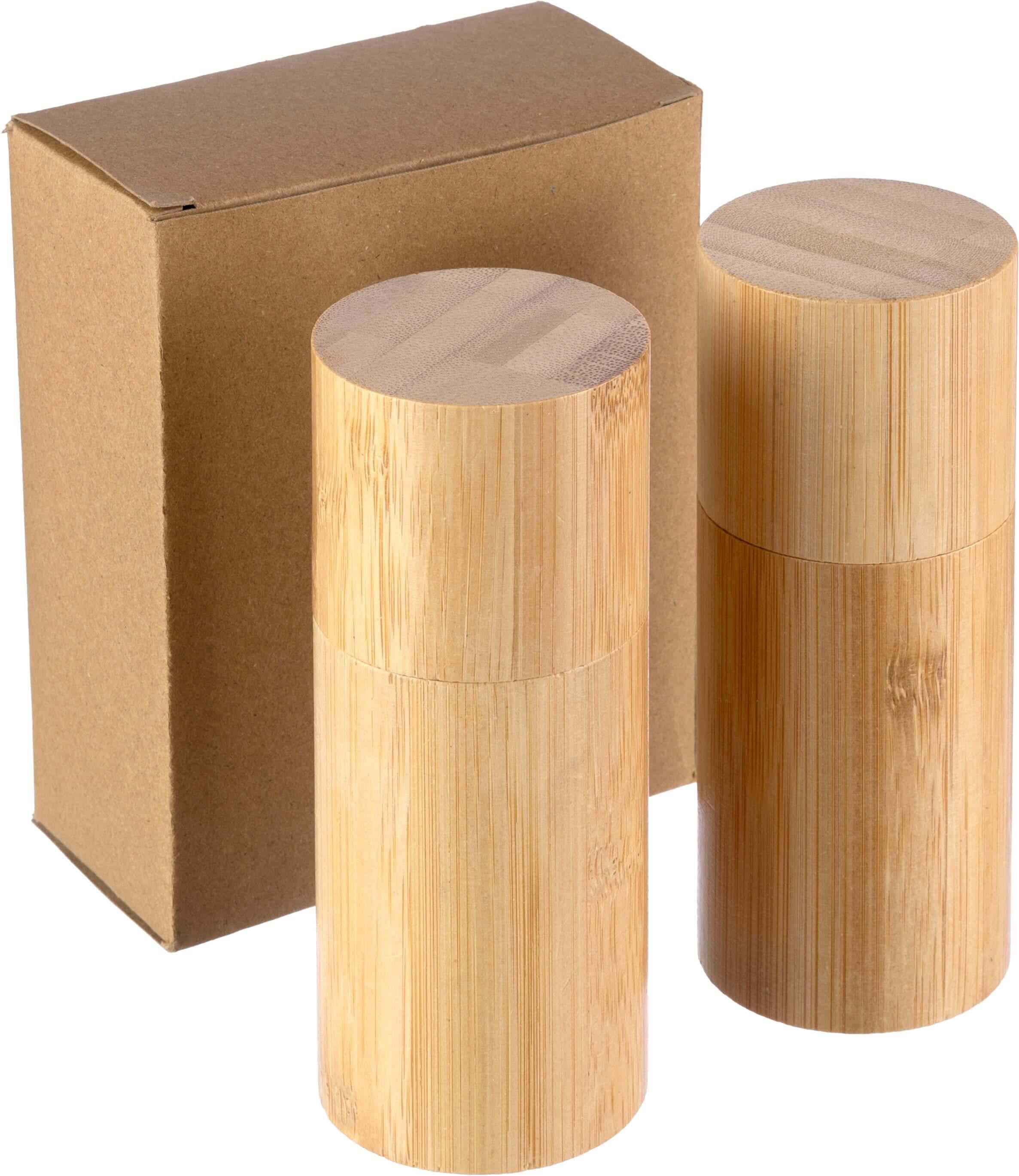 Conjunto com 2 moinhos de especiarias em bambu e cerâmica. Apresentado numa caixa Kraft.