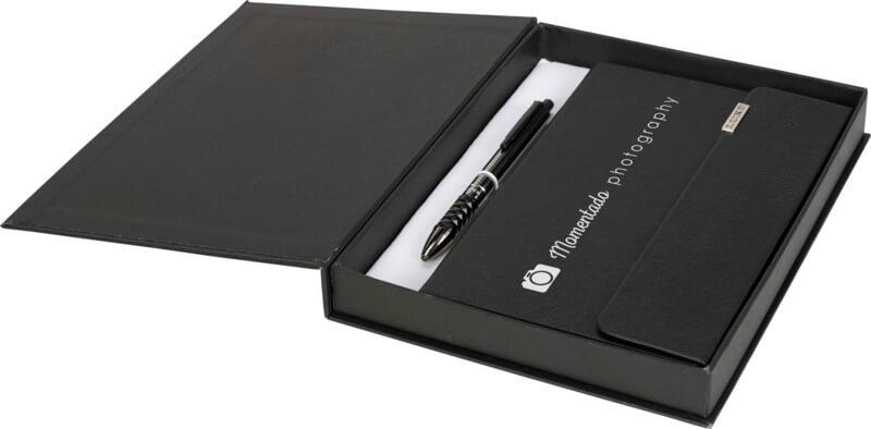 Bloco de Notas de desenho exclusivo (referência A5) com capa em TPU, marcador de página de fita preta, fecho magnético e 80 folhas pautadas (80 g) creme. Incluí uma caneta esferográfica com ação de clique Tactical. Ambos os artigos embalados numa caixa de presente “Luxe”. Tamanho do Bloco de notas: 13,5 x 20,5 cm. Comprimento da caneta: 14 cm. Diâmetro da caneta: 1,05 cm.
