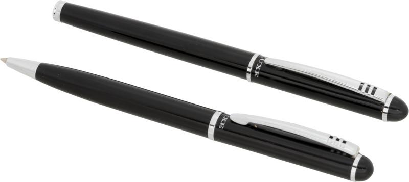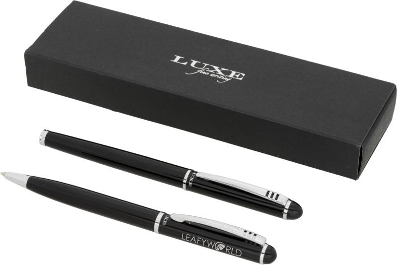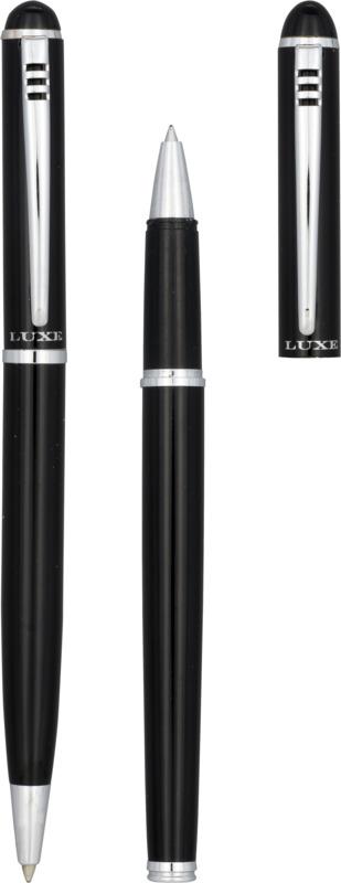 Conjunto com caneta esferográfica de torcer de design exclusivo e caneta rollerball com tampa. Disponível em Preto Brilhante, Prateado Fosco e Azul Fosco. Embalado em uma caixa de presente “LUXO”.