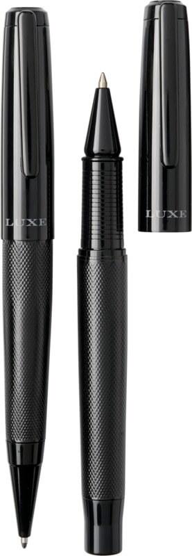 Conjunto de oferta com caneta esferográfica e caneta rollerbal com corpo superior e inferior em cor preta com um acabamento brilhante, entregue numa caixa de presentes “Luxe”. Caneta esferográfica: 14 cm x 1,45 cm, peso: 40 gramas, comprimento de escrita: 800 m. Diâmetro da caneta: 13,8 cm x 1,45 cm, peso: 54 gramas, comprimento de escrita: 400 m.