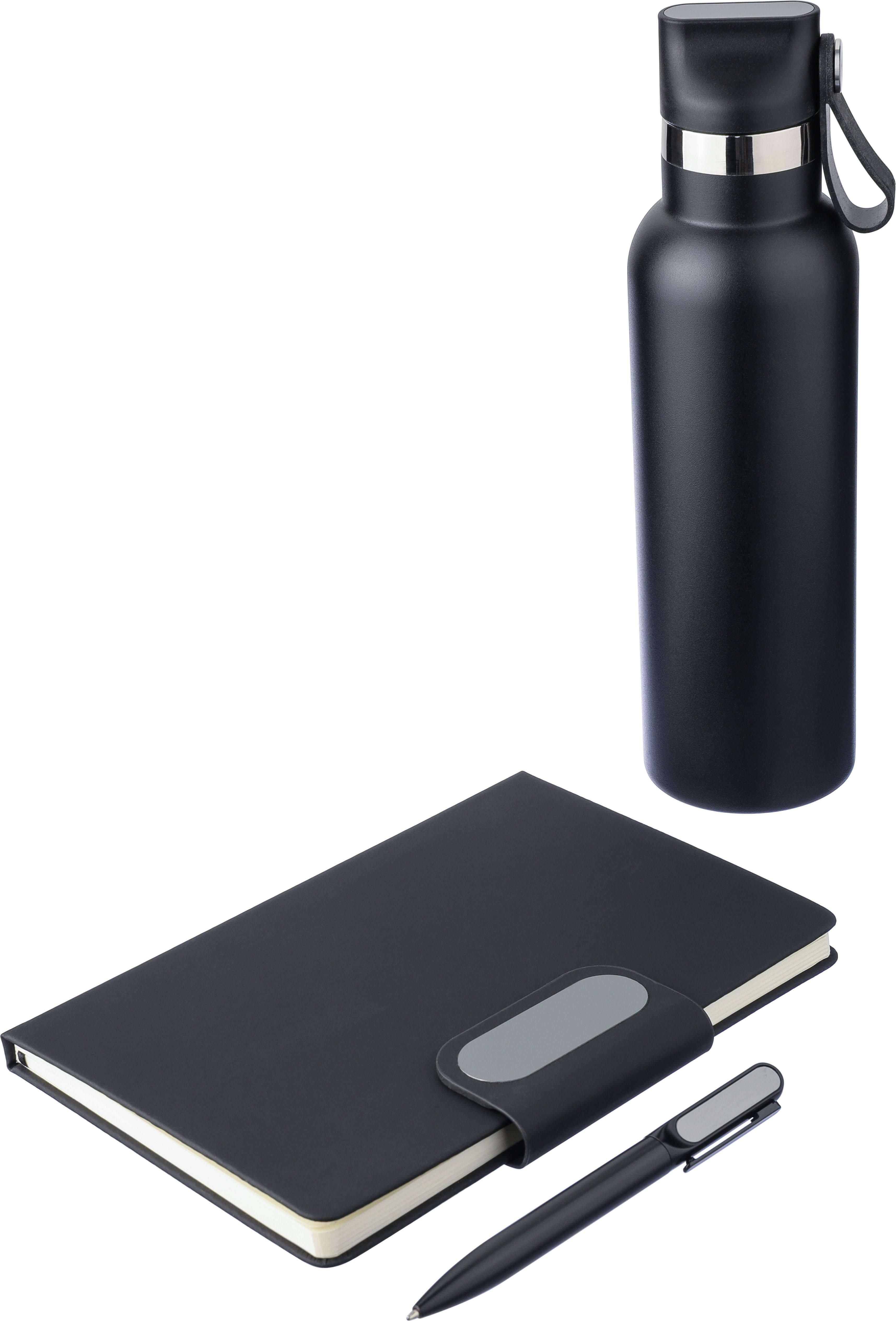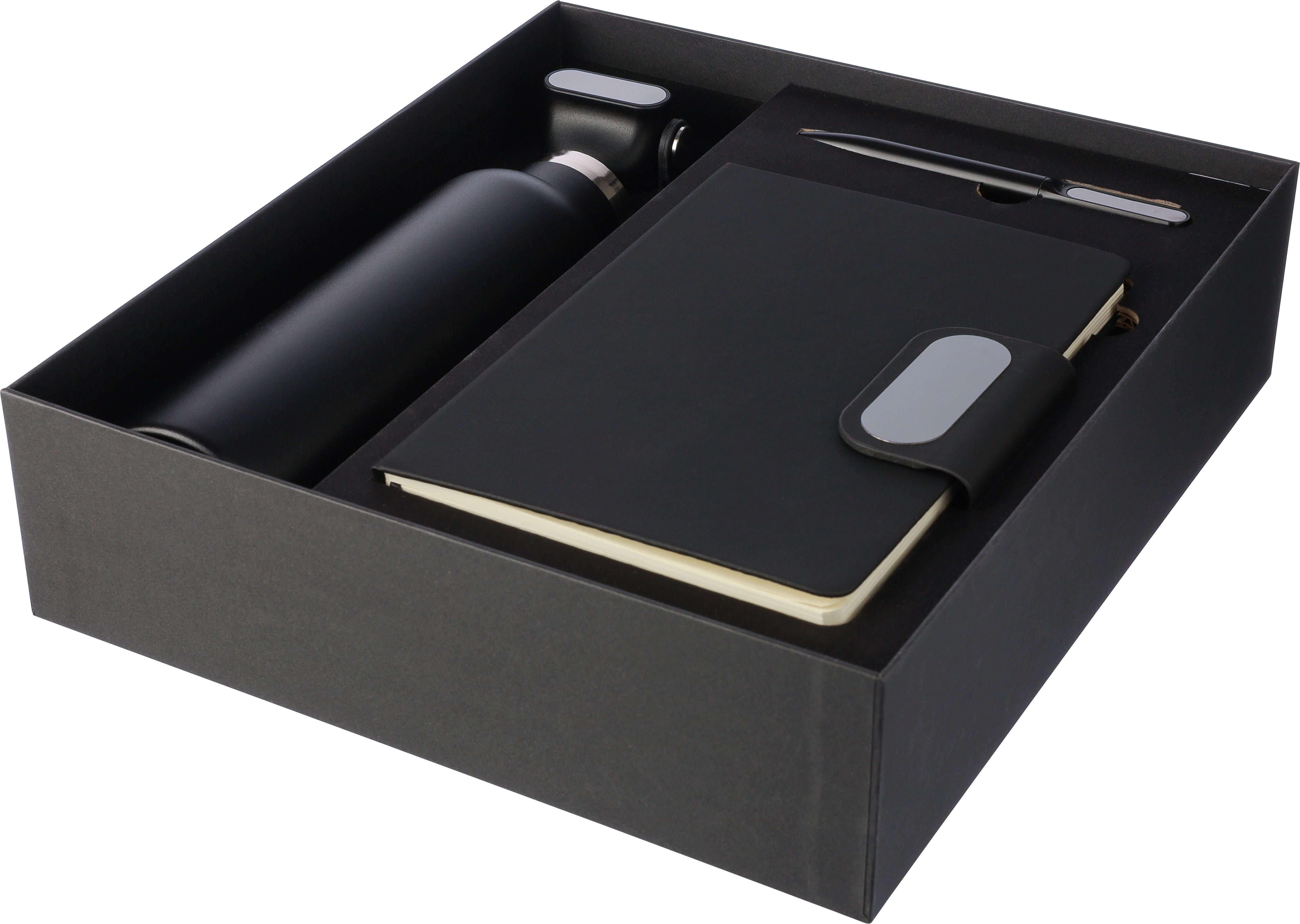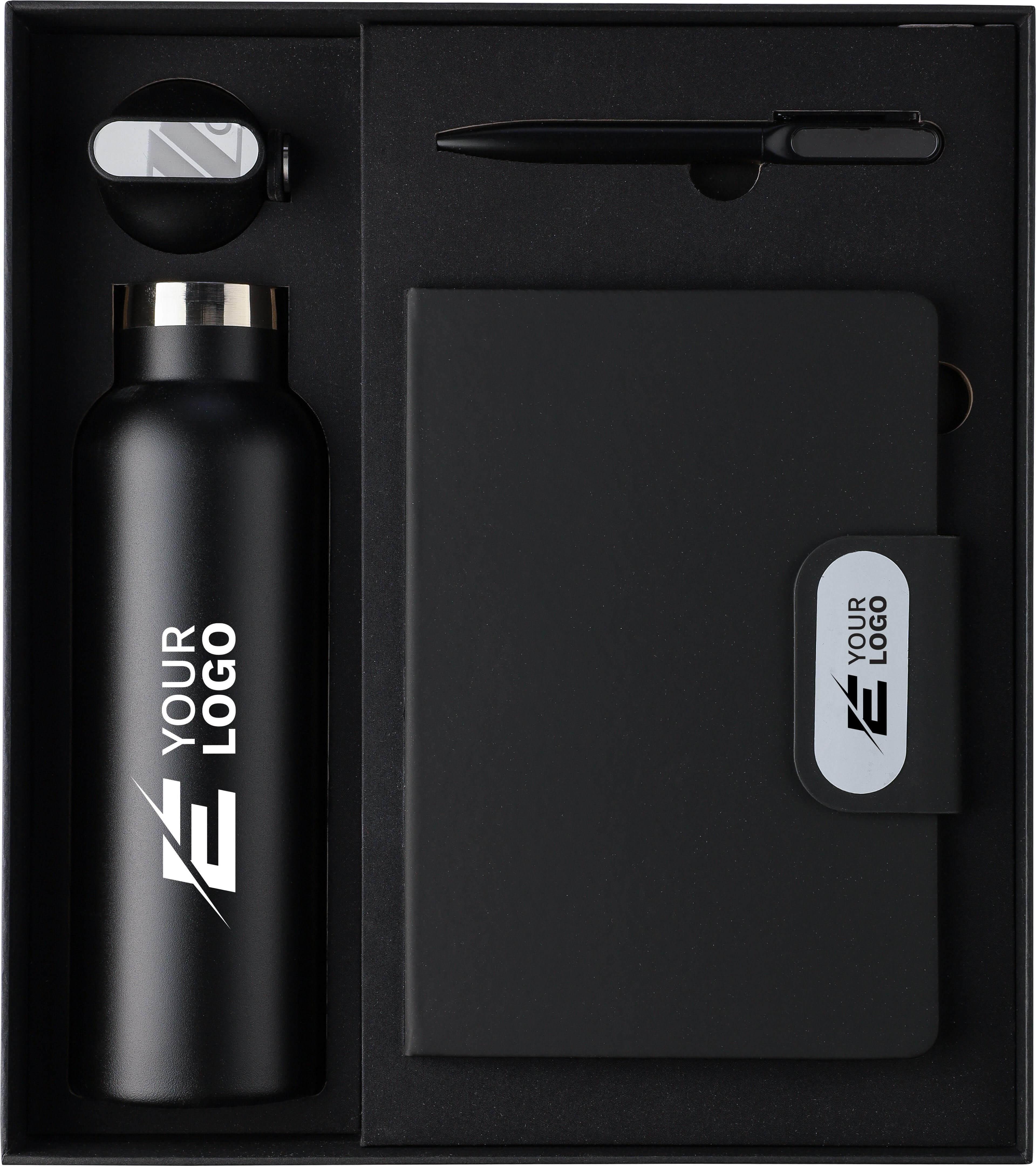 Conjunto de oferta em cartão composto por uma garrafa de aço inoxidável reciclado de parede dupla (interior e exterior 304) com pega de silicone, uma esferográfica de alumínio reciclado com tinta azul e um bloco de notas em PU reciclado com 80 folhas de papel FSC pautado de 70 g/m². O bloco de notas tem um marcador de livros com fita e um fecho magnético de metal com uma placa de gravação em bronze. Todos os artigos incluem um logótipo reciclado: gravado na garrafa e na esferográfica e gravado em relevo no bloco.
