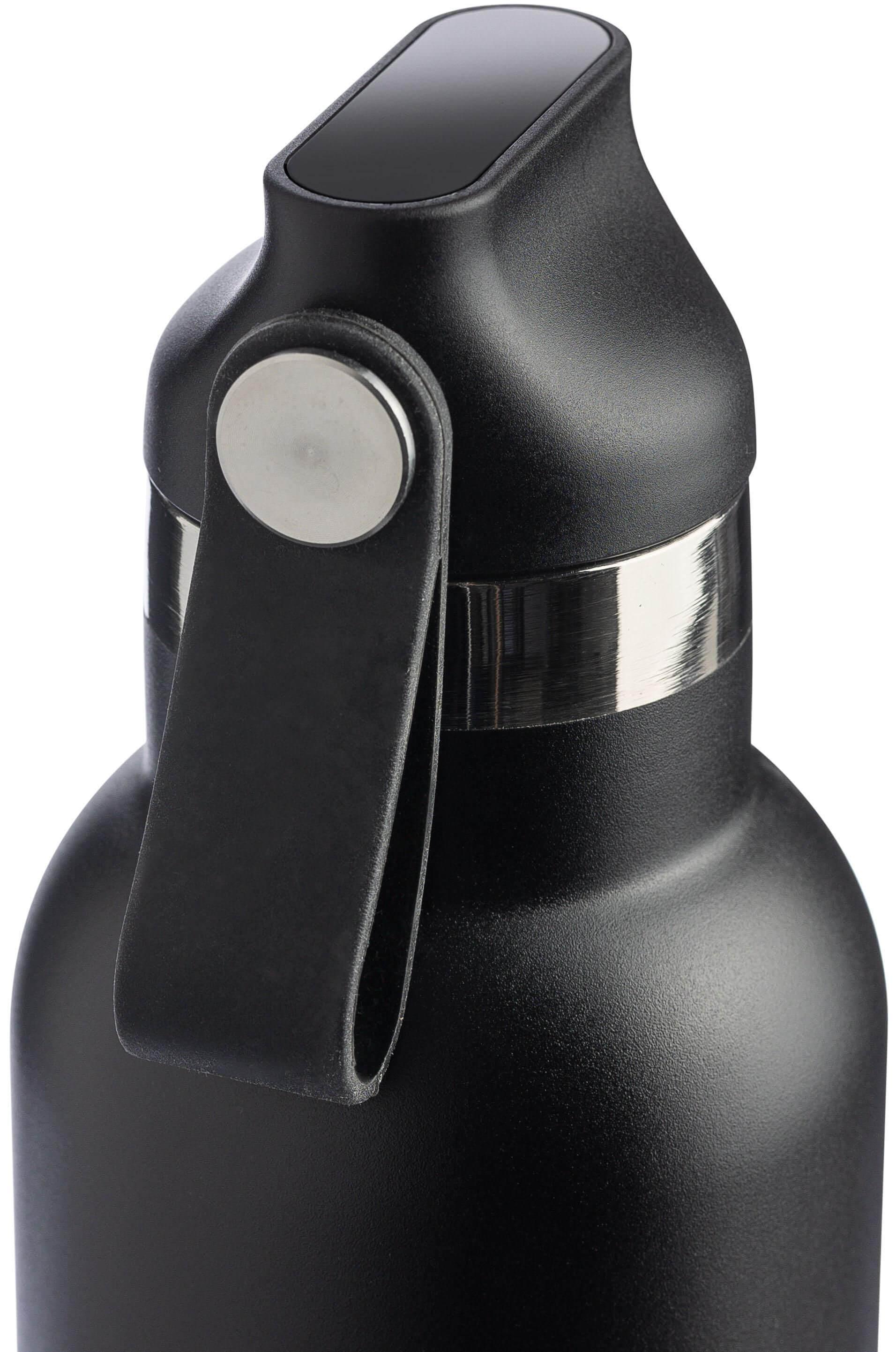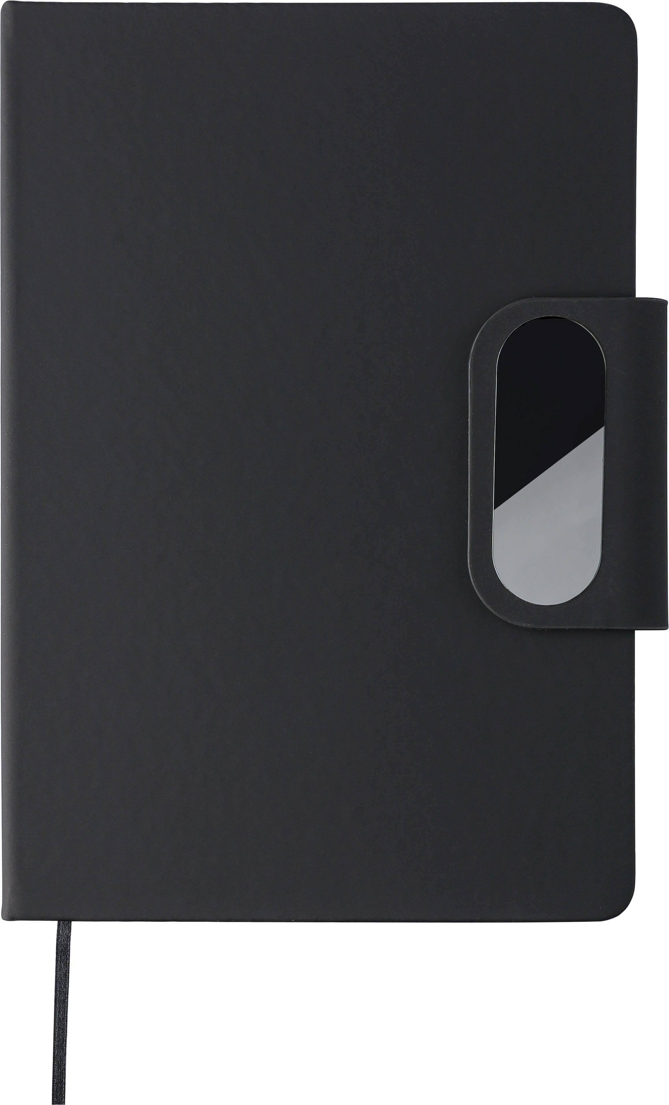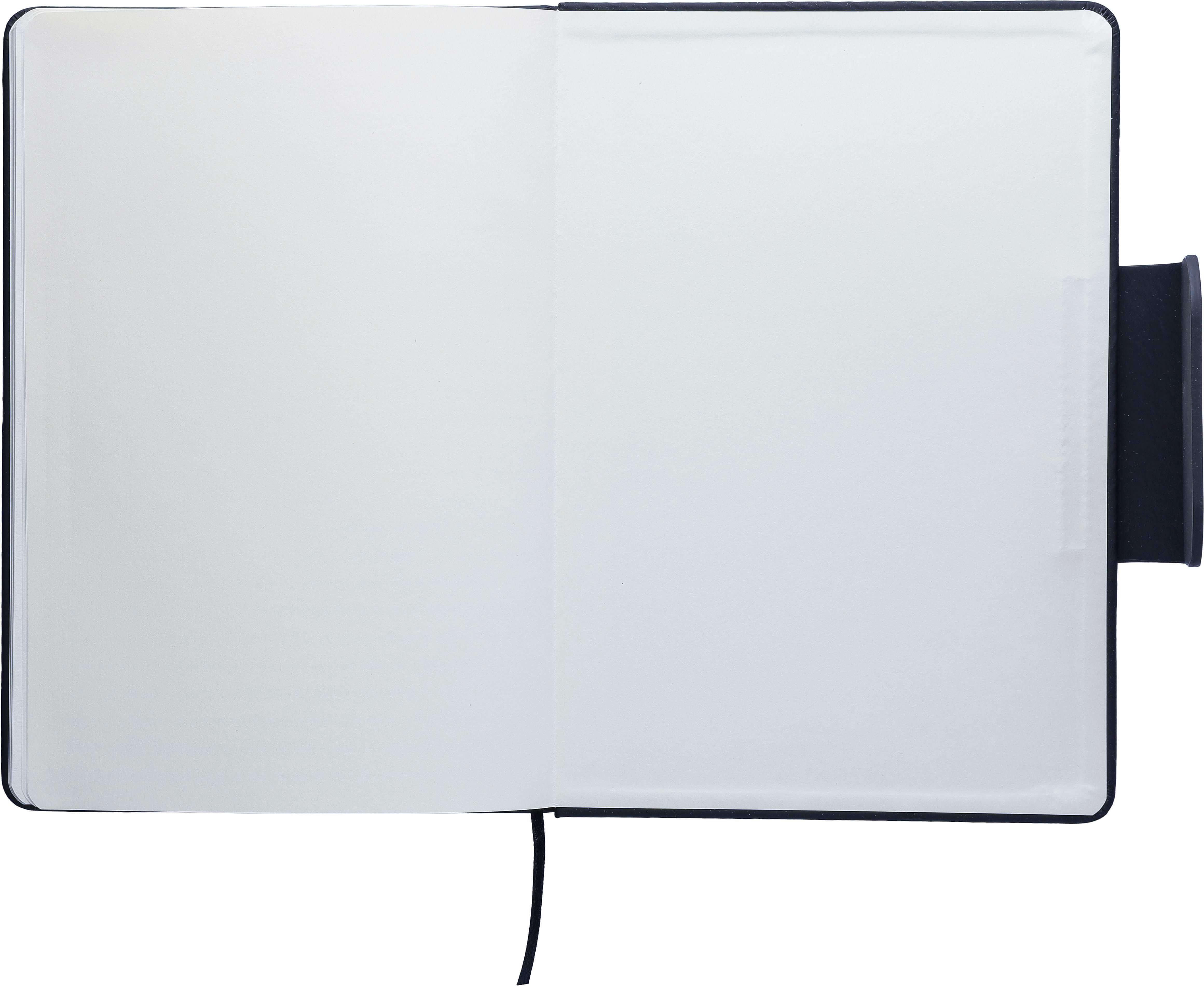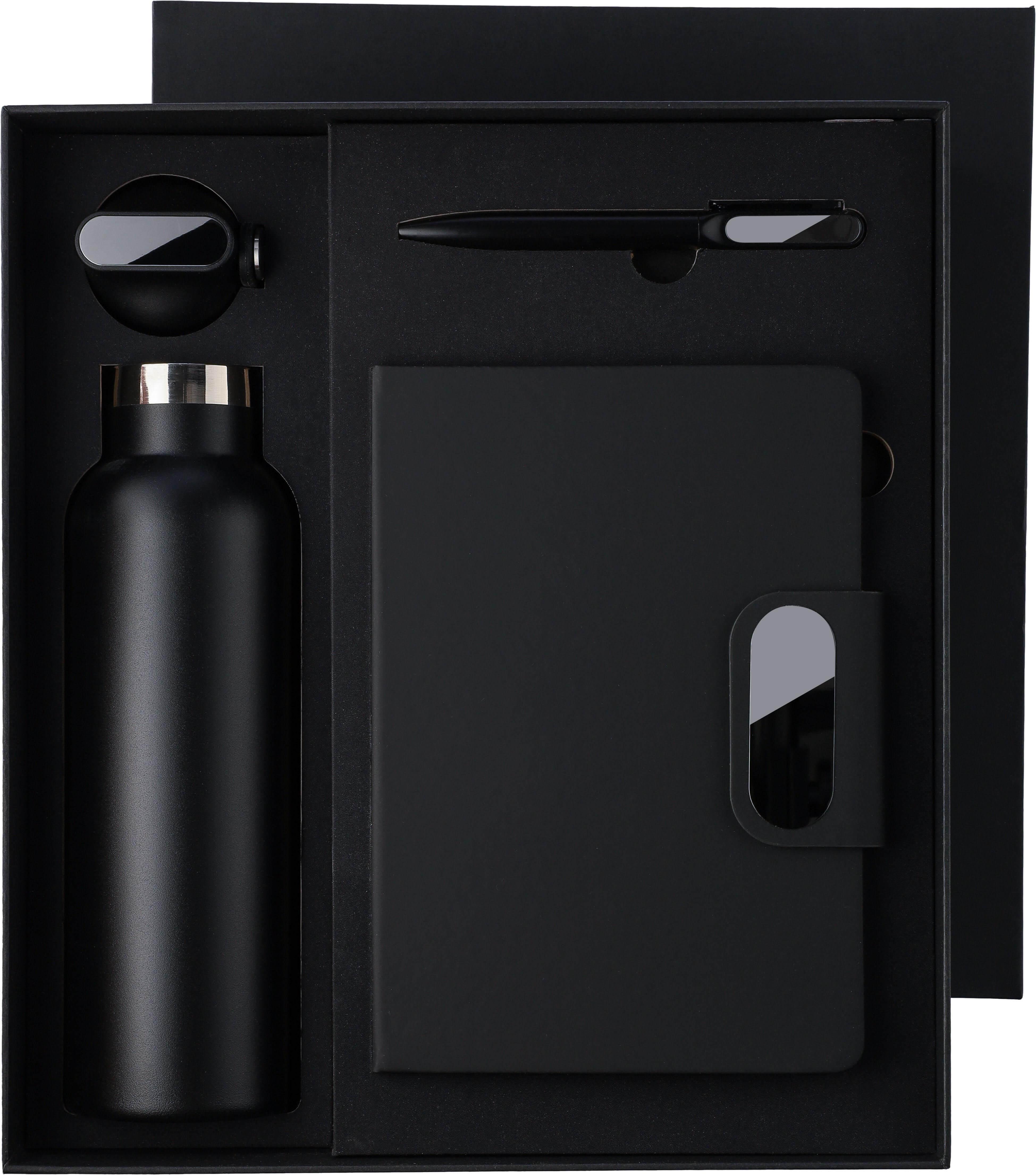 Conjunto de oferta em cartão composto por uma garrafa de aço inoxidável reciclado de parede dupla (interior e exterior 304) com pega de silicone, uma esferográfica de alumínio reciclado com tinta azul e um bloco de notas em PU reciclado com 80 folhas de papel FSC pautado de 70 g/m². O bloco de notas tem um marcador de livros com fita e um fecho magnético de metal com uma placa de gravação em bronze. Todos os artigos incluem um logótipo reciclado: gravado na garrafa e na esferográfica e gravado em relevo no bloco.