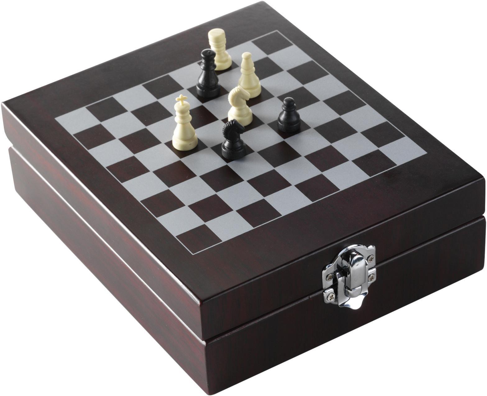 Luxuoso conjunto com 4 acessórios para vinho e jogo de xadrez em caixa de madeira.