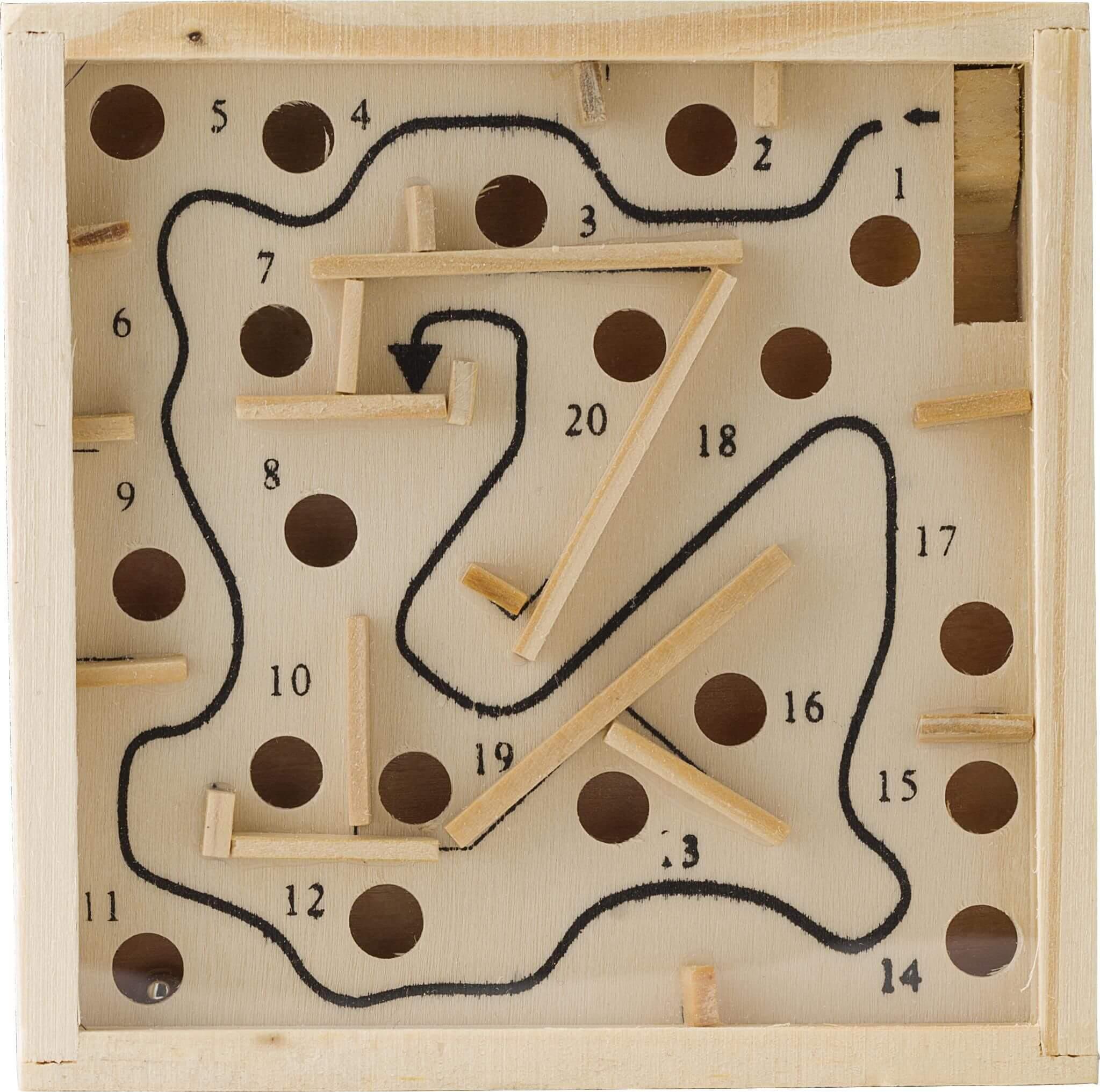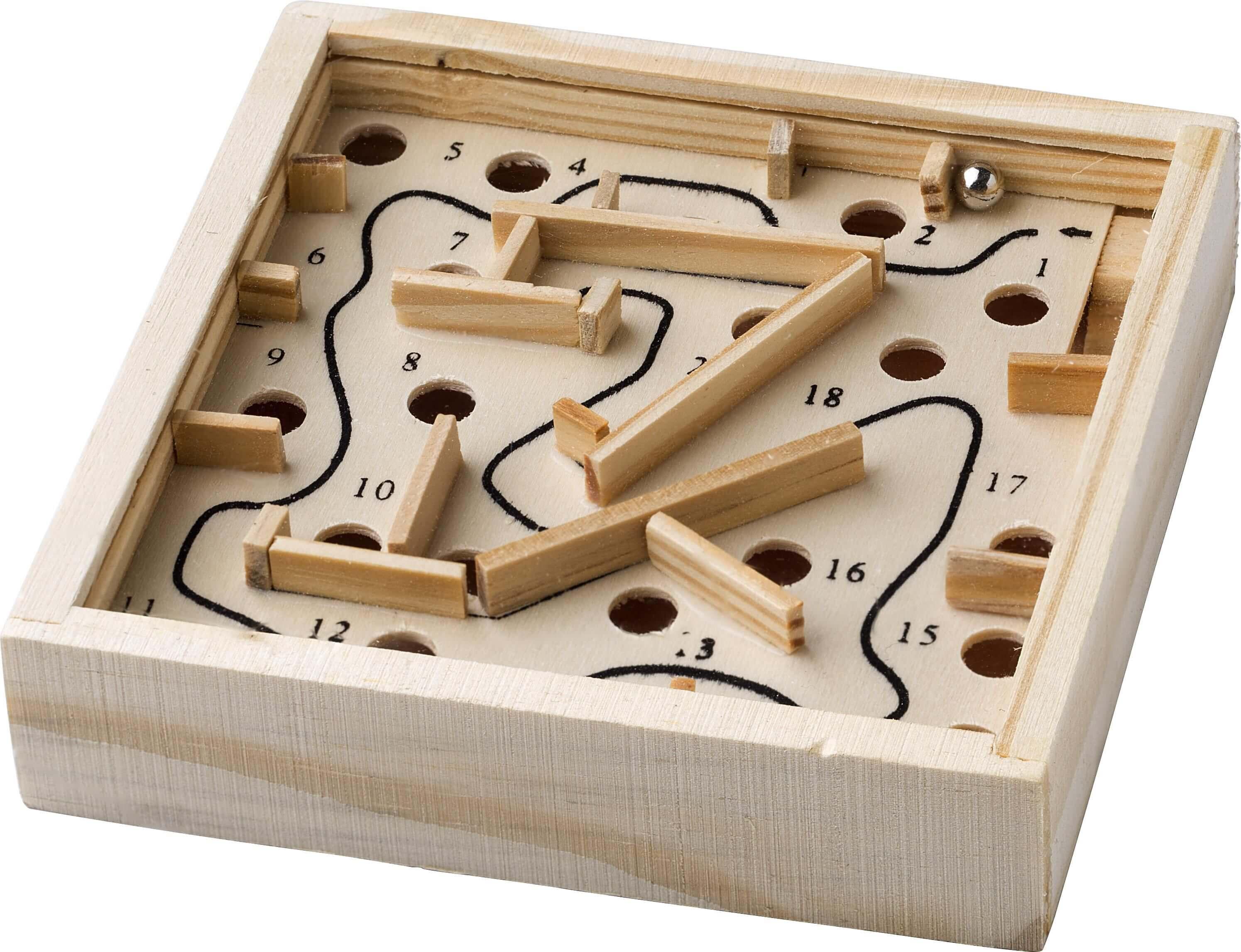Jogo de paciência em madeira com estrutura em plástico. Siga o caminho dos números para terminar o jogo sem deixar a bola de metal cair nos buracos. Apresentado individualmente numa caixa de cartão castanha.
