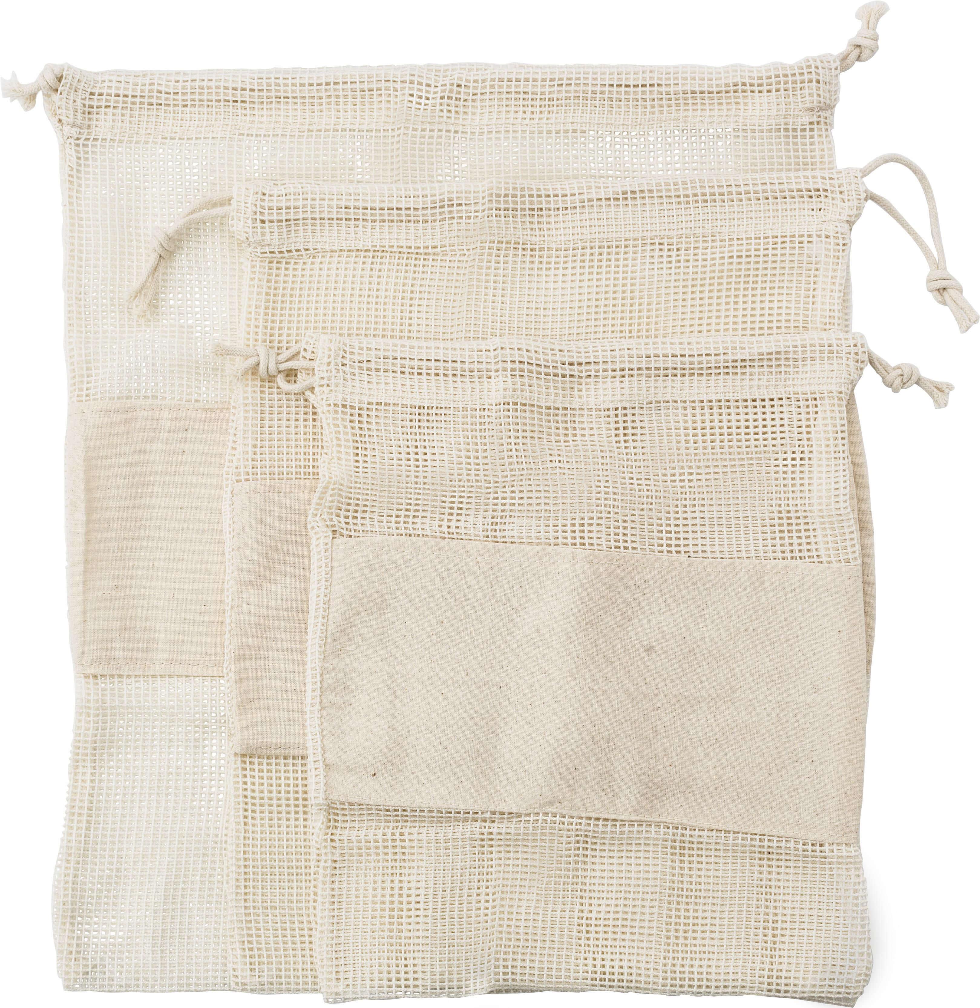 Conjunto de 3 sacos de malha de algodão orgânico, apresentados numa manga de papel kraft. Fecham com um cordão e têm um painel de algodão na frente, adequado para personalização. Tamanhos de sacos: 20×24 cm, 24×30 cm e 31x 24 cm.