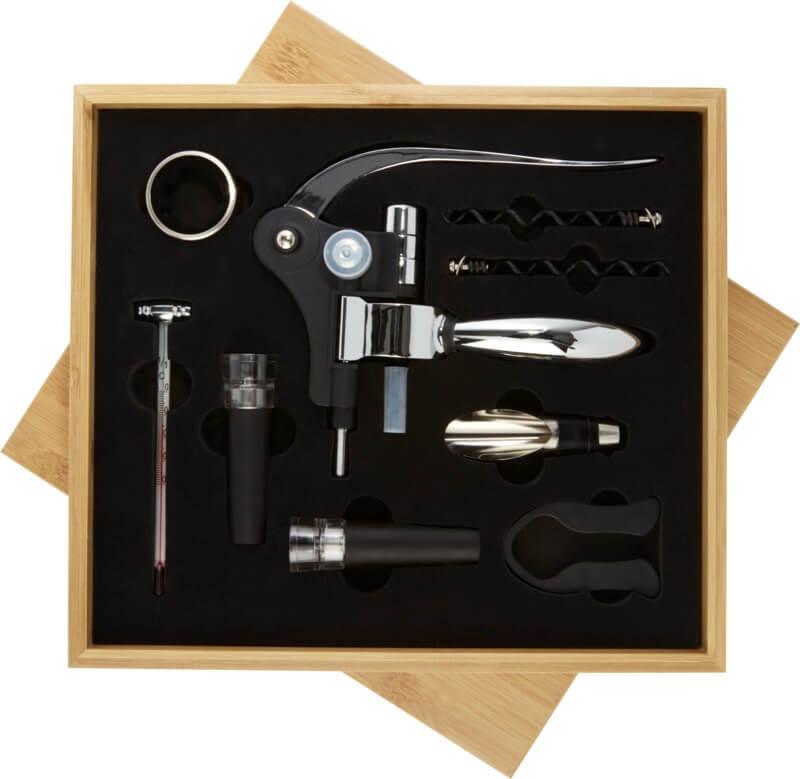 Conjunto de vinho de 9 peças incluindo 1 saca-rolhas, 2 rolhas, 1 vertedor, 1 anel, 1 cortador de películas, 1 termómetro e 2 saca-rolhas de reserva. Entregue numa caixa de presente em bambu de origem e produzida seguindo padrões sustentáveis.