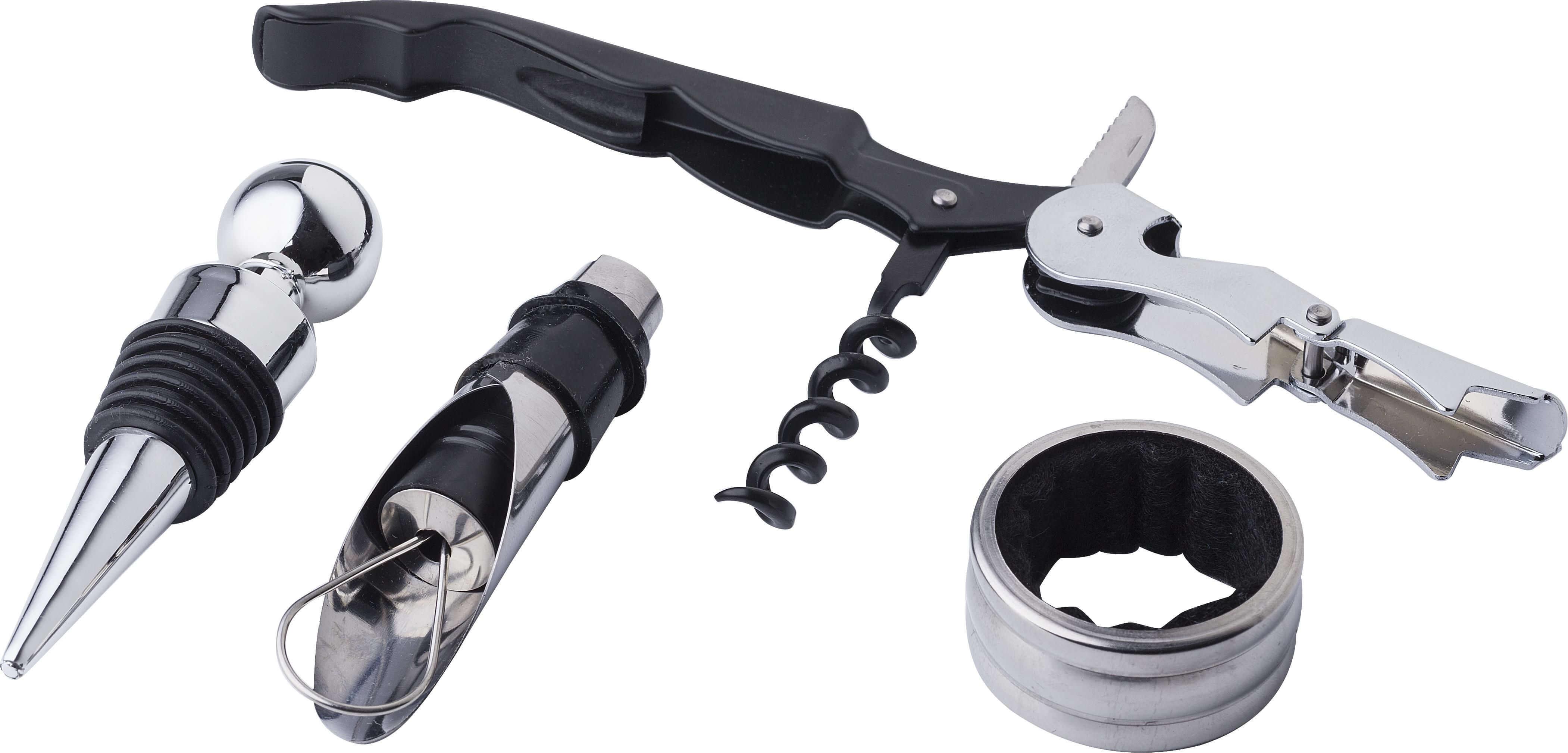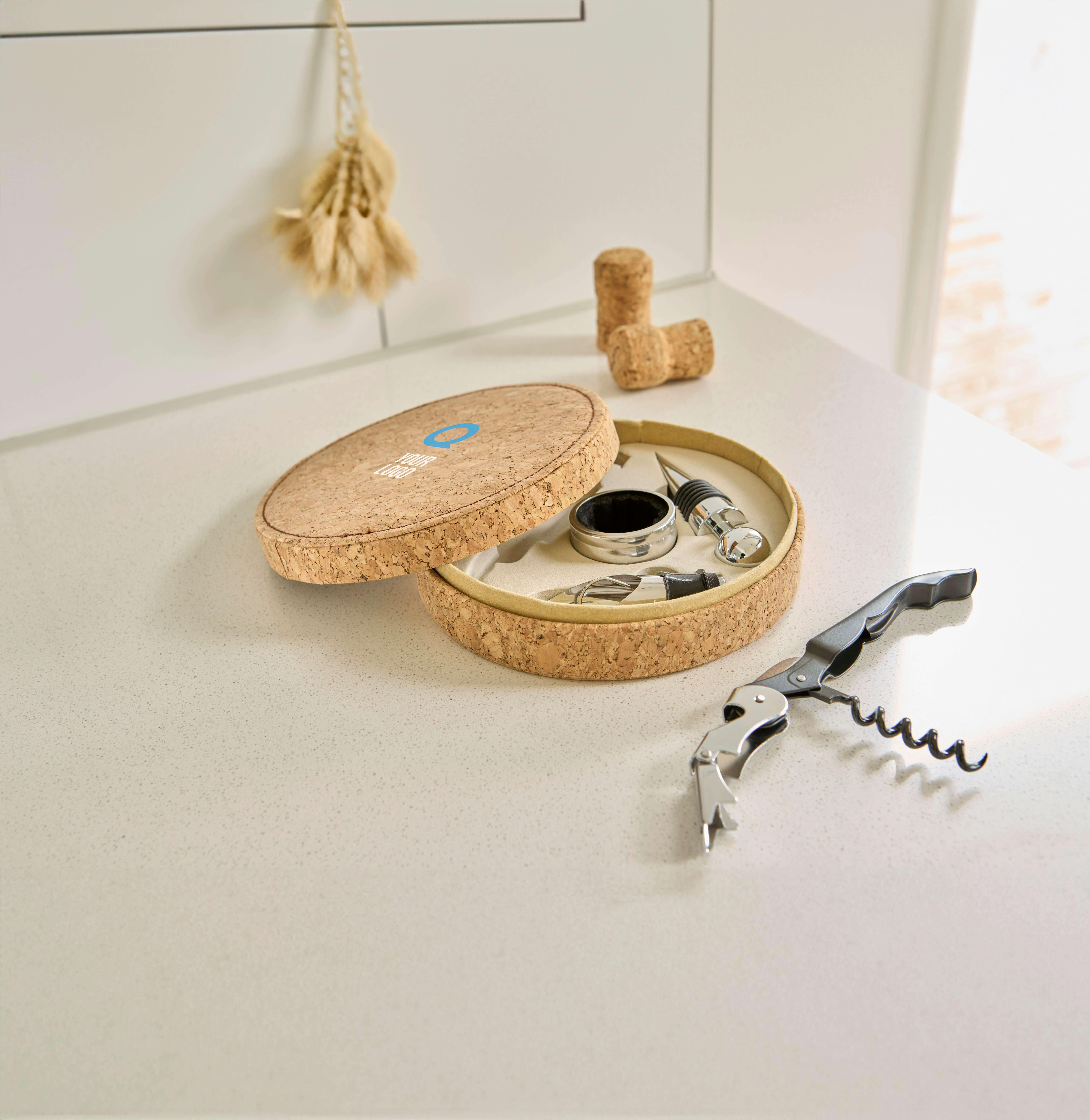 Conjunto de vinho de PU com aspeto de cortiça com 4 acessórios: saca rolhas, rolha de garrafa com bico de vazamento e coletor de gotejamento. Apresentado numa caixa de cartão castanha