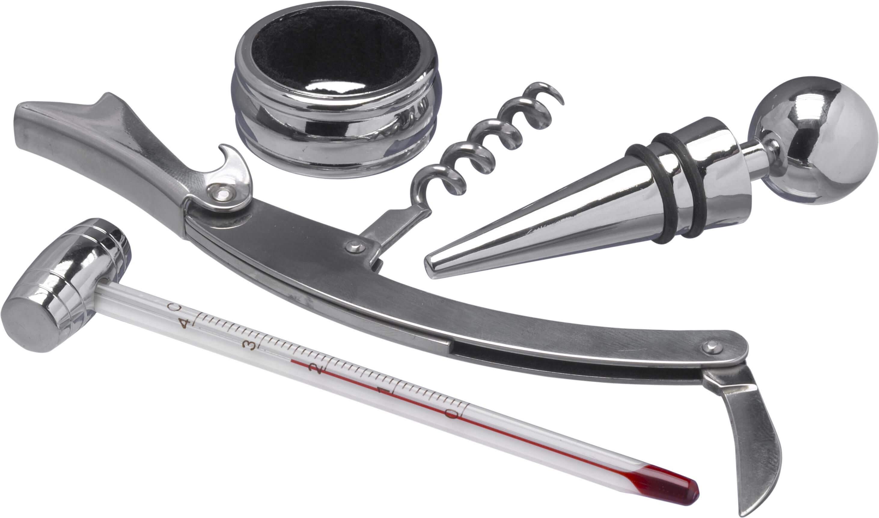 Conjunto de vinho apresentado em estojo de madeira com argola antigotas, termómetro, rolha e saca-rolhas.