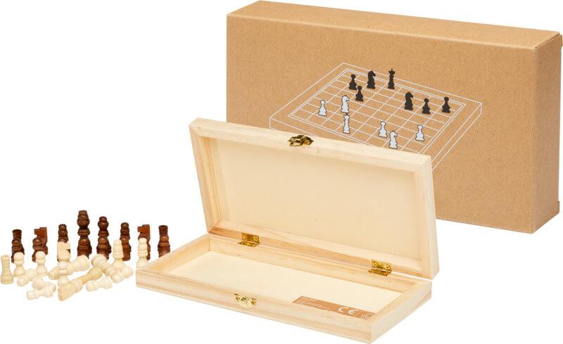 Desfrute da estimulação intelectual do xadrez onde quer que vá com o conjunto de xadrez “King”. Proporcionando uma combinação perfeita de portabilidade e elegância, este conjunto inclui 32 peças de xadrez nas cores marrom e marfim que são lindamente trabalhadas a partir de madeira de pinho de origem responsável. A caixa de madeira dobrável permite um armazenamento e transporte convenientes. As dobradiças e fechaduras de metal resistentes garantem que o jogo de xadrez permaneça sempre seguro e protegido. Entregue com manual de instruções numa caixa de presente de papel kraft. Atenção! Não é adequado para crianças com menos de três anos. Peças pequenas. Perigo de asfixia.