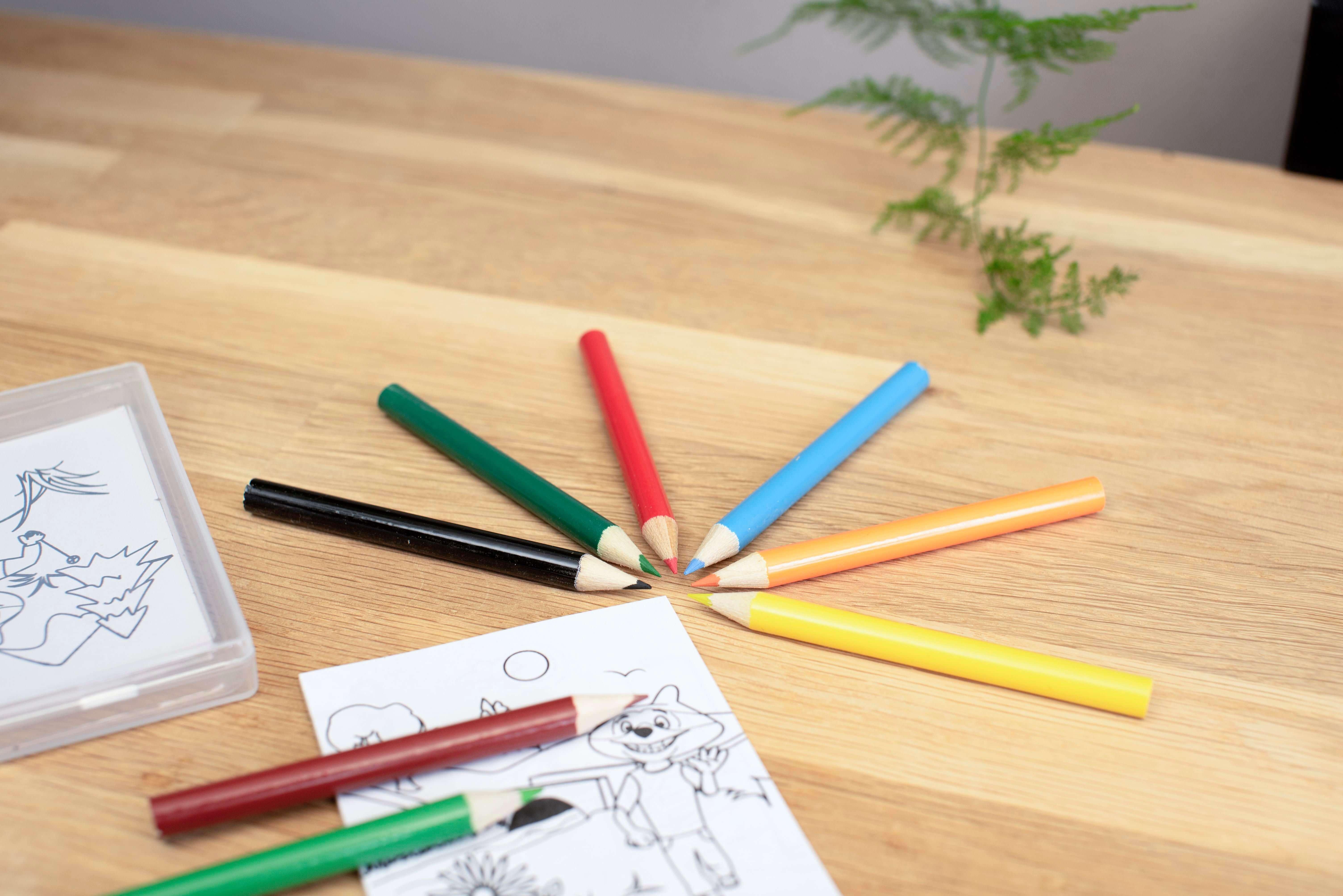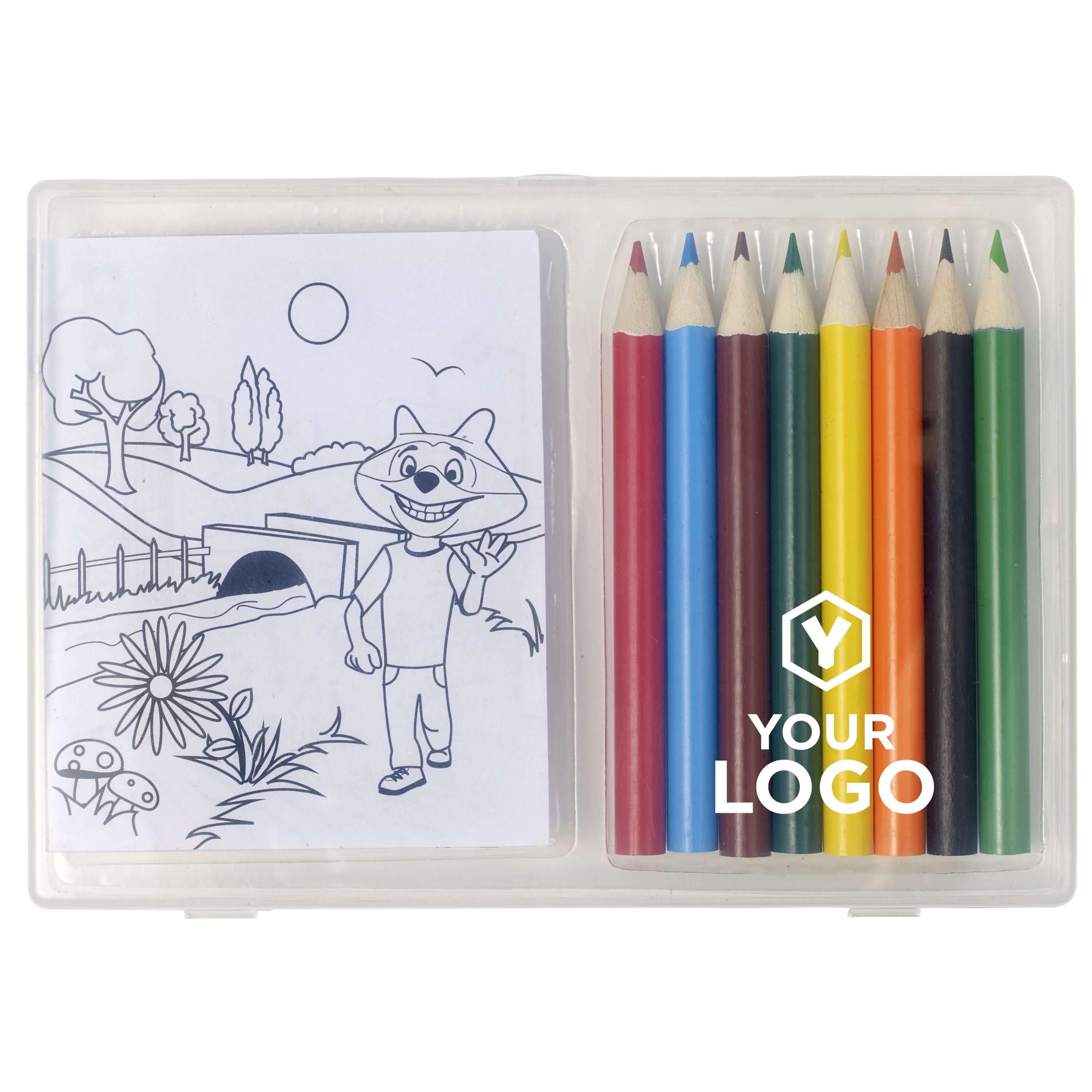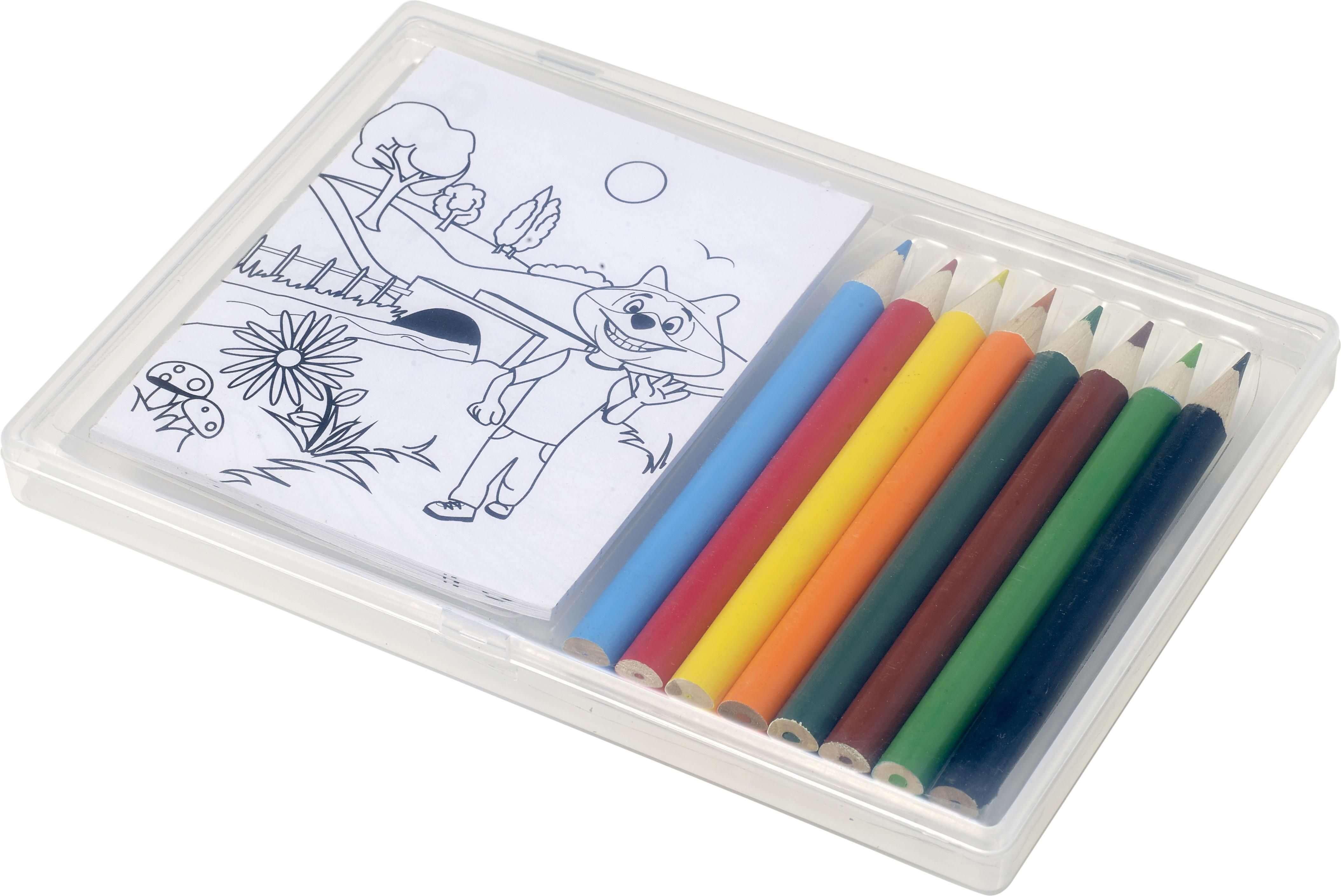 Conjunto de 8 lápis de cor e 20 folhas para pintar em caixa de plástico transparente.