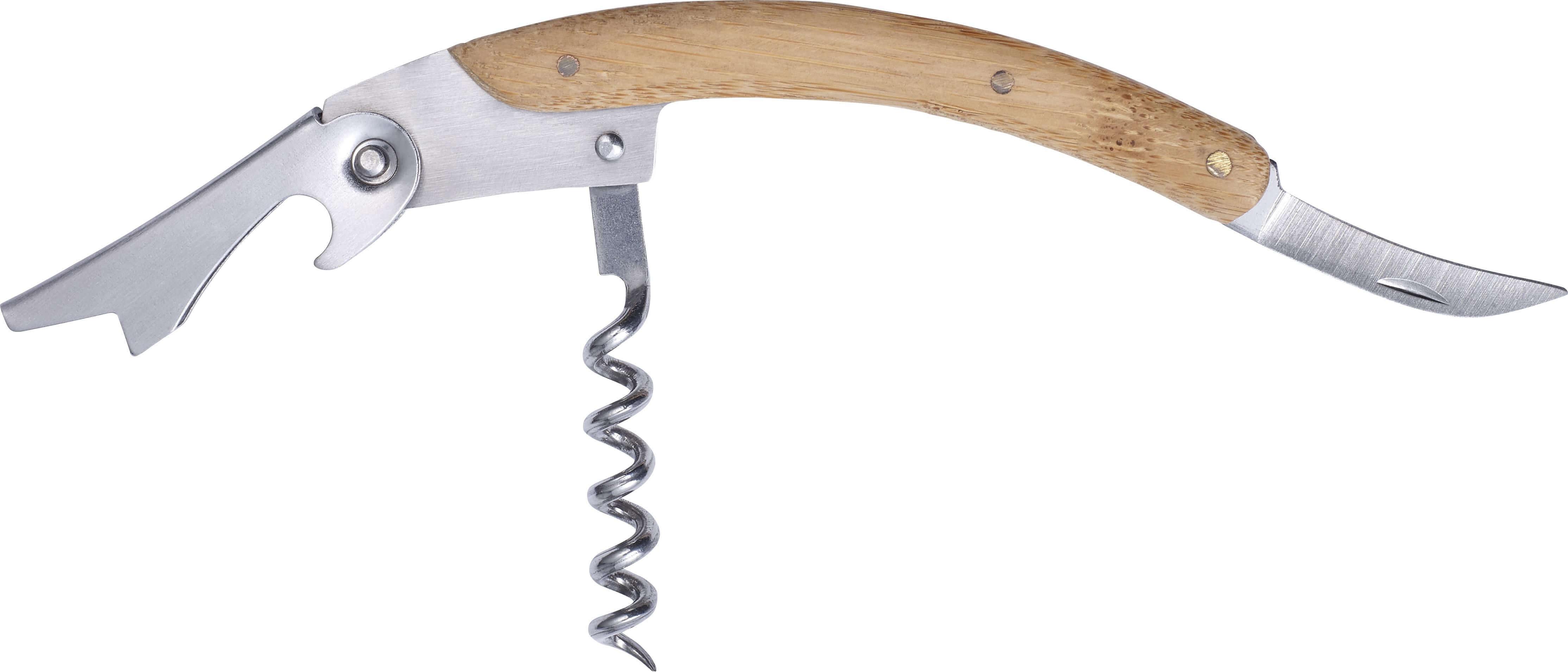 Conjunto de acessórios de vinho de aço inoxidável com detalhes de bambu. Inclui saca-rolhas, argola antigotas, e rolha. Apresentado em caixa de oferta, feita de bambu.