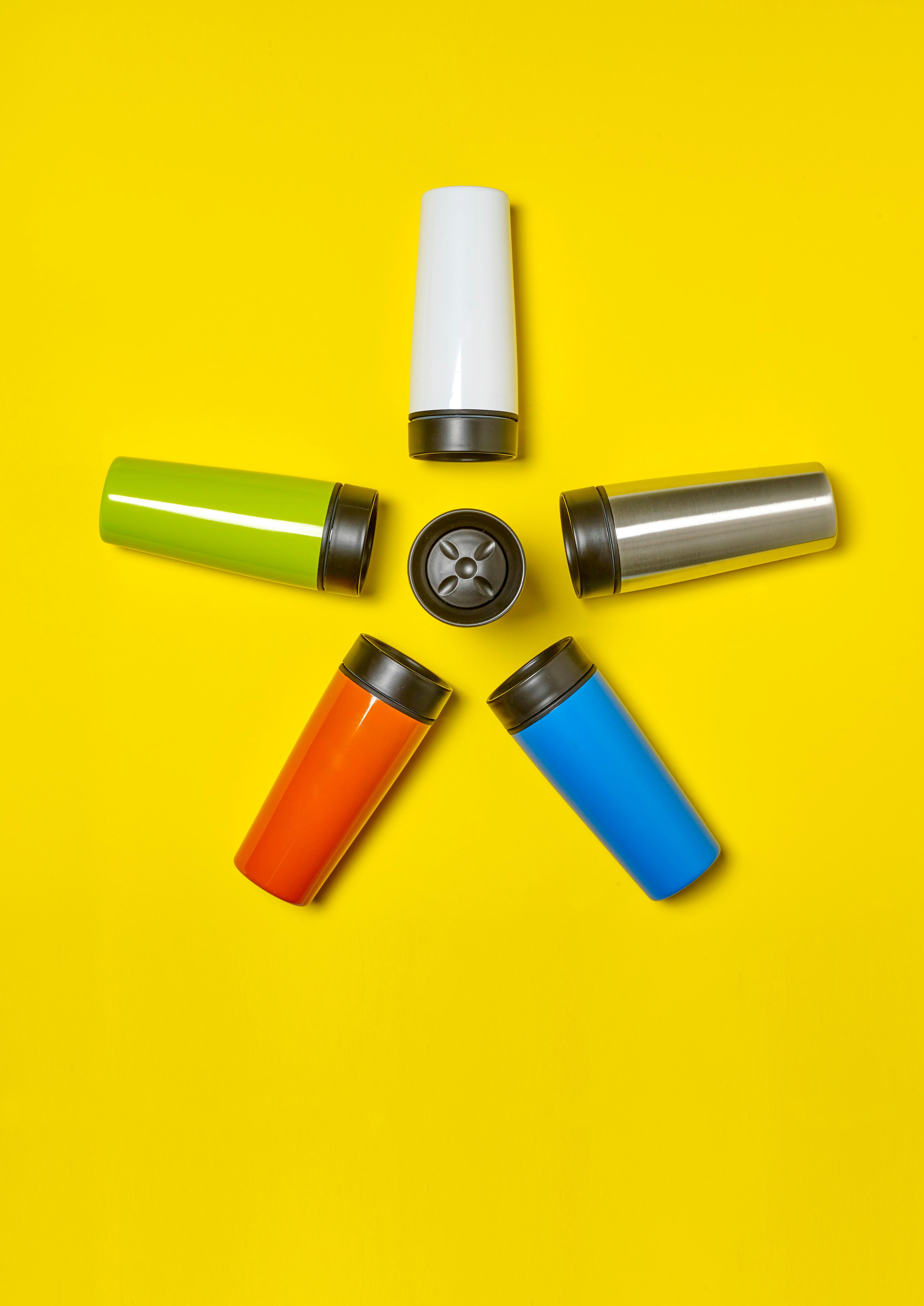 Copo isotérmico de 450 ml. em acero inoxidável de parede dupla (exterior em acero inoxidável e interior de plástico), com botão no bico para servir o conteúdo. Apresentado em caixa branca.