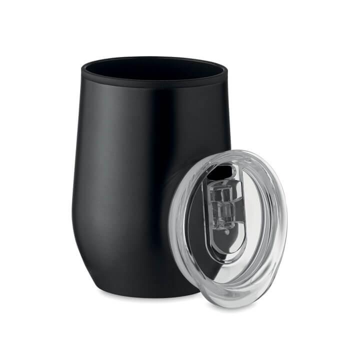 Copo de parede dupla em aço inoxidável de parede dupla com interior em PP e tampa PS transparente. Capacidade: 350 ml.