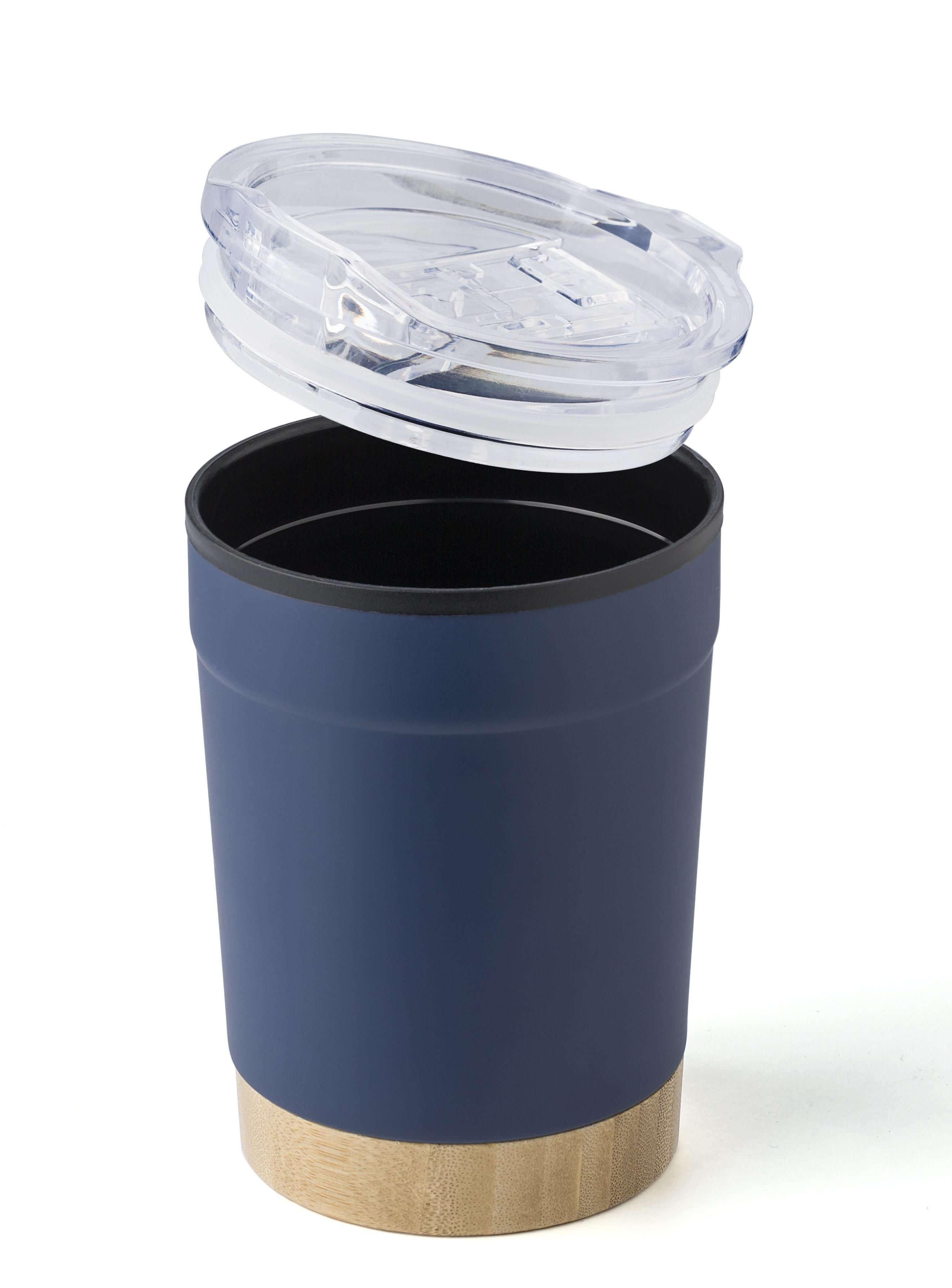 Copo de viagem em aço inoxidável (300 ml) com interior em PP e tampa em PS. Com fundo em bambu que pode ser lavado à mão. Apresentado individualmente numa caixa de cartão castanha.