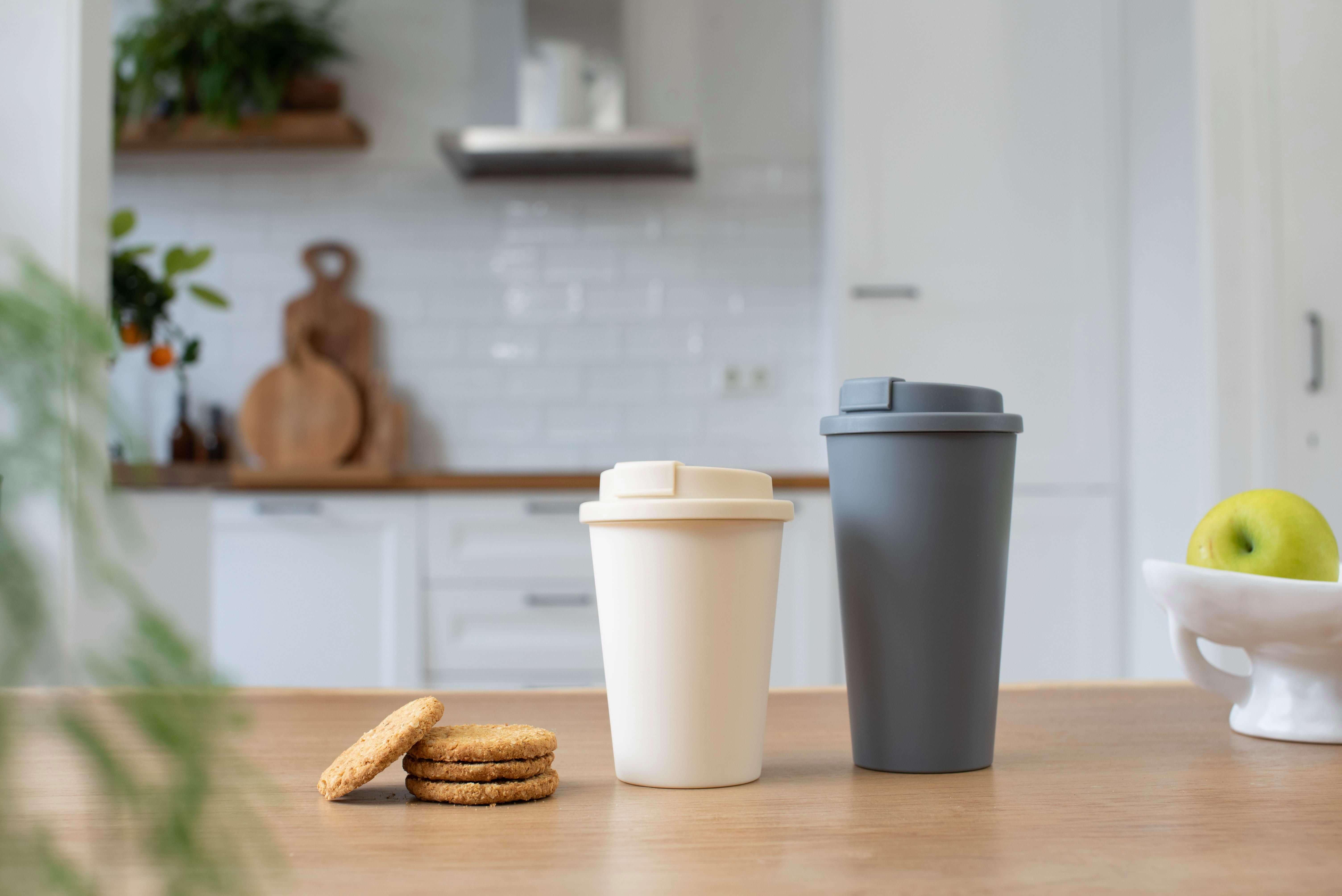 Caneca PP para levar (350 ml) com tampa de rosca. Com abertura para beber com fecho. Para líquidos quentes e frios.