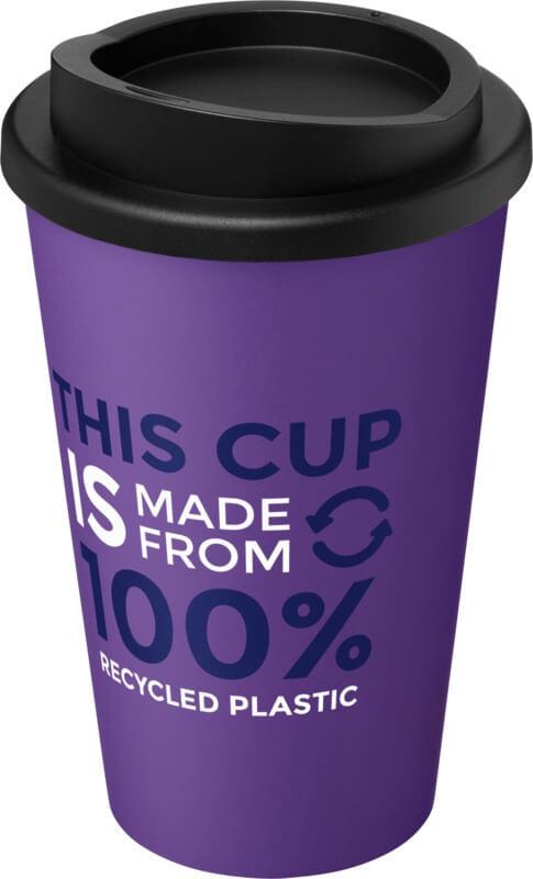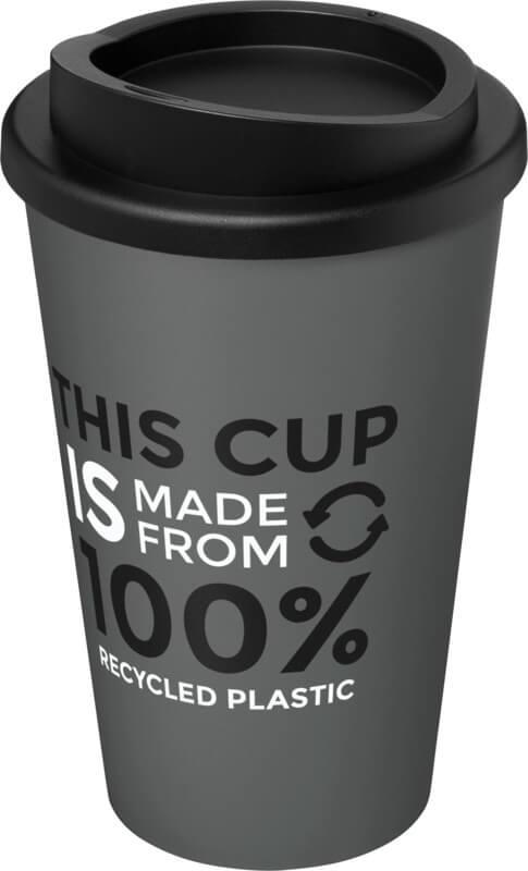 Copo isolado de parede dupla feito de plástico 100% reciclado. A tampa giratória à prova de derramame é fechada para evitar derramame é fabricada sem silicone para o copo ser totalmente reciclável. Devido à natureza do plástico reciclado, pode haver pequenas variações de cor. A capacidade de volume é de 350 ml. Fabricado no Reino Unido. Embalado saco biodegradável.BPA free. Apto para máquina de lavar louça.