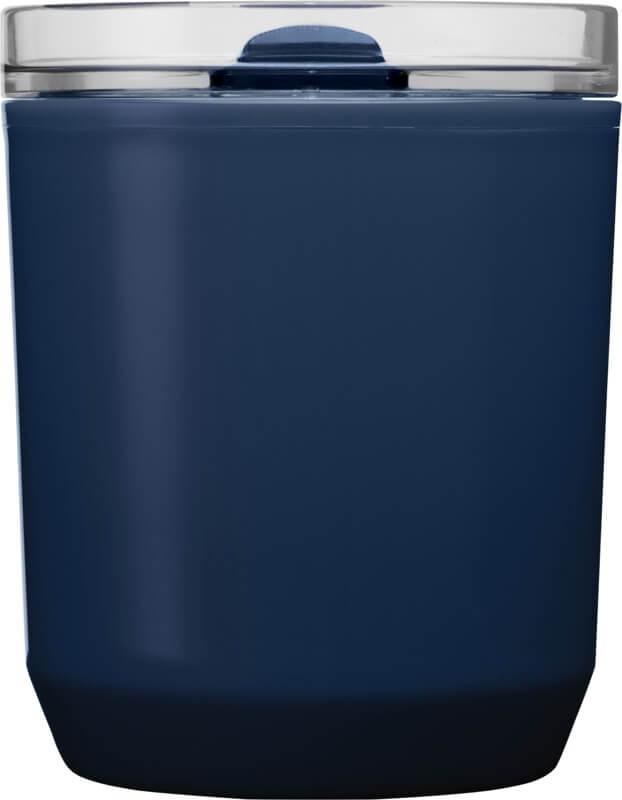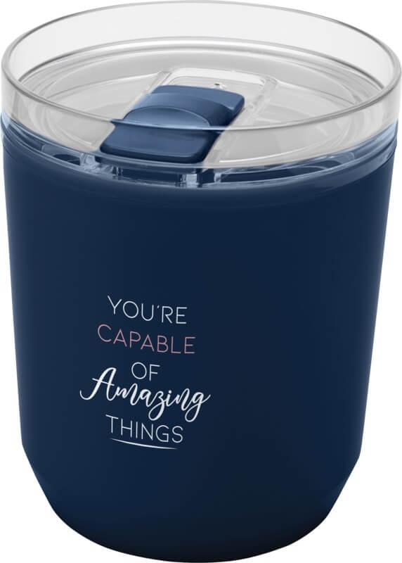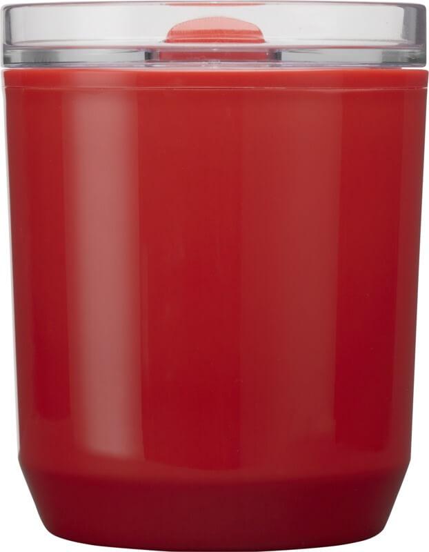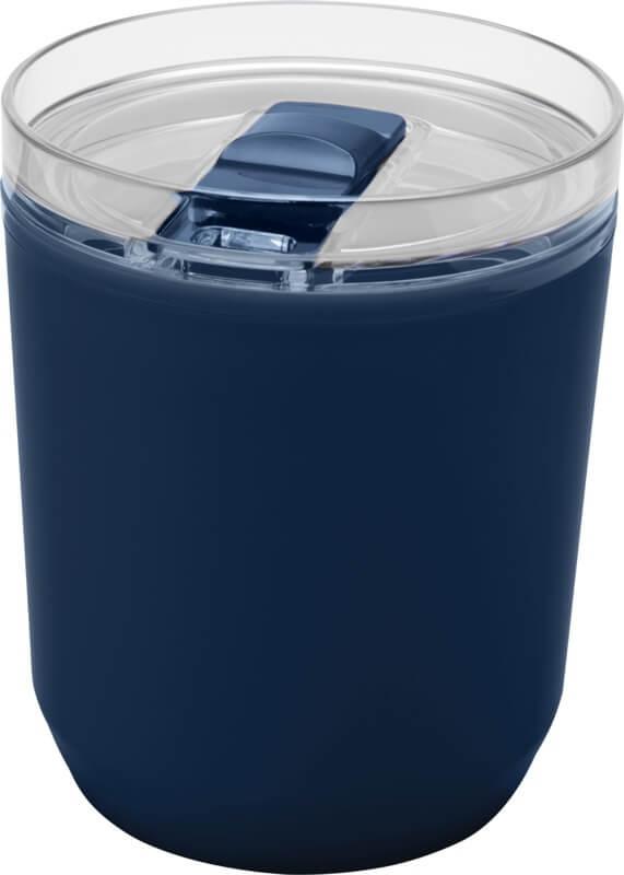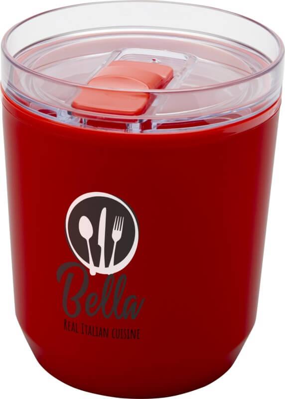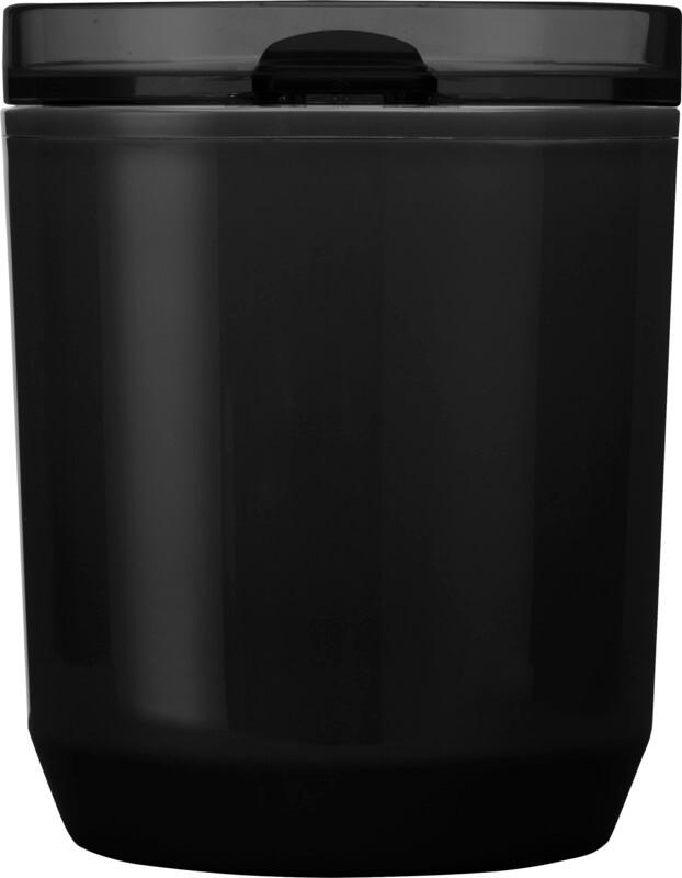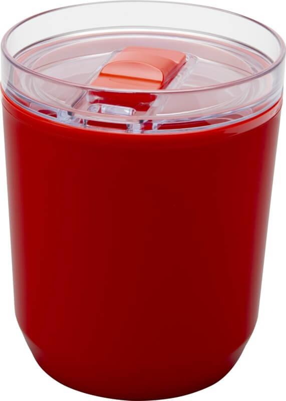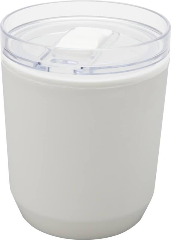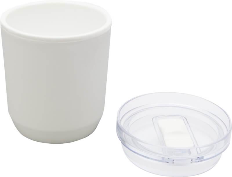 Copo térmico com um design simples que cabe na maioria das máquinas de café e porta-copos de carros. Apresenta uma construção de parede dupla com um exterior de plástico polipropileno reciclado e um interior de plástico PP. A tampa deslizante é feita de AS e plástico PP. Capacidade volumétrica: 180 ml.