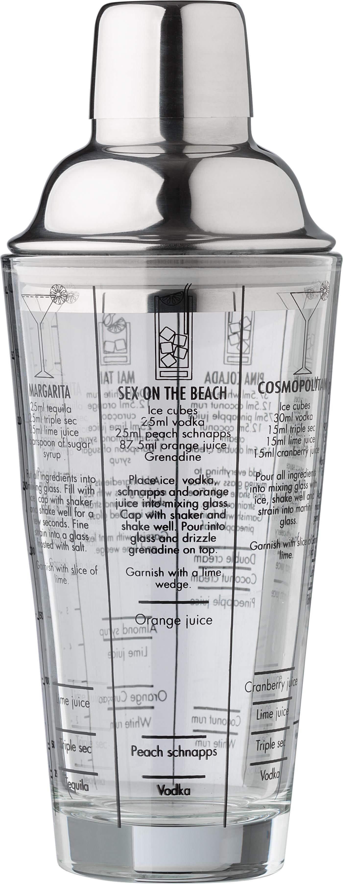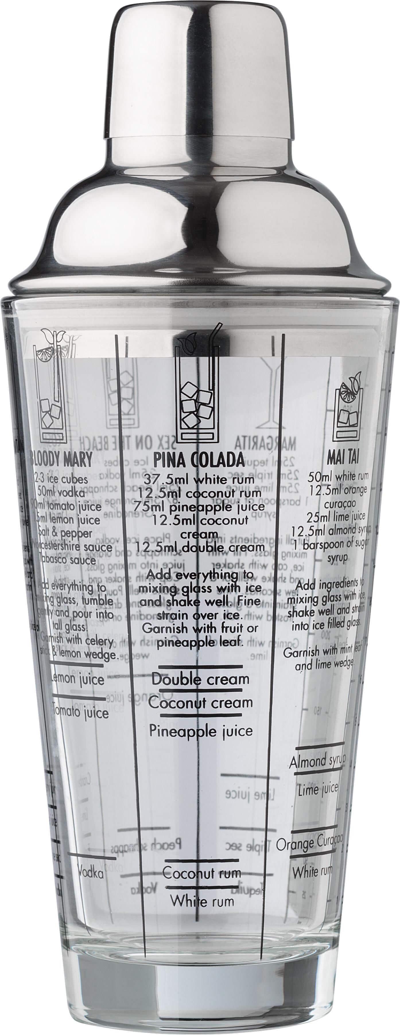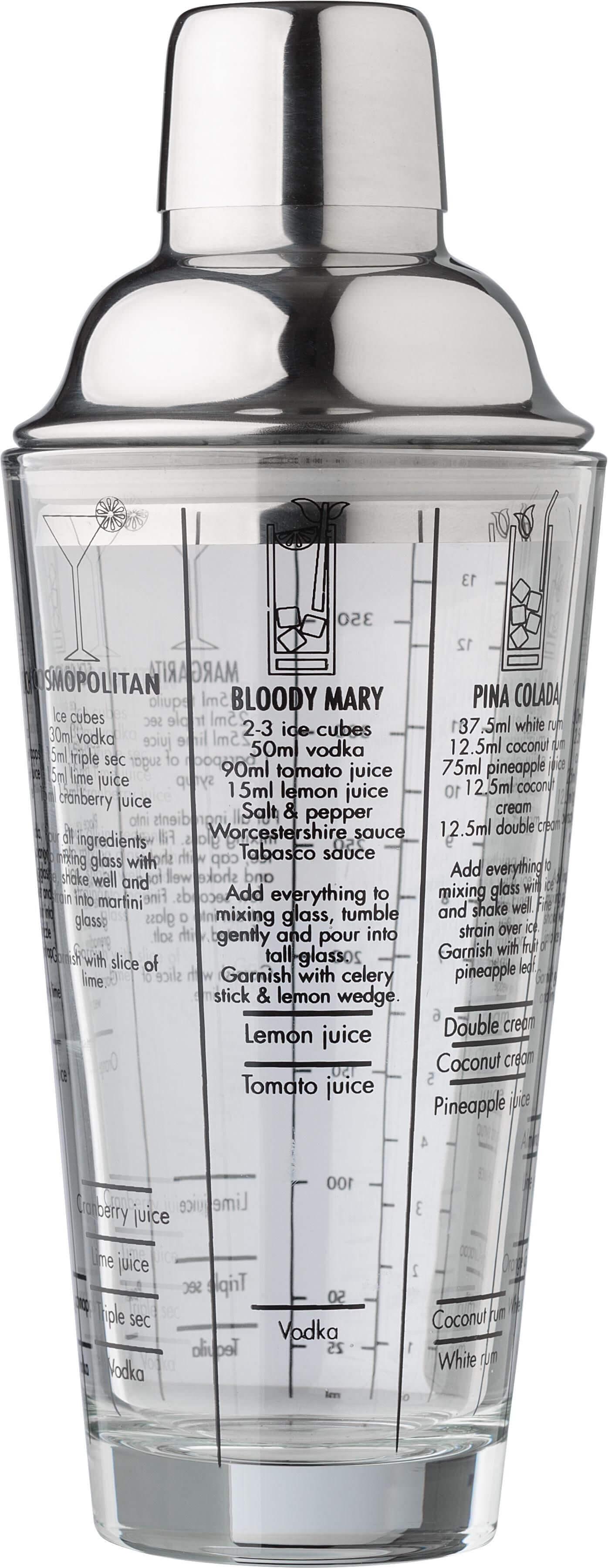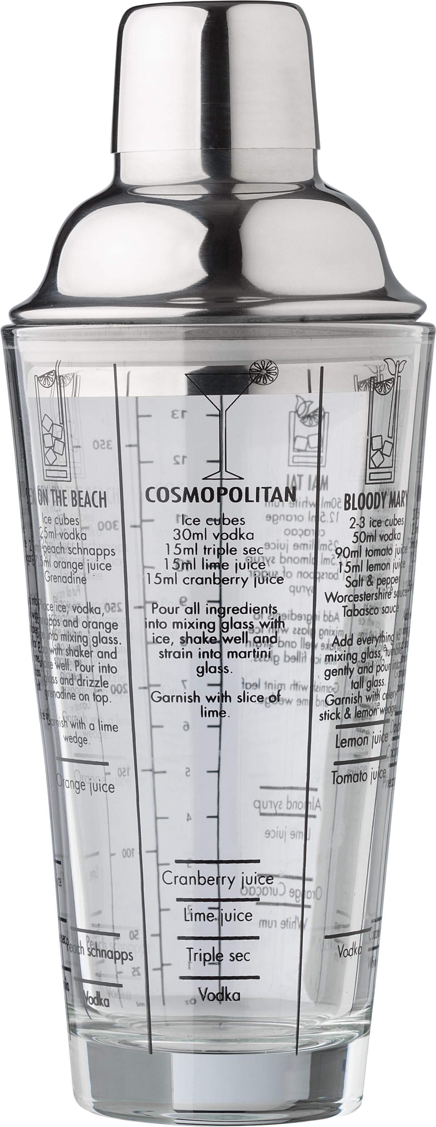 Coqueteleira de vidro (400 ml) com tampa de aço inoxidável (s/s304). Receitas de cocktails impressas na parte lateral. Apresentado individualmente numa caixa de cartão castanha.
