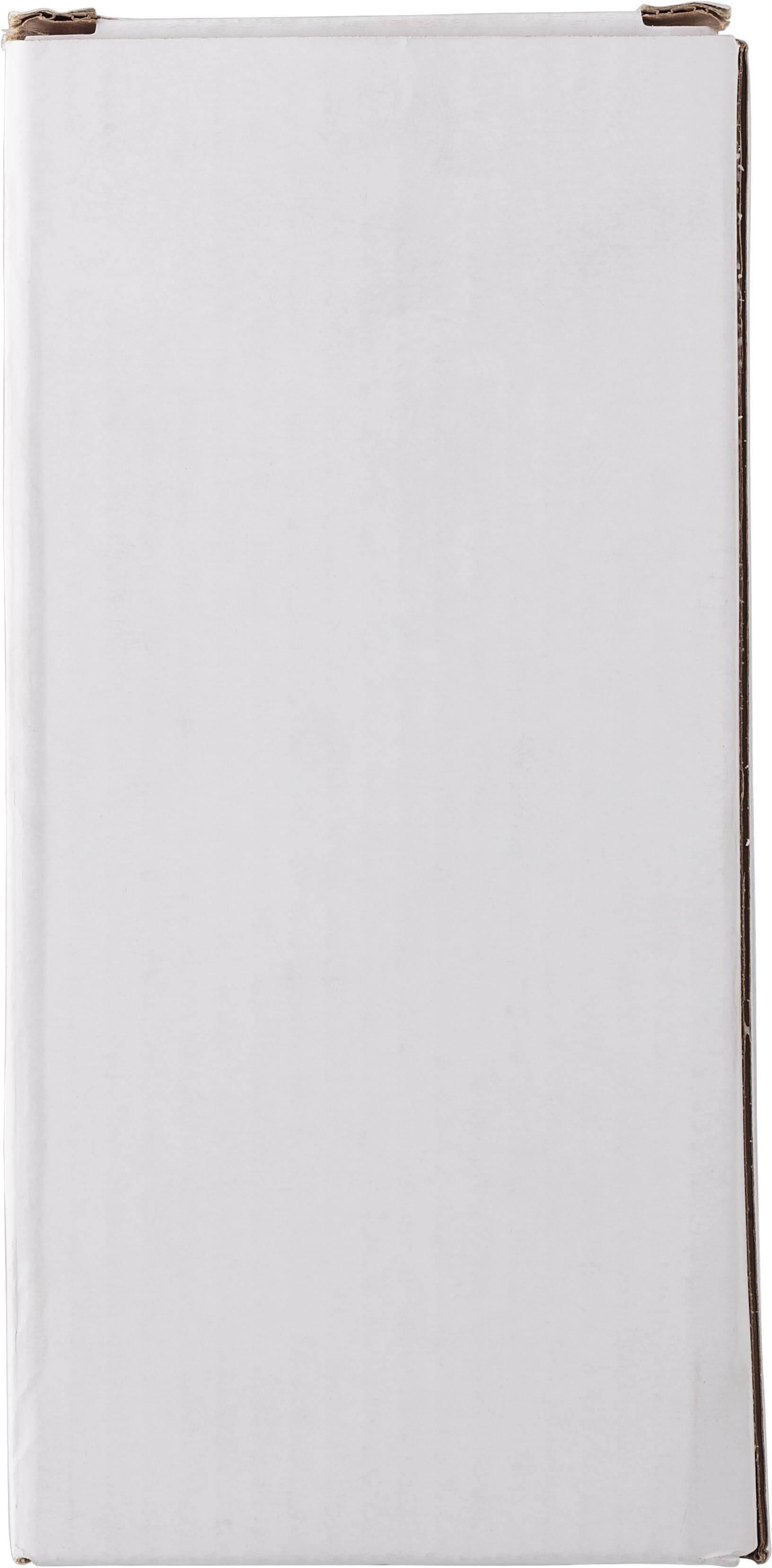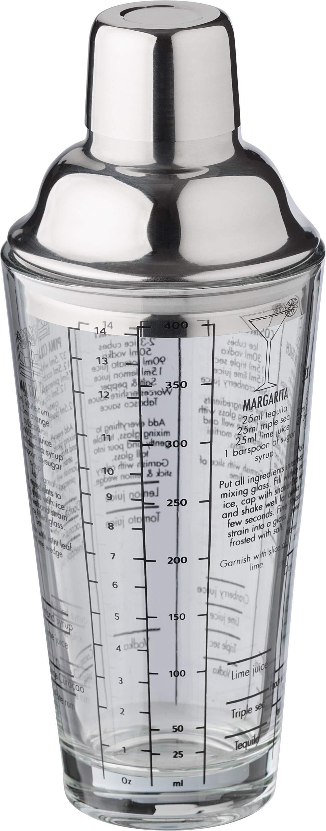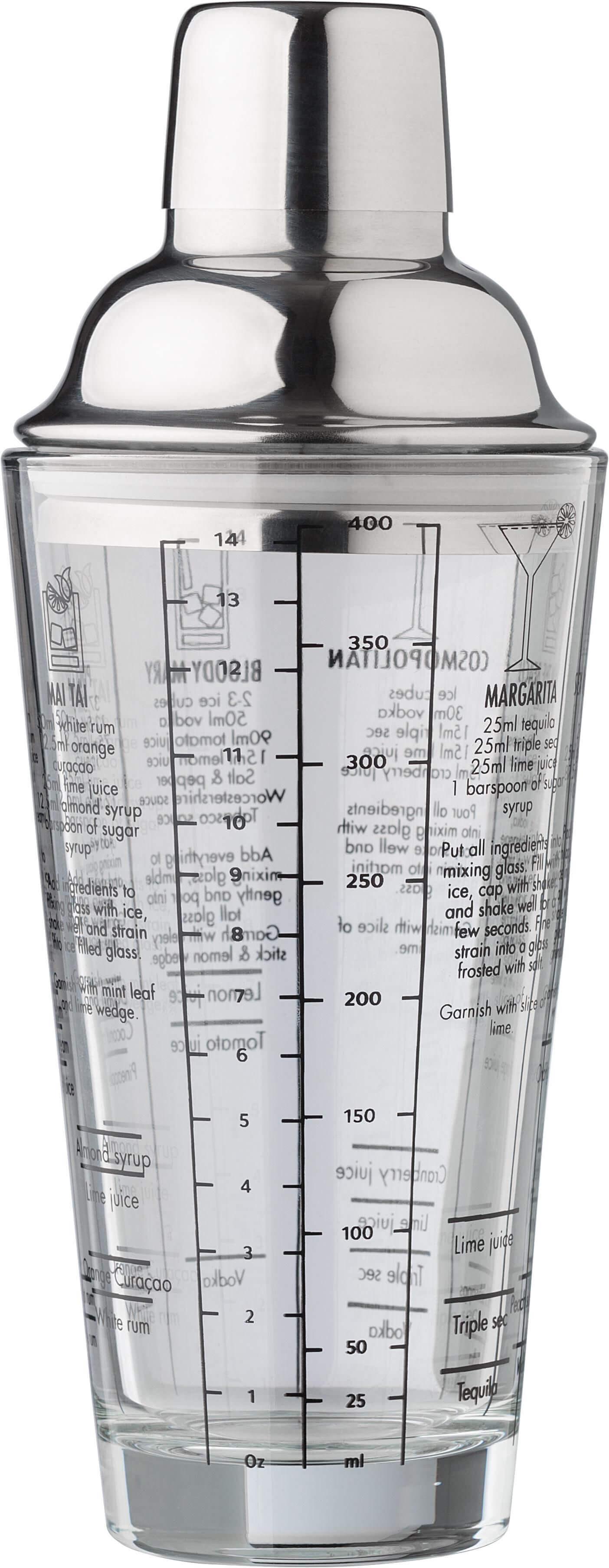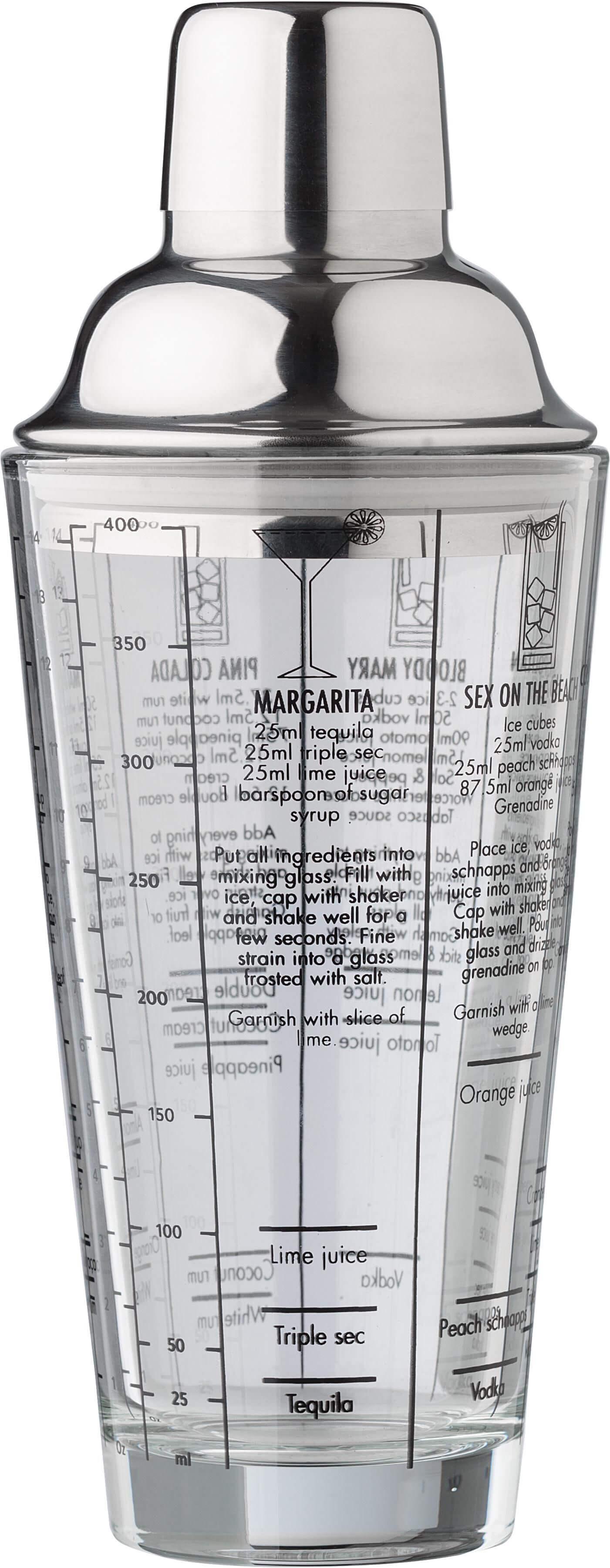 Coqueteleira de vidro (400 ml) com tampa de aço inoxidável (s/s304). Receitas de cocktails impressas na parte lateral. Apresentado individualmente numa caixa de cartão castanha.