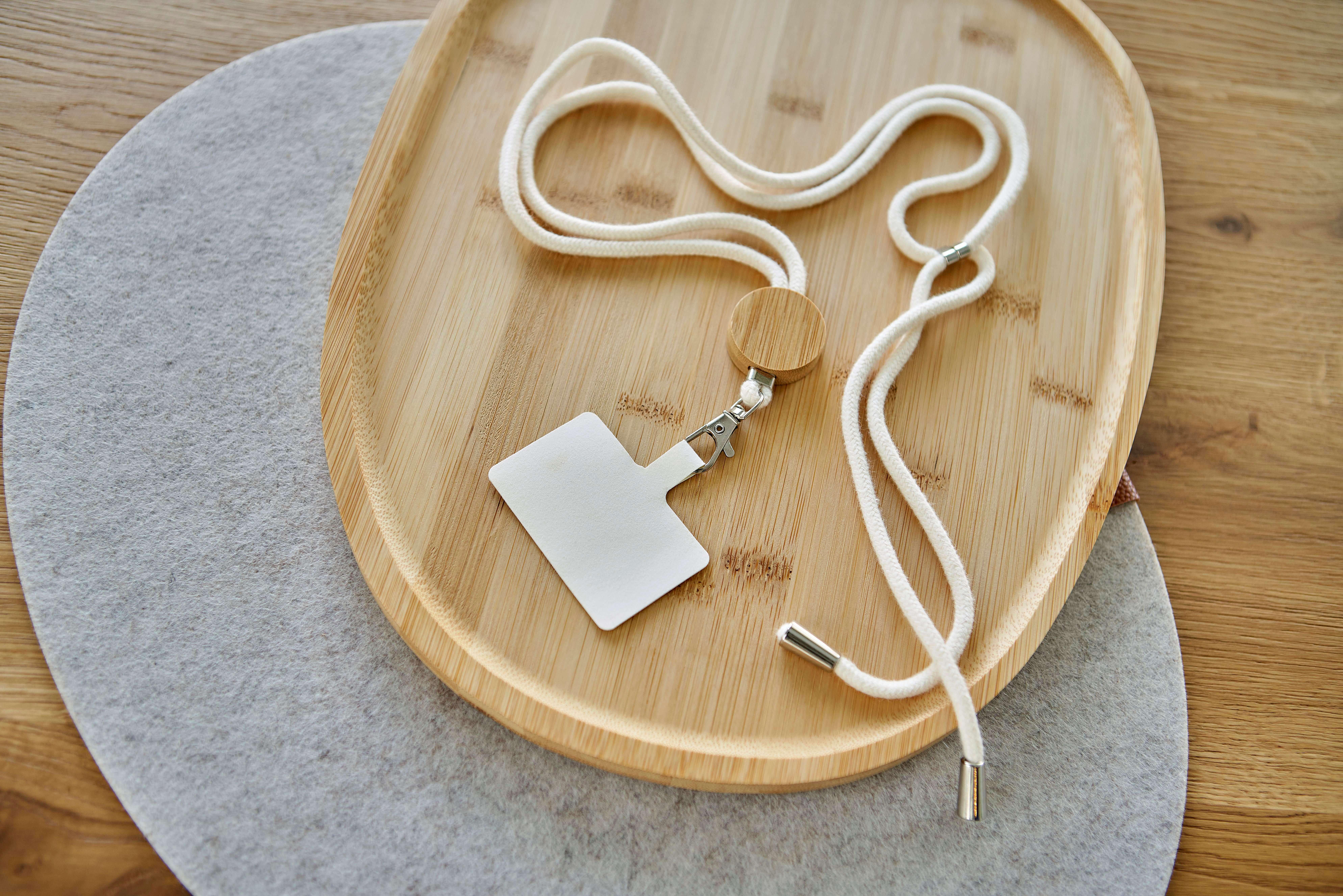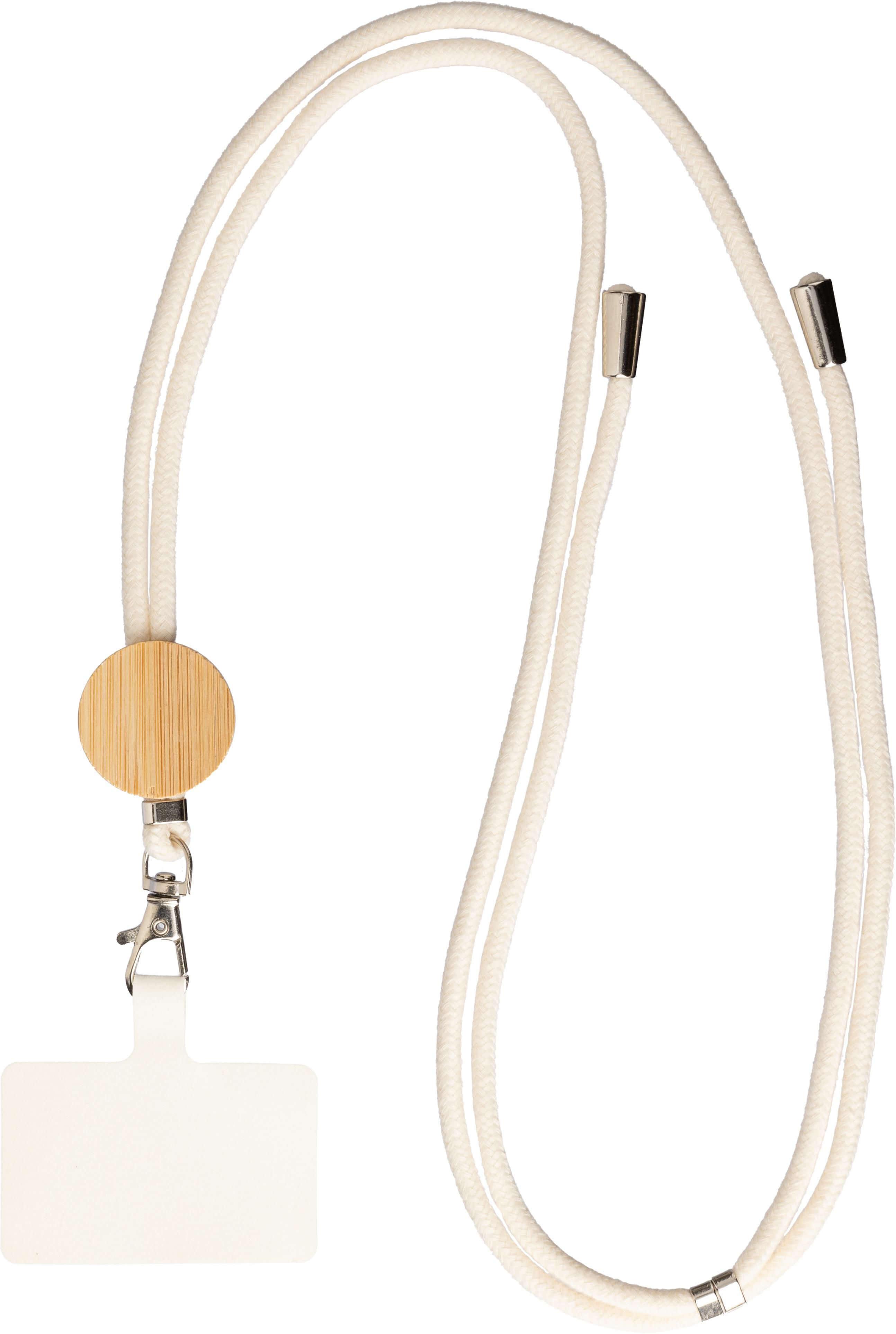 Lanyard de algodão com uma placa de impressão redonda em bambu. Inclui um mosquetão metálico para um telemóvel.