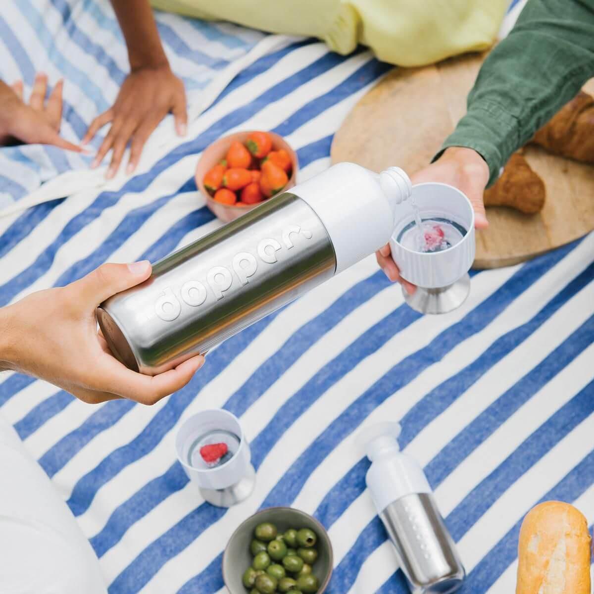 ‘Preserve as águas cristalinas com o Dopper Steel 1.1L. Este cavaleiro de armadura brilhante é robusto, tem um look espetacular, e é ideal para colocar no seu saco de desporto. Essencial para aqueles que amam o desporto e as atividades ao ar livre!O Dopper Steel tem um conteúdo de 1.1L e possui três componentes de limpeza fácil. Pode ser lavado na máquina de lavar louça até 65°C / 149°F e deve ser usado apenas para água da torneira. O Dopper Steel é fabricado responsavelmente na China (Código de conduta BSCI) e é Cradle to Cradle Certified com nível de Bronze. Isento de BPA e ftalatos. Atenção: não é uma garrafa térmica. ‘ Disponível apenas com personalização e em múltiplos de 6 peças.