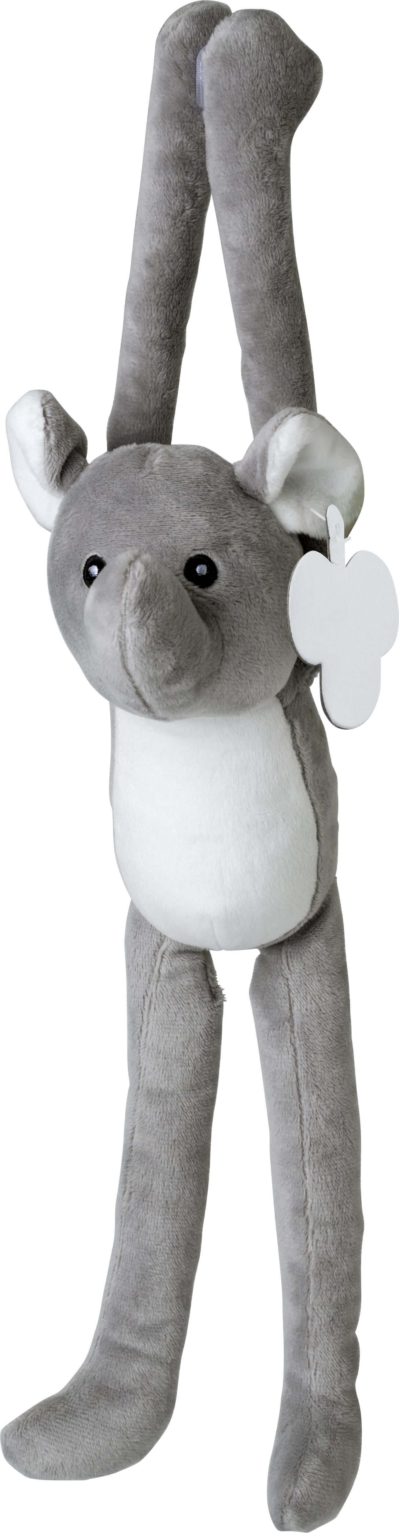 Elefante de peluche com braços compridos e fecho de velcro. Olhos bordados. Inclui etiqueta para impressão na orelha.