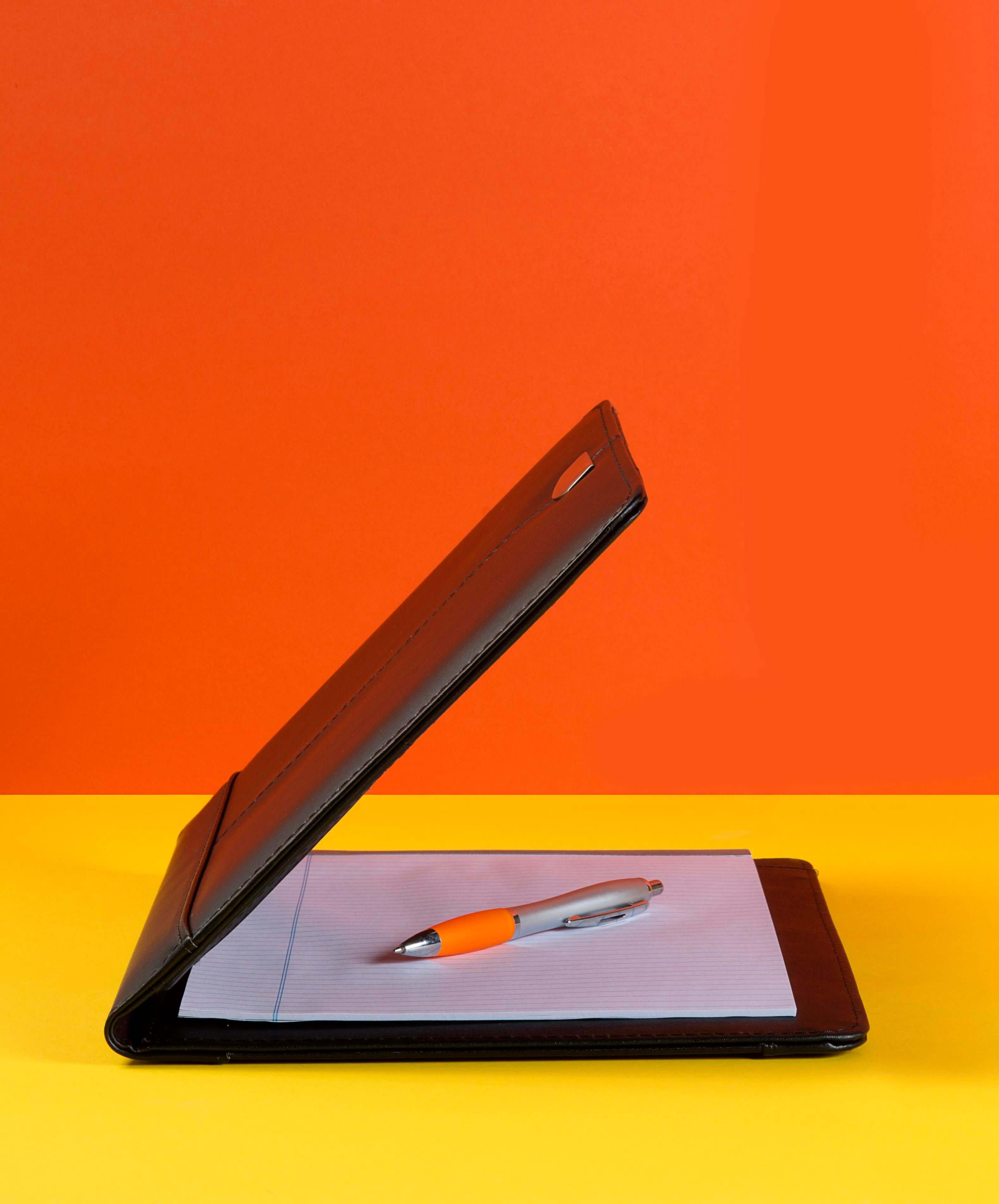 Esferográfica com corpo de plástico, clipe de metal e anti-deslizante. Escrita azul.