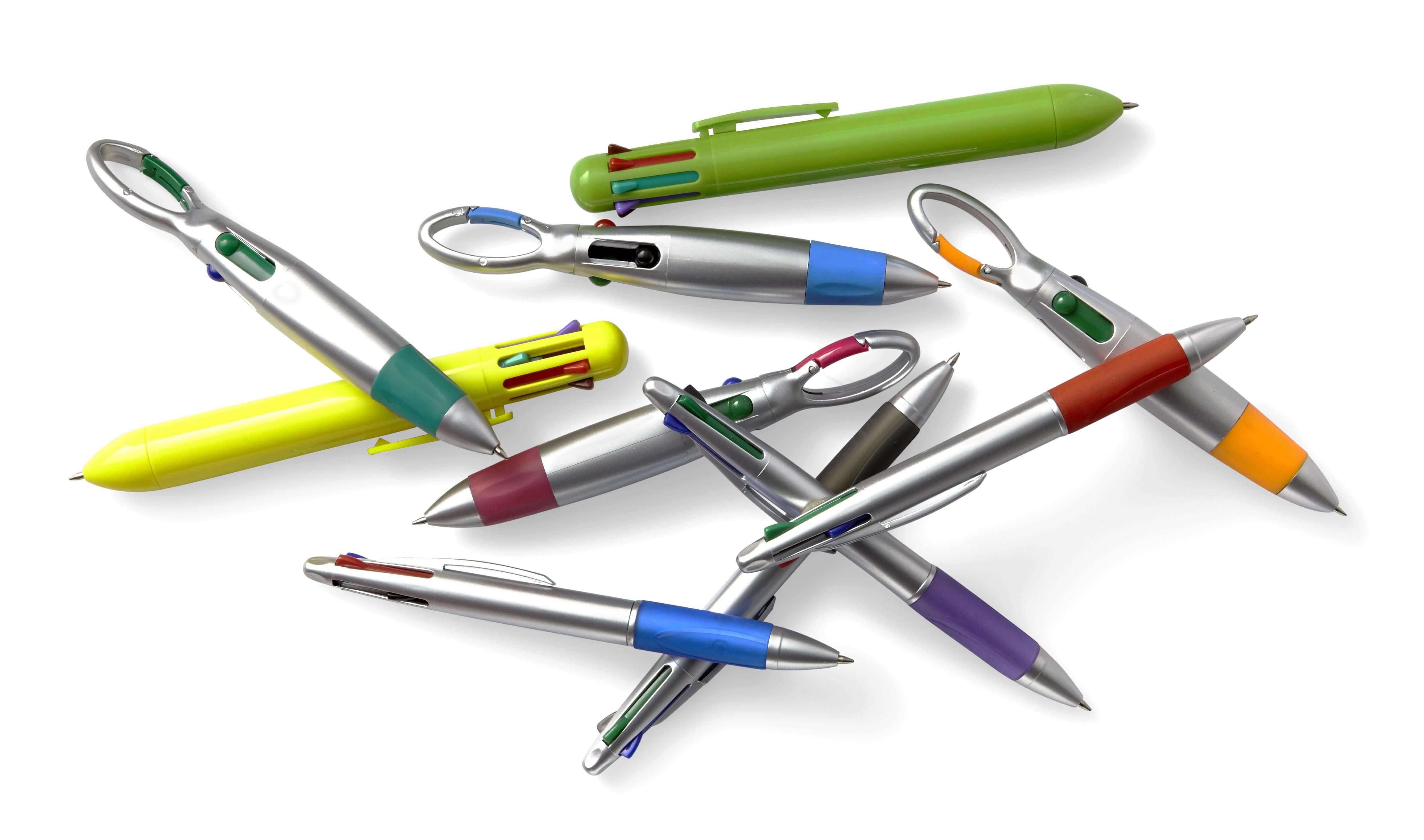 Esferográfica mosquetão de plástico com anti-deslizante em borracha. Escrita azul, preto, vermelho e verde.