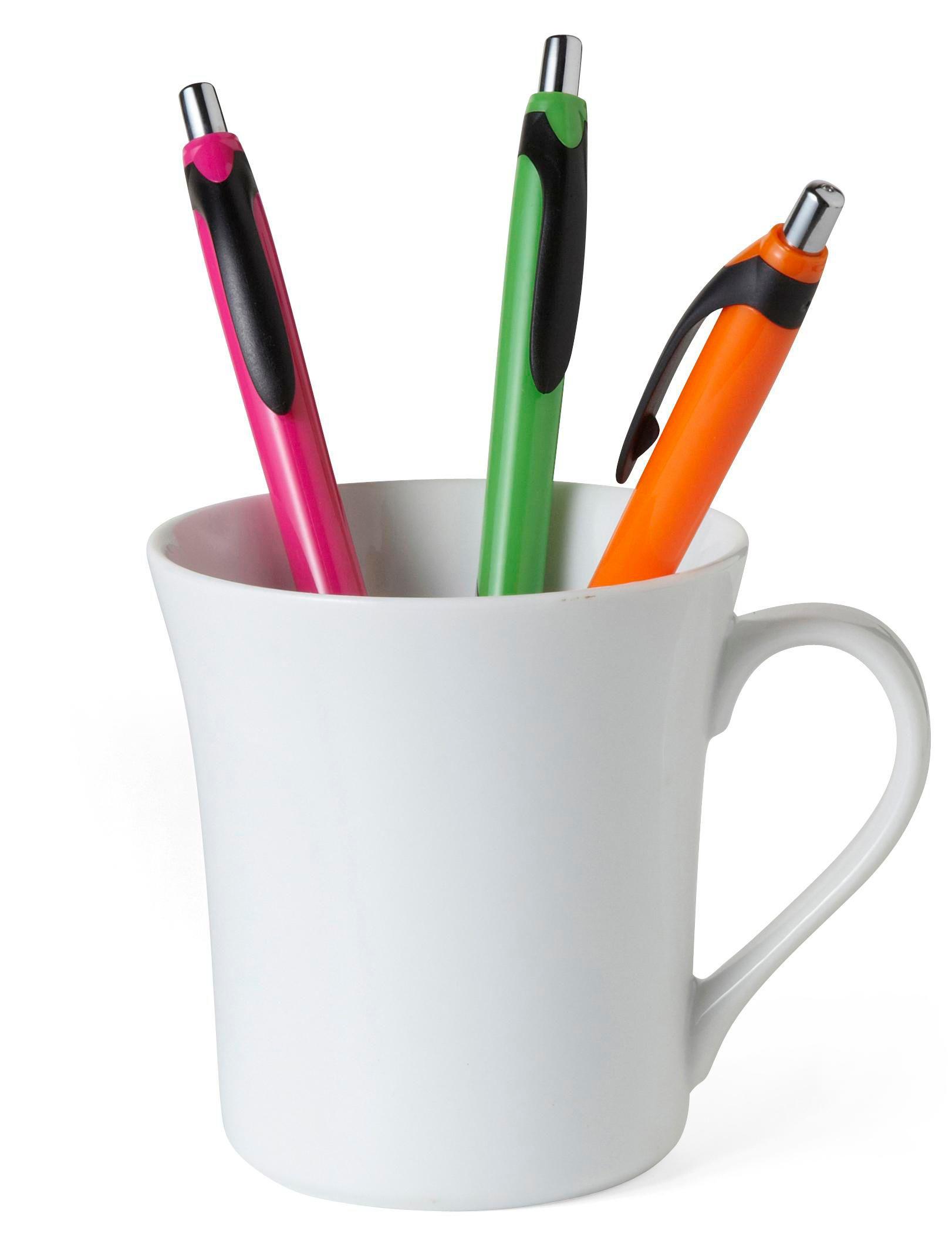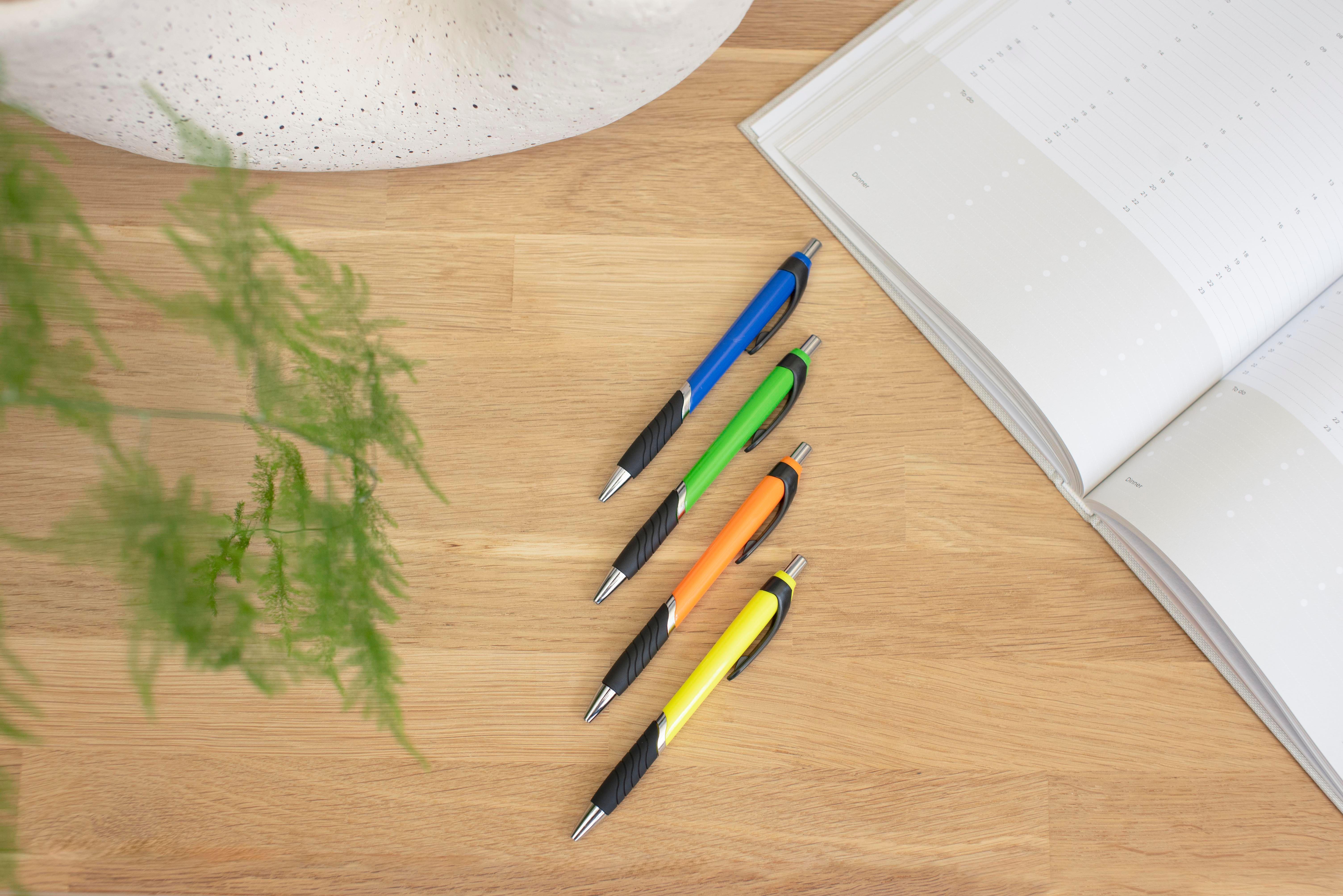 Esferográfica de plástico com anti-deslizante e botão. Escrita azul.