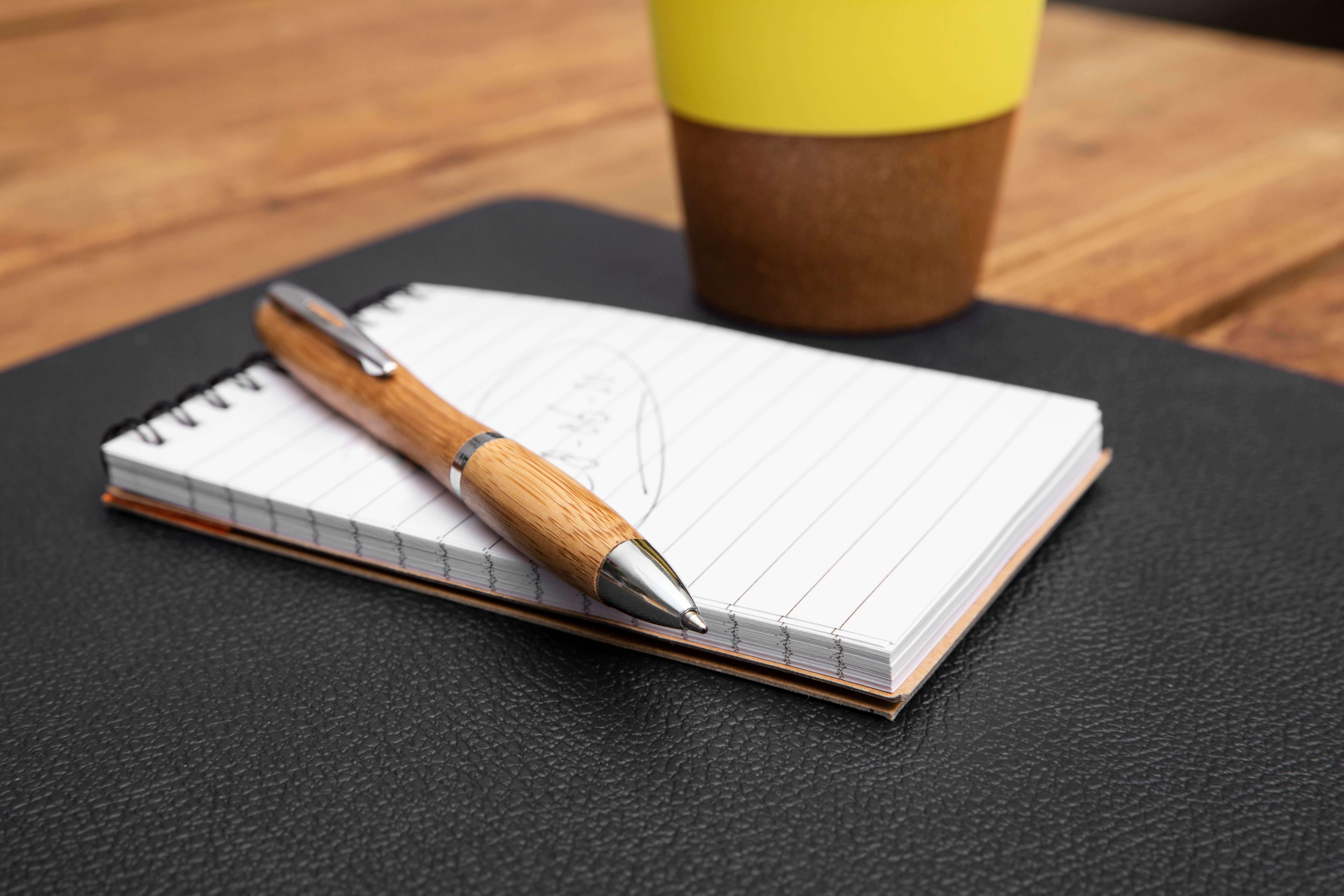 Esferográfica de bambu com ponta, tampa, clipe e anel de cor prata. Escrita preto.