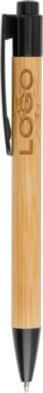 Esferográfica com corpo de bambú, ponta e clipe de plástico. Escrita azul.