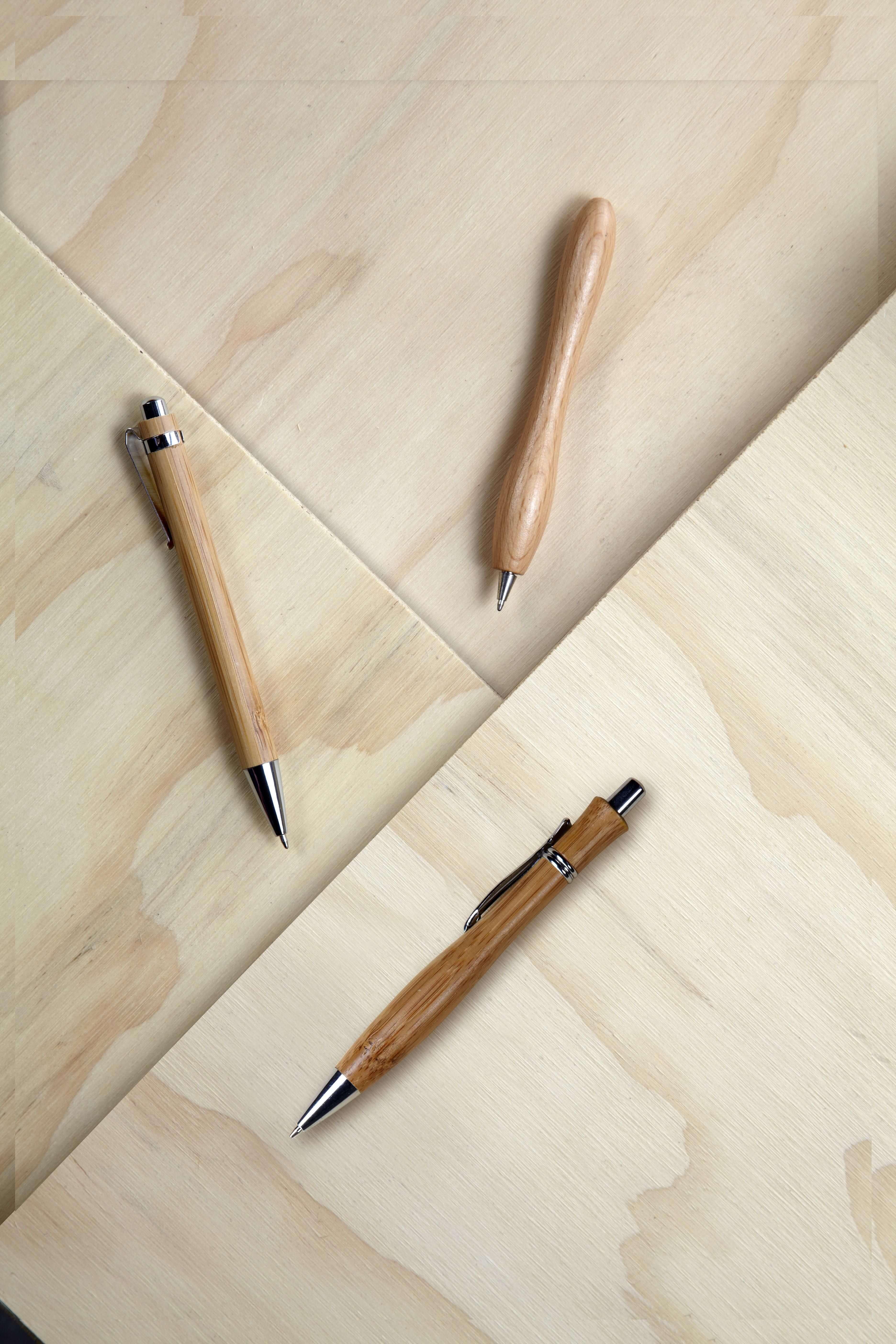 Esferográfica de bambu com detalhes de metal. Escrita preto.
