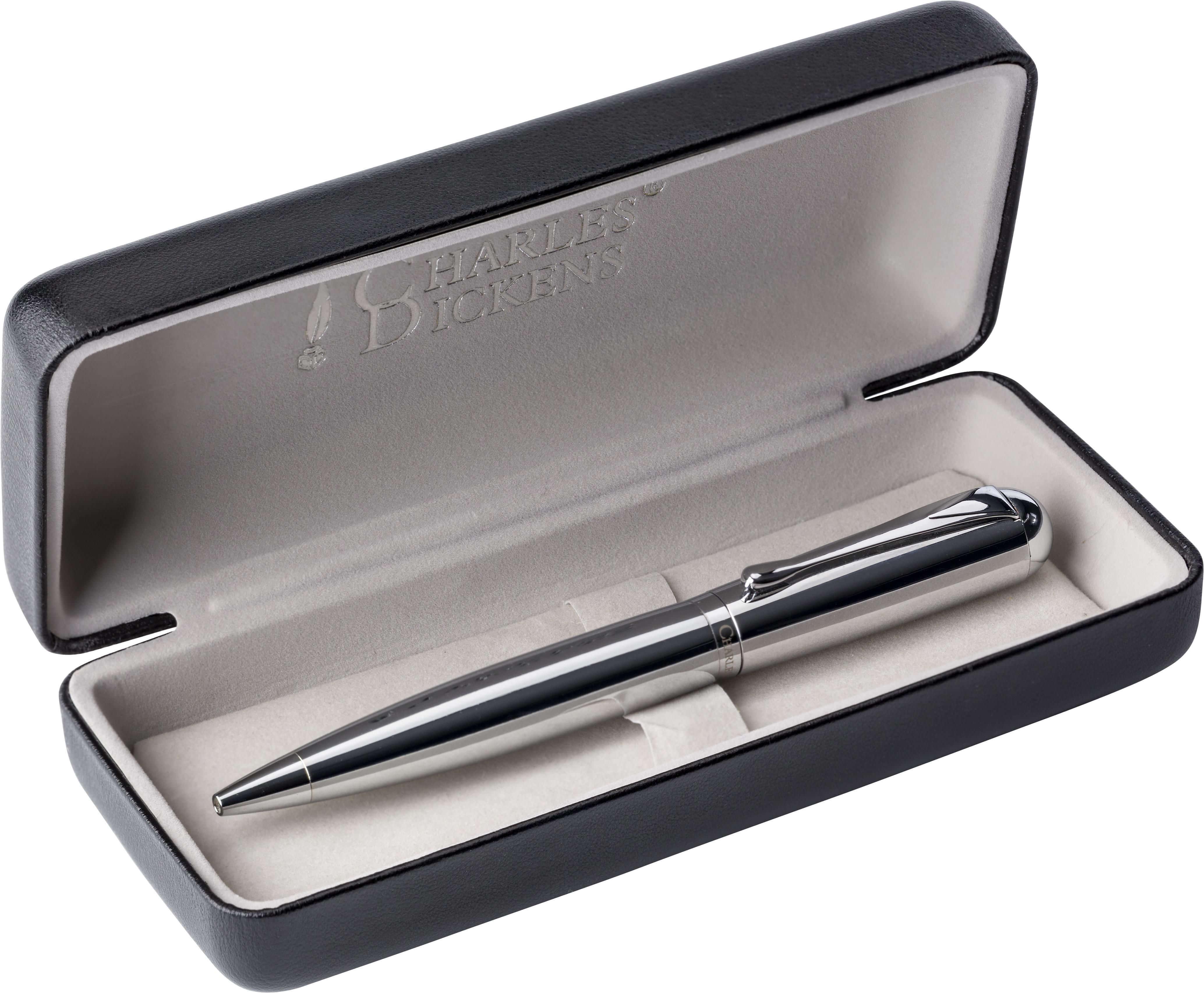 Esferográfica Charles Dickens® de metal com mecanismo giratório em estojo de oferta. Escrita preto.