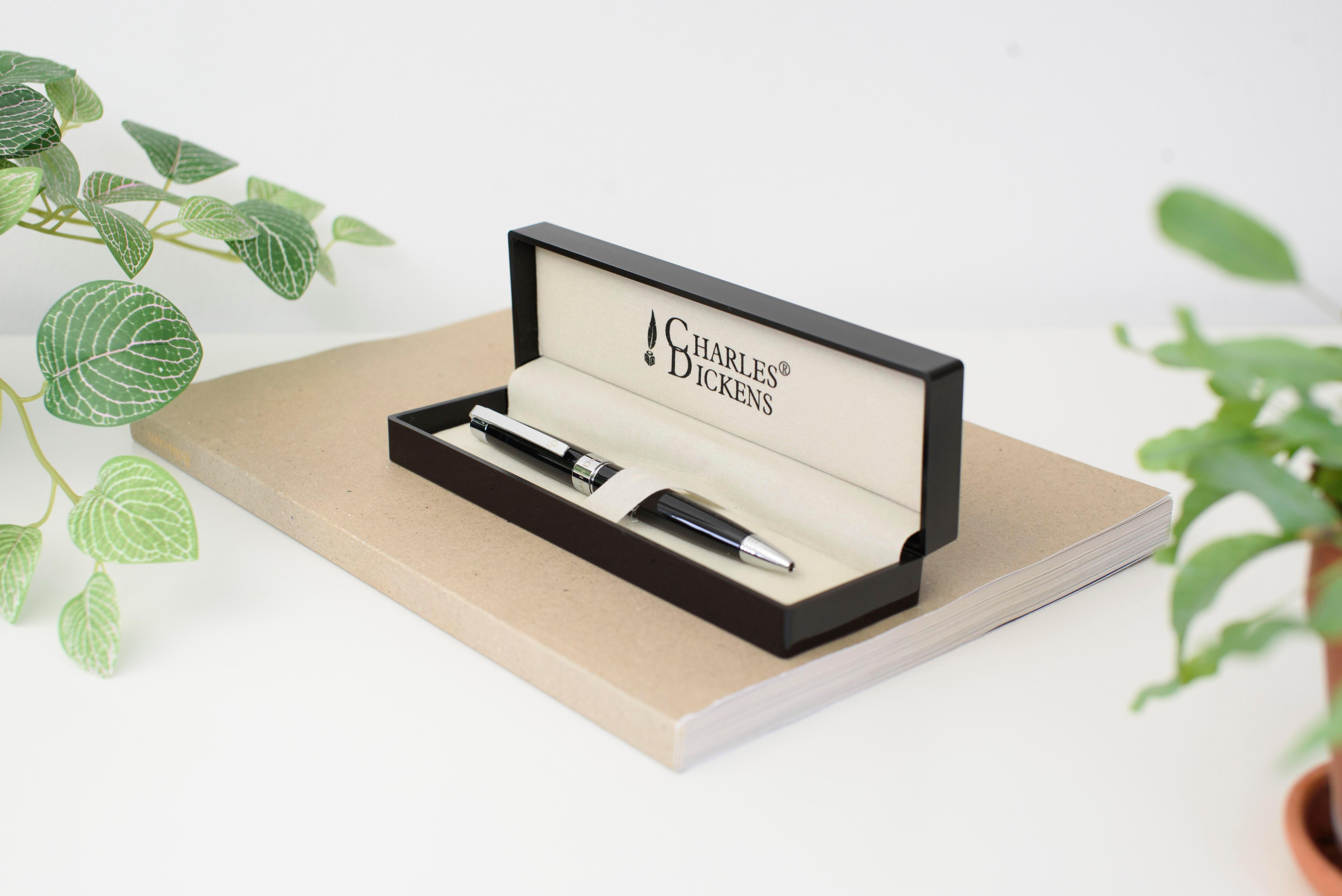 Esferográfica de metal lacado com mecanismo giratório, apresentado em estojo de oferta. Escrita preto.