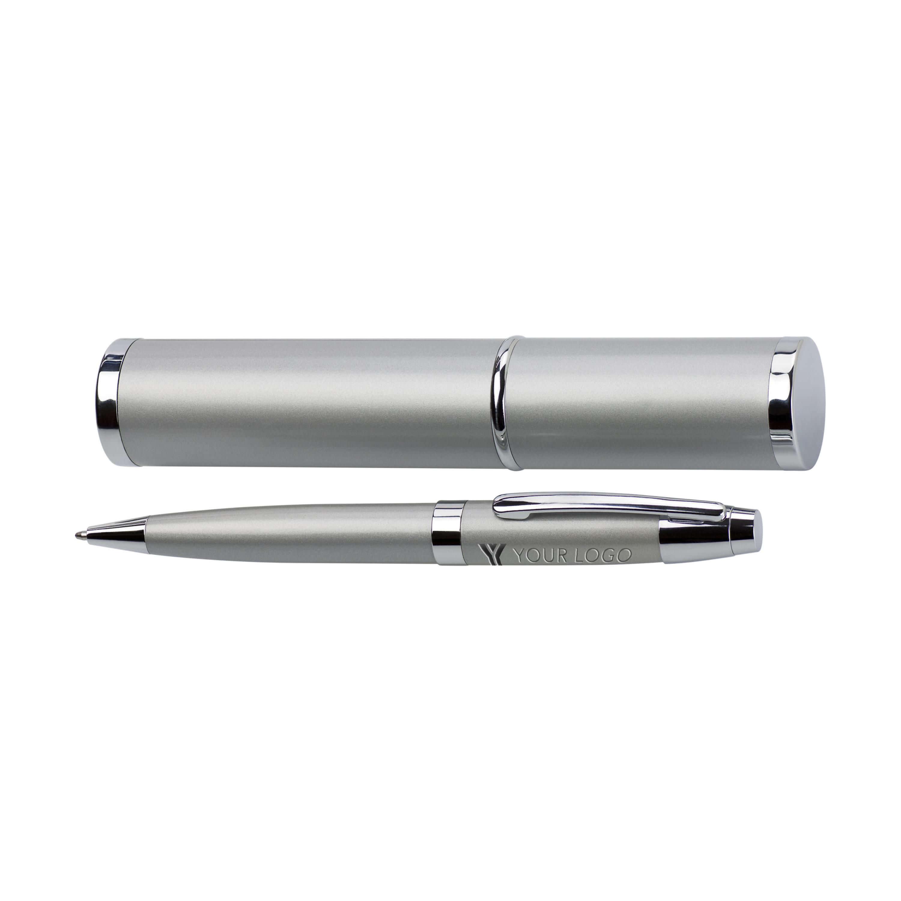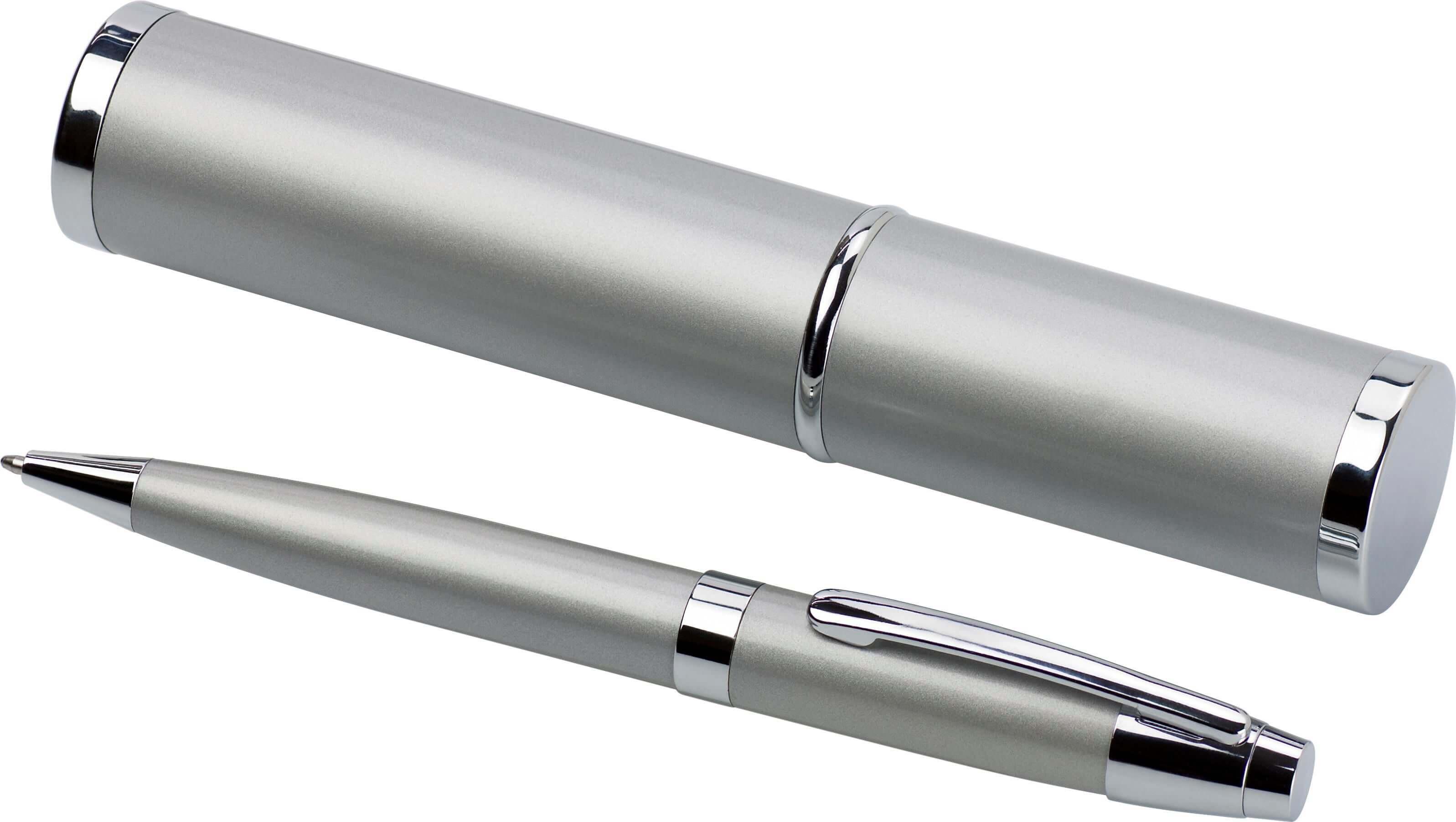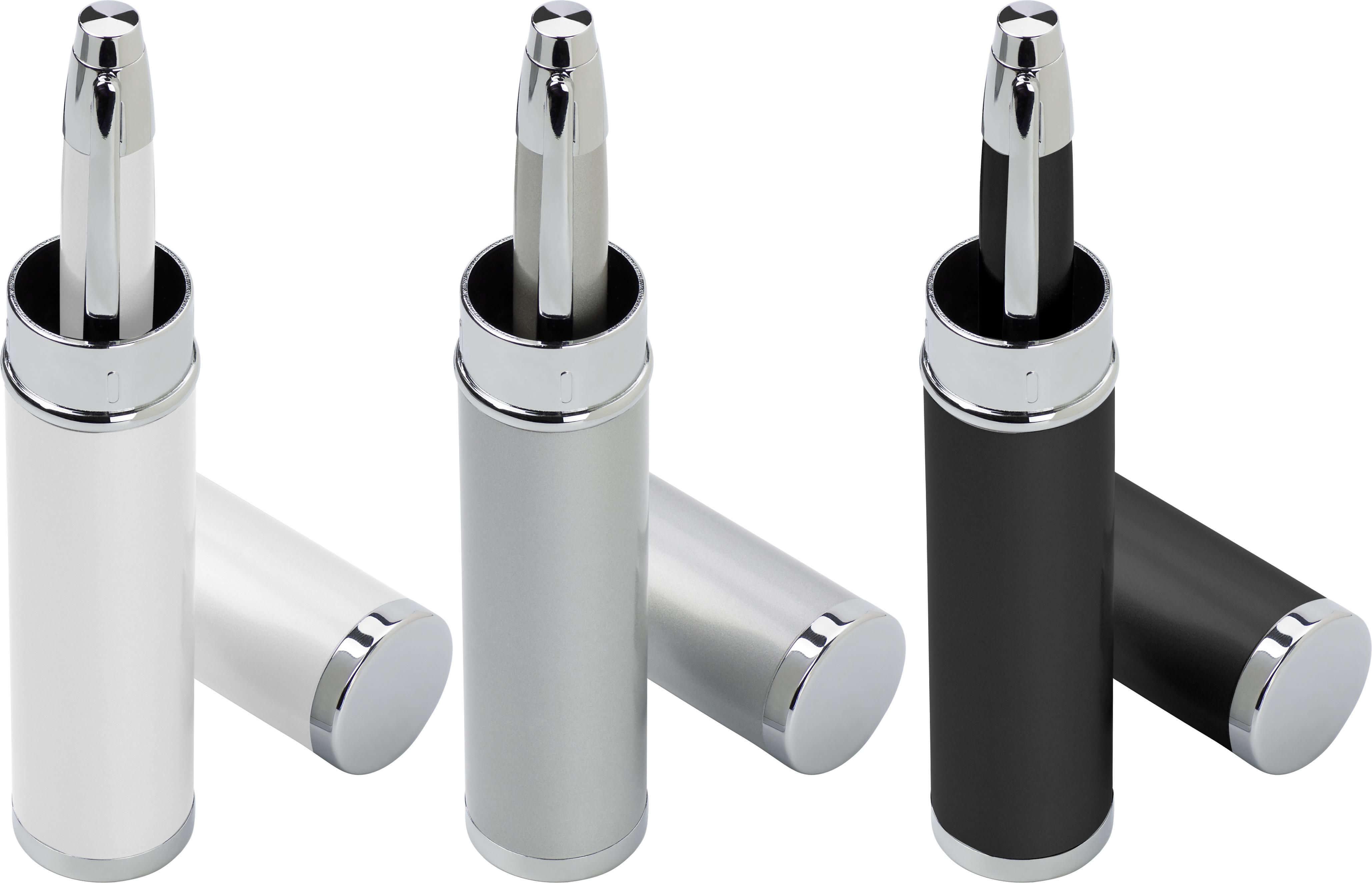 Esferográfica com base de níquel e detalhes de cor prata. Exibido em luxuoso estojo em forma de tubo de cor a condizer com a esferográfica. Escrita preto.