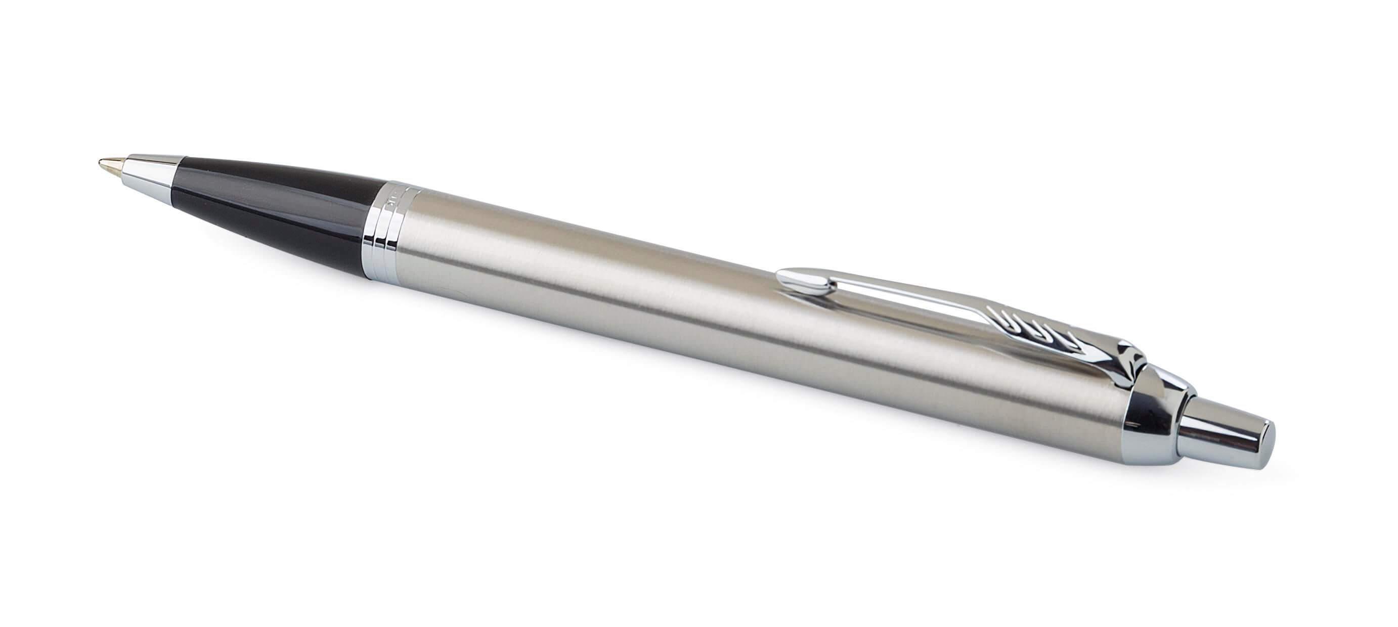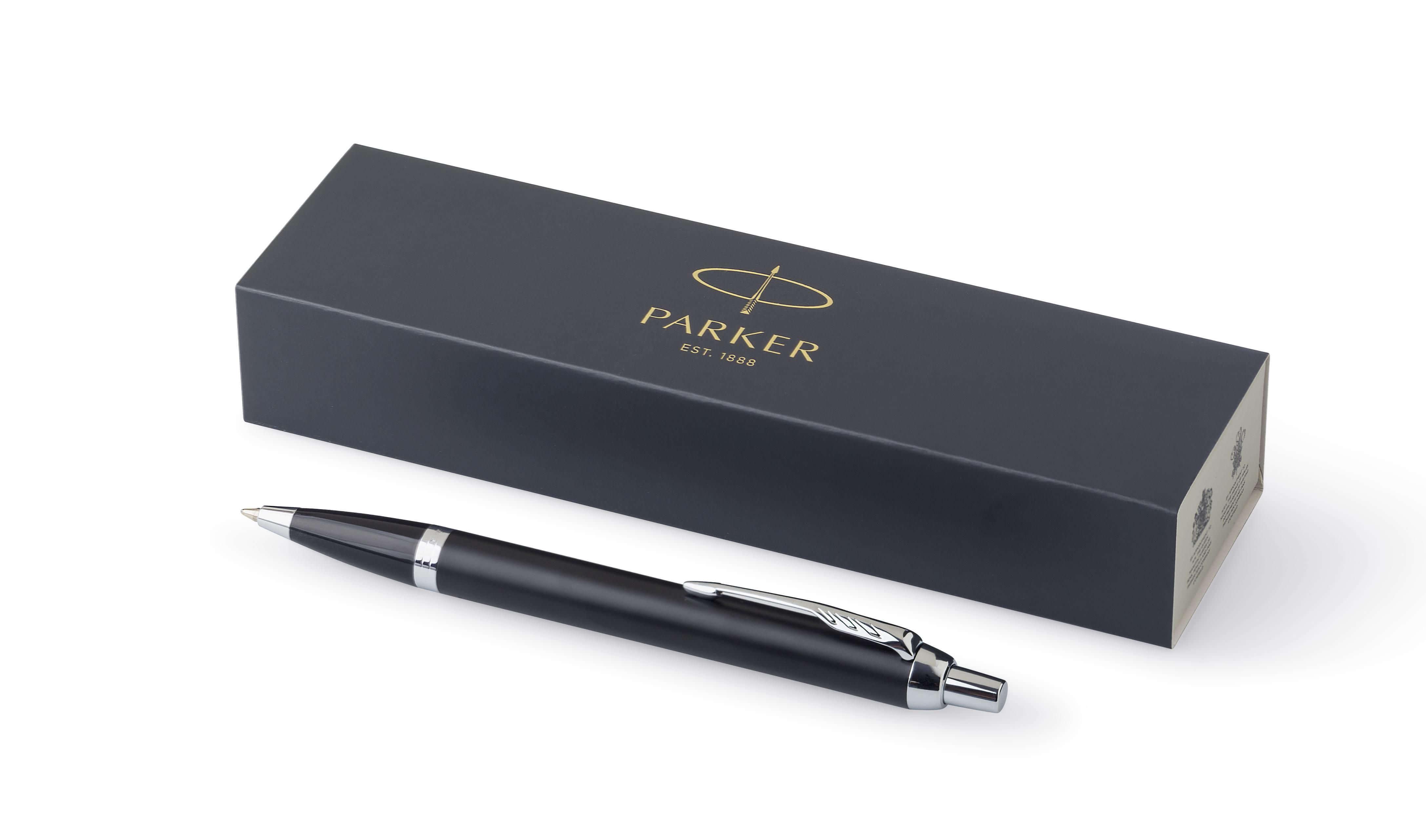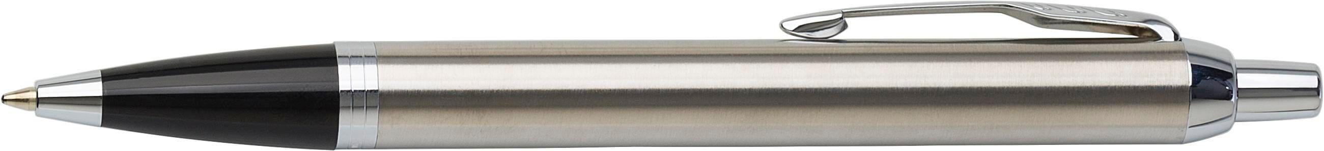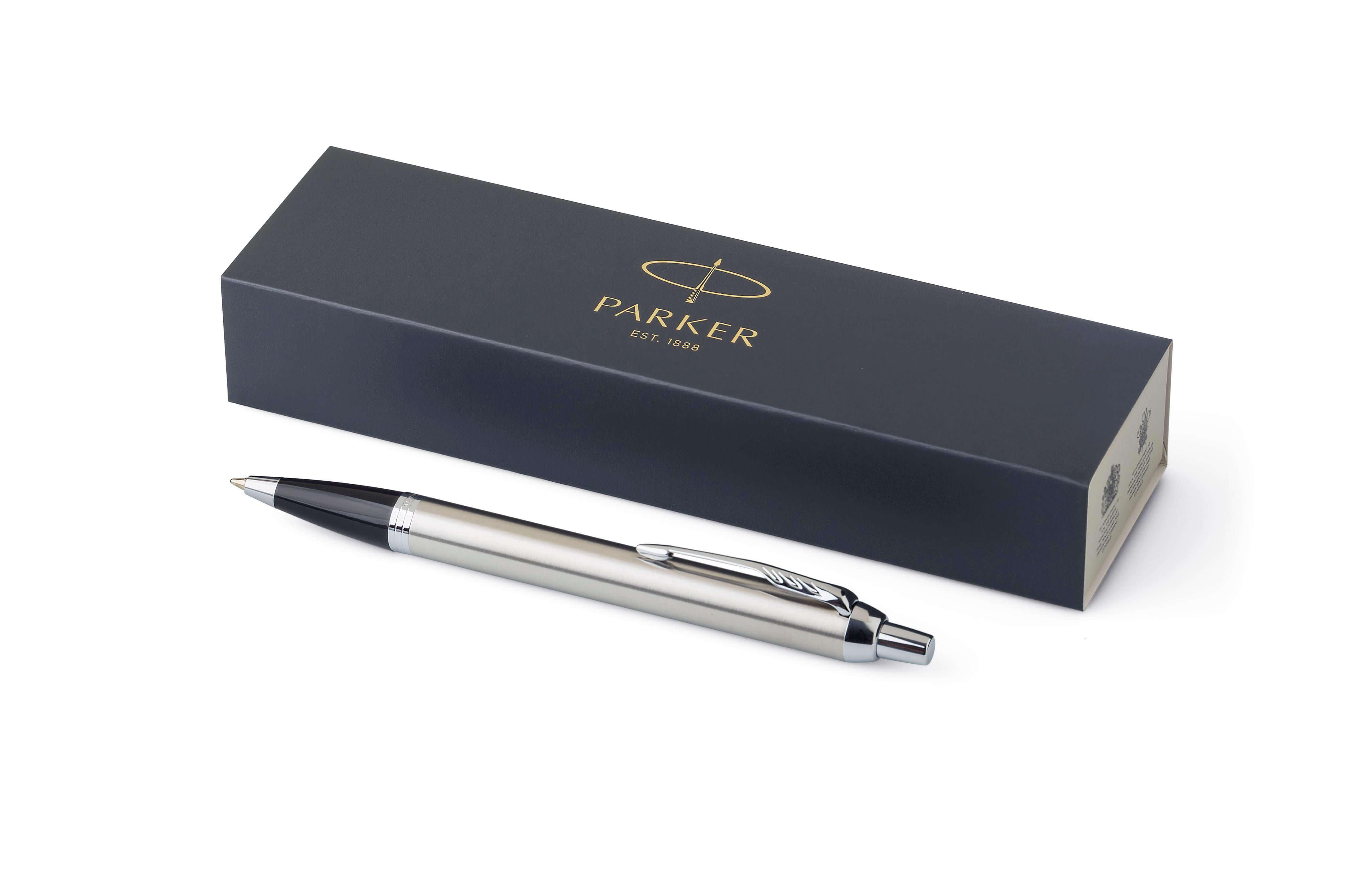 Esferográfica rollerball Parker IM em latão e cromo. Tinta azul. Apresentada em caixa de oferta.