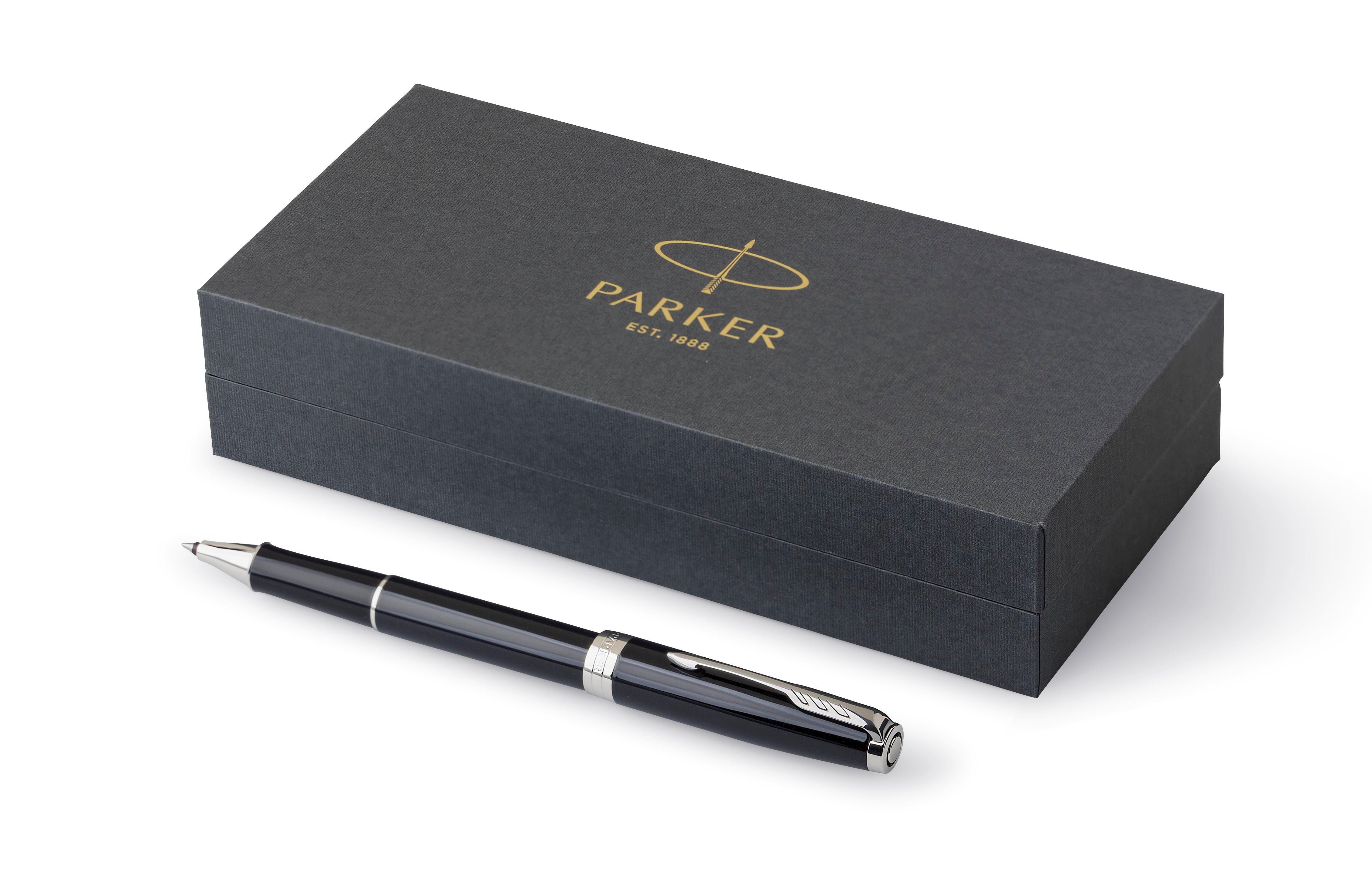 Esferográfica Parker Sonnet® em aço inoxidável e latão lacado com tampa. Tinta preta. Apresentado em caixa de oferta