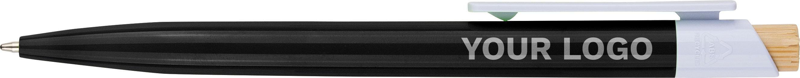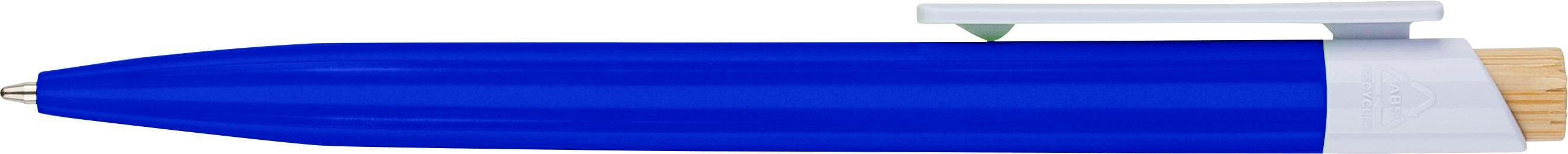 Esferográfica em ABS reciclado com botão de pressão em bambu e clipe branco. Apresenta um logótipo reciclado no molde. Comprimento aproximado de escrita de 600 metros. Tinta azul.